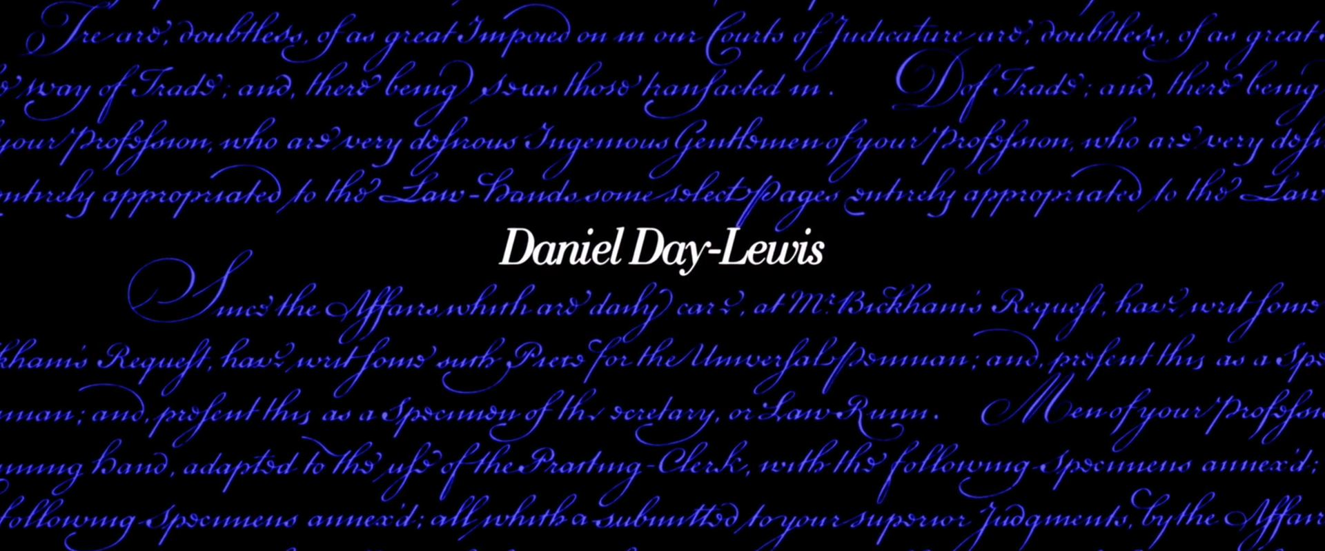 The titles were designed by Elaine and Saul Bass. They are set in tightly spaced italics from Bauer Bodoni. The calligraphy in the background appears to be from George Bickham, or at least it’s similar in style, compare the digital Bickham Script which is based on his work. Read more about the sequence on Art of the Title.