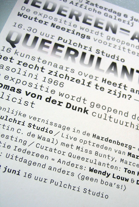 Queerulanten / Iedereen = Anders Contributed by Indra Kupferschmid on Feb 23rd, 2013. Artwork published in 2009. Source: www.boldmonday.com Bold Monday. License: All Rights Reserved. Source: www.boldmonday.com Bold Monday. License: All Rights Reserved. Source: www.boldmonday.com Bold Monday. License: All Rights Reserved. Typefaces More about NittiGet Nitti Formats Posters/Flyers (5701) Topics Graphic Design (2992) Activism (1104) Art (4638) Designers/Agencies Dennis Koot (2) Ton Hoogerwerf (2) Tagged withposters (1401)students (134)homosexuality (29)activism (40)sexuality (71)gay (38) Artwork location Netherlands (1079) Den Haag (126) In Setscool (Karo Konieczna) (871)pf (Karo Konieczna) (61) Post a comment Name Email – will not be published Website Your response Submit Comment More Nitti in use Tierra Ignotac. 2024RelajaelcocoContributed by relajaelcoco Sinagoga IdentityAljaž VindišMatej KorenContributed by Indra Kupferschmid display.xxx website2020DisplayContributed by Andrea Bergamini Sponsor More in Activism “Things are changing.” campaignc. 1965unknownContributed by Stephen Coles Lampedusa: Gli occhi del turista2017Lorenzo BallariniContributed by Alfredo Marco Pradil John Berger quotes2017Protest StencilContributed by Florian Hardwig Clinton Young Foundation website2023Icarus LabsContributed by Production Type More in Posters/Flyers Goldsmiths, University of London2015OnlySpyNumikoContributed by Richard Baird Staff Pick “Expect the Unexpected توقع اللامتوقع” posterc. 2021Malak MohammedContributed by 29LT Type Design Company 5Berge Poster Series2013David GobberContributed by Florian Hardwig Staff Pick Ninjaplast2015Kurppa HoskContributed by Love Lagerkvist More Fonts In Use Changer la mode pour le climat 20152015Maison SolideContributed by Quentin Schmerber Staff Pick Heimatdesign Vol. 17, 2019, “NRW Fashion Edition”2019Ten Ten TeamContributed by Ten Ten Team Staff Pick La La Land movie posters2016LA (Lindeman & Associates)Contributed by Peiran Tan Staff Pick Sly & The Family Stone – A Whole New Thing album art1967unknownTeresa AlfieriContributed by Reybach C Staff Pick