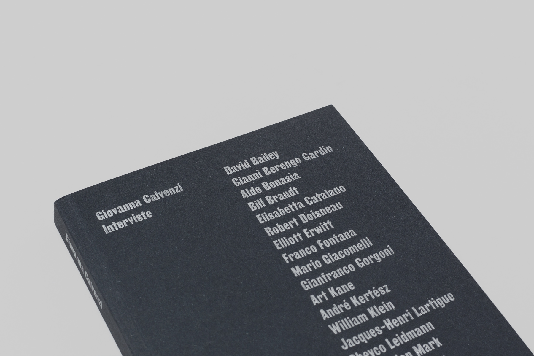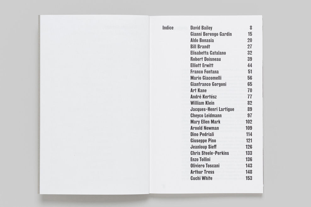 The whole book plays on the value of the masters interviewed and their names, enhancing it with a peremptory and expressive typography set in Girott (designed by Radim Peško). Body text uses Suisse Works.The masters interviewed include Erwitt, Kertész, Giacomelli, Klein, Lartigue, Sieff, Toscani, Doisneau, Berengo Gardin among many others. Book design by Tomo Tomo, published by Postcart.