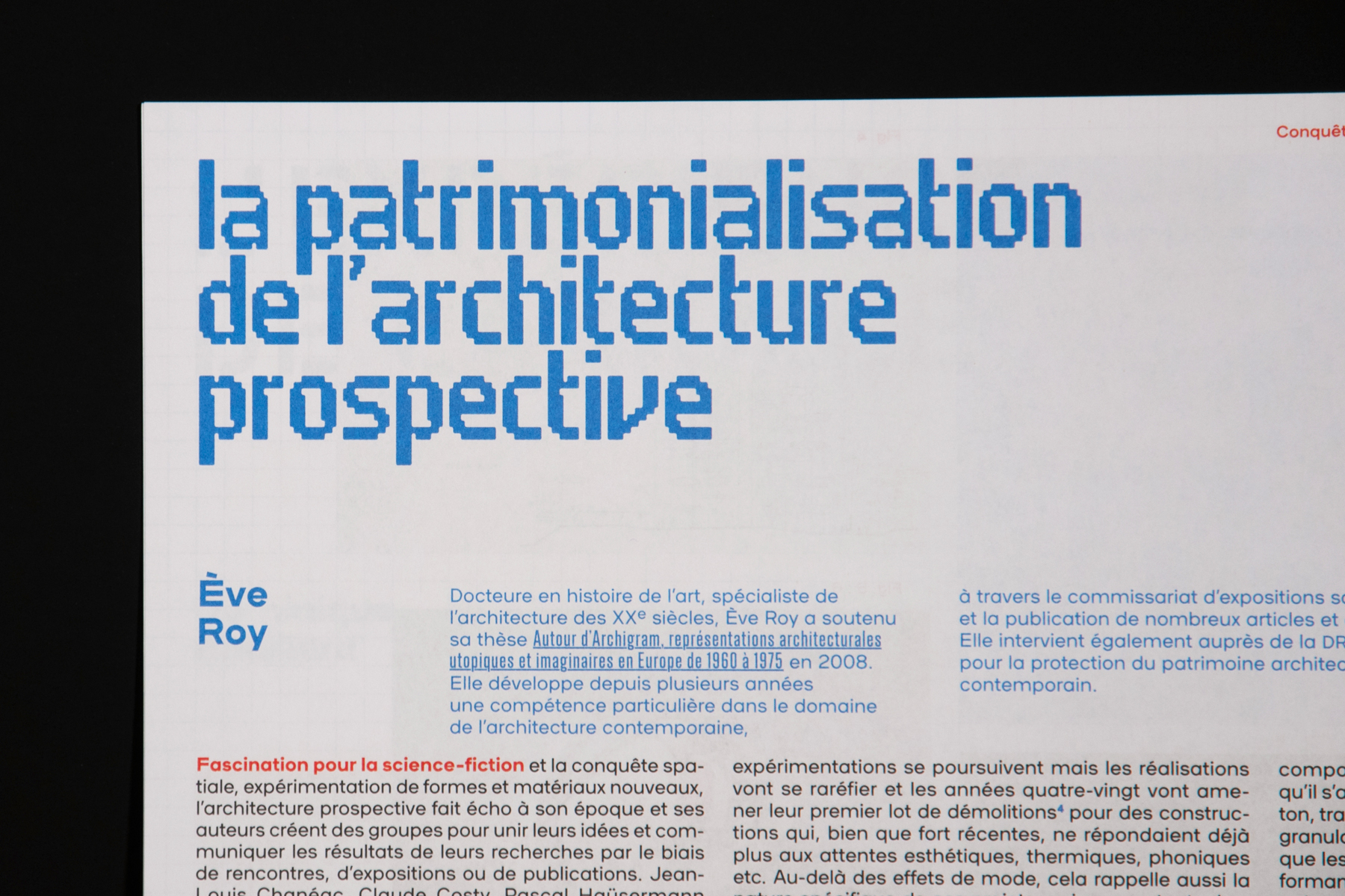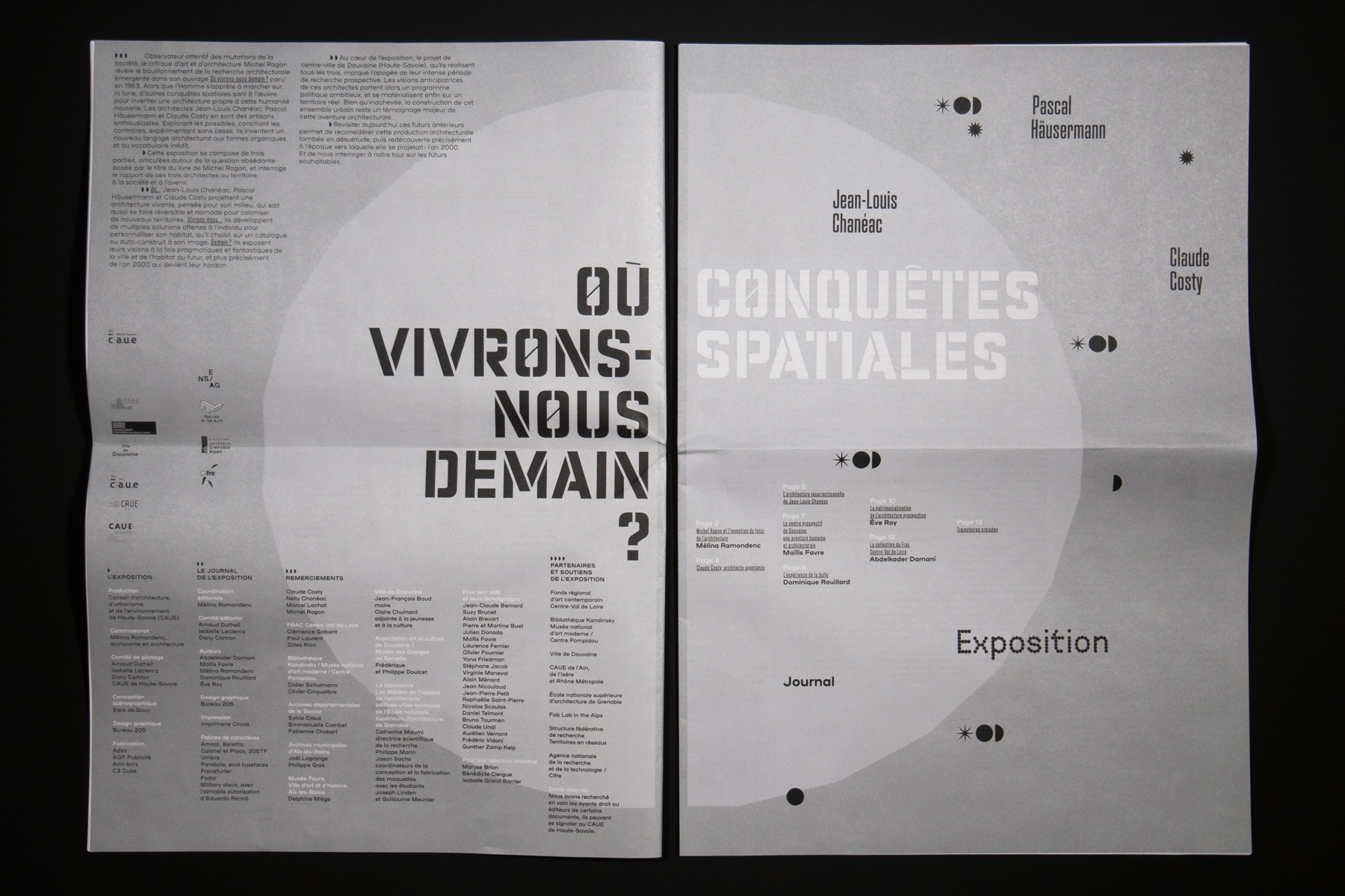 This newspaper was designed by Bureau 205 for the exhibition Conquêtes spatiales. Où vivrons-nous demain ? (“Space Conquests. Where will we live tomorrow?”). The principles of the newspaper are in coherence with the project of the exhibition: the use of a distinct frame evoking the technical universe of the architects, a profuse typographical language which refers to the prospective and experimental approaches of architects and the use of primary and metallic colors.