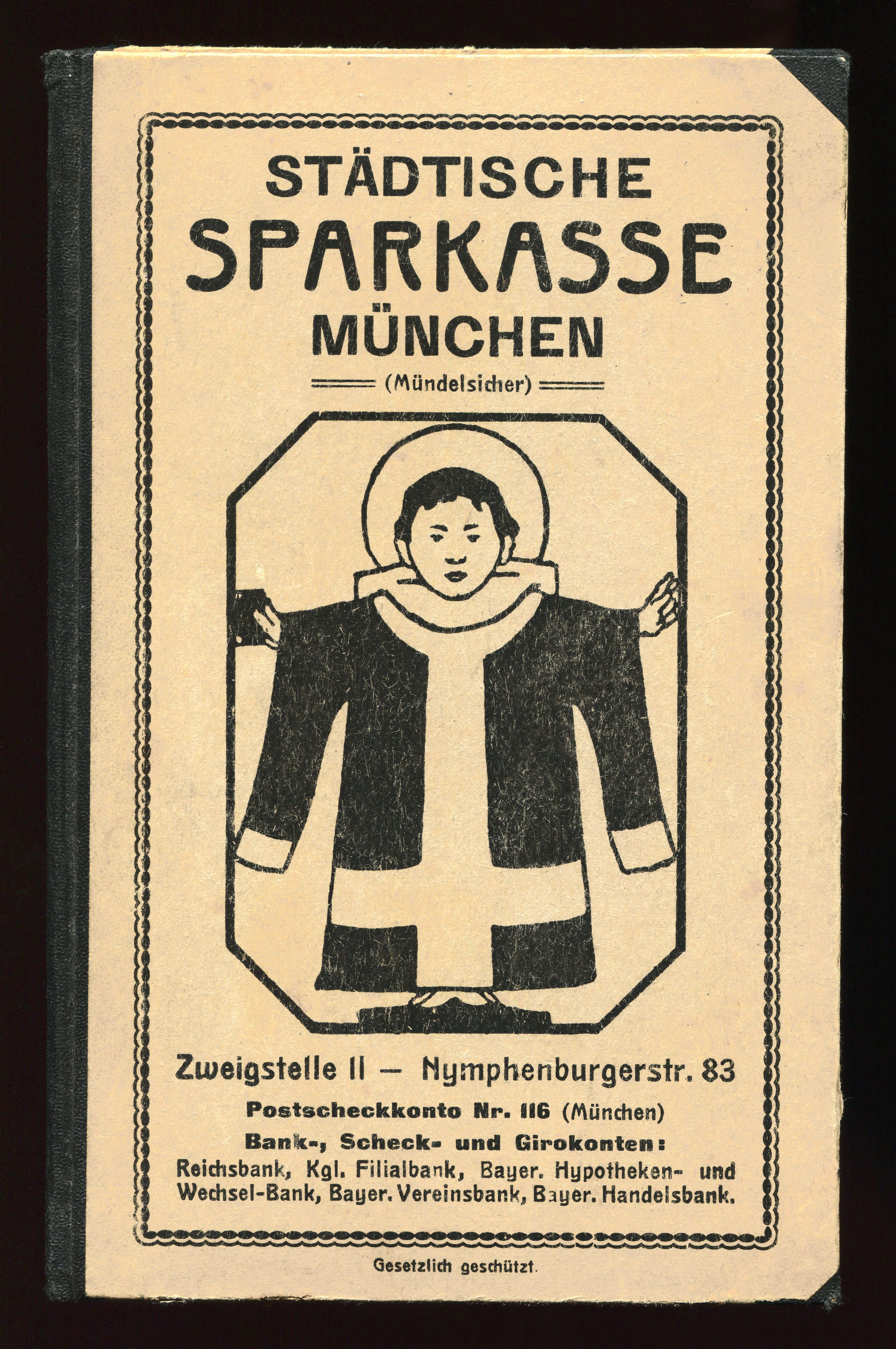 Cover of a savings account passbook issued in 1910 by the Städtische Sparkasse München (“Municipal Savings Bank Munich”), today known as Stadtsparkasse München. The monk-like figure is the Münchner Kindl (“Munich child”) from the city’s coat of arms.