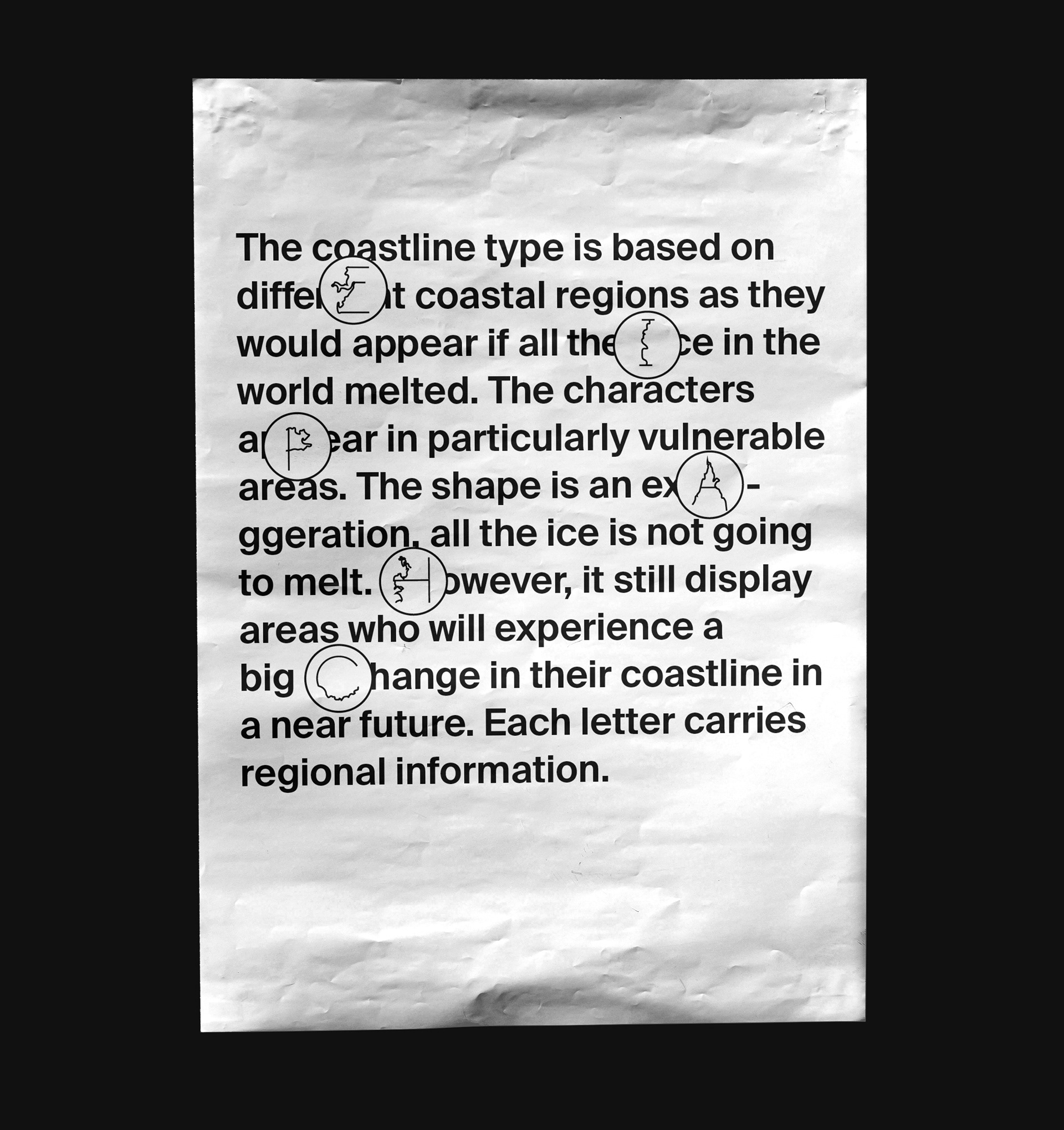 The project aims at finding innovative ways to present the geographical impact of climate change. The idea was born out of the sense that climate change is somewhat abstract and difficult to address, both emotionally and informationally. The core of the project is a typeface based on future vulnerable coastal areas, the letters are shaped after the way the world would look like if all the world’s ice melted. The font is presented in an ABC book where each letter represents a specific area and a unique future. The letters organize the information and creates a natural way of presenting it. The project is also available in the form of a web page and a big world map.
