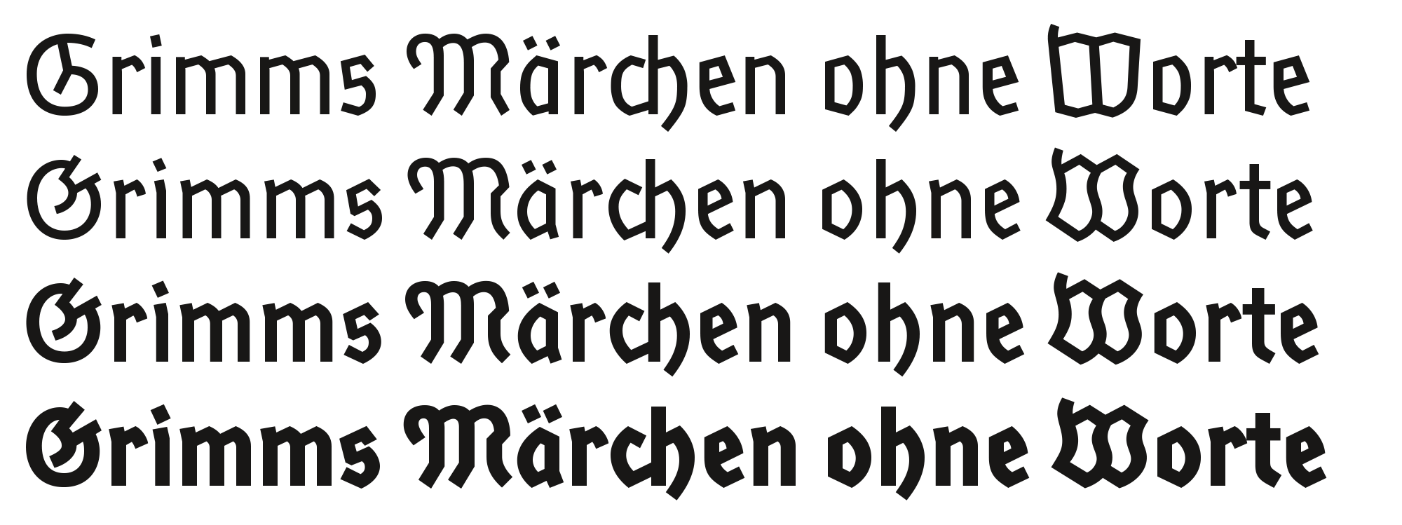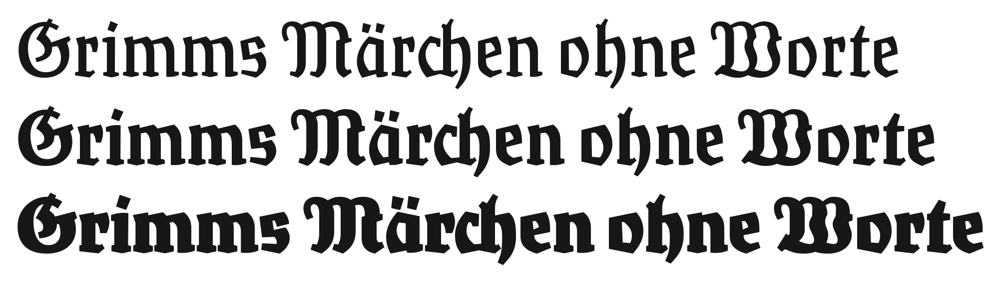 This modernized blackletter started out in 2006 as a graduation project at the Bauhaus-Universität Weimar. Georg Seifert tried to answer the question how Fraktur typefaces would have looked like today, if they hadn’t fallen out of fashion. In Georg’s hands, the old Teutonic letterforms had to undergo the same stylistic shifts and transformations as Roman typefaces did: less ornamentation, a simplified construction, and a drastically reduced contrast. The result is a “grotesque” monolinear blackletter, Rostrot, and its “seriffed” sister style with some contrast, RosenRot. The fonts were never officially published, but come bundled with Judith Schalansky’s book Fraktur Mon Amour.