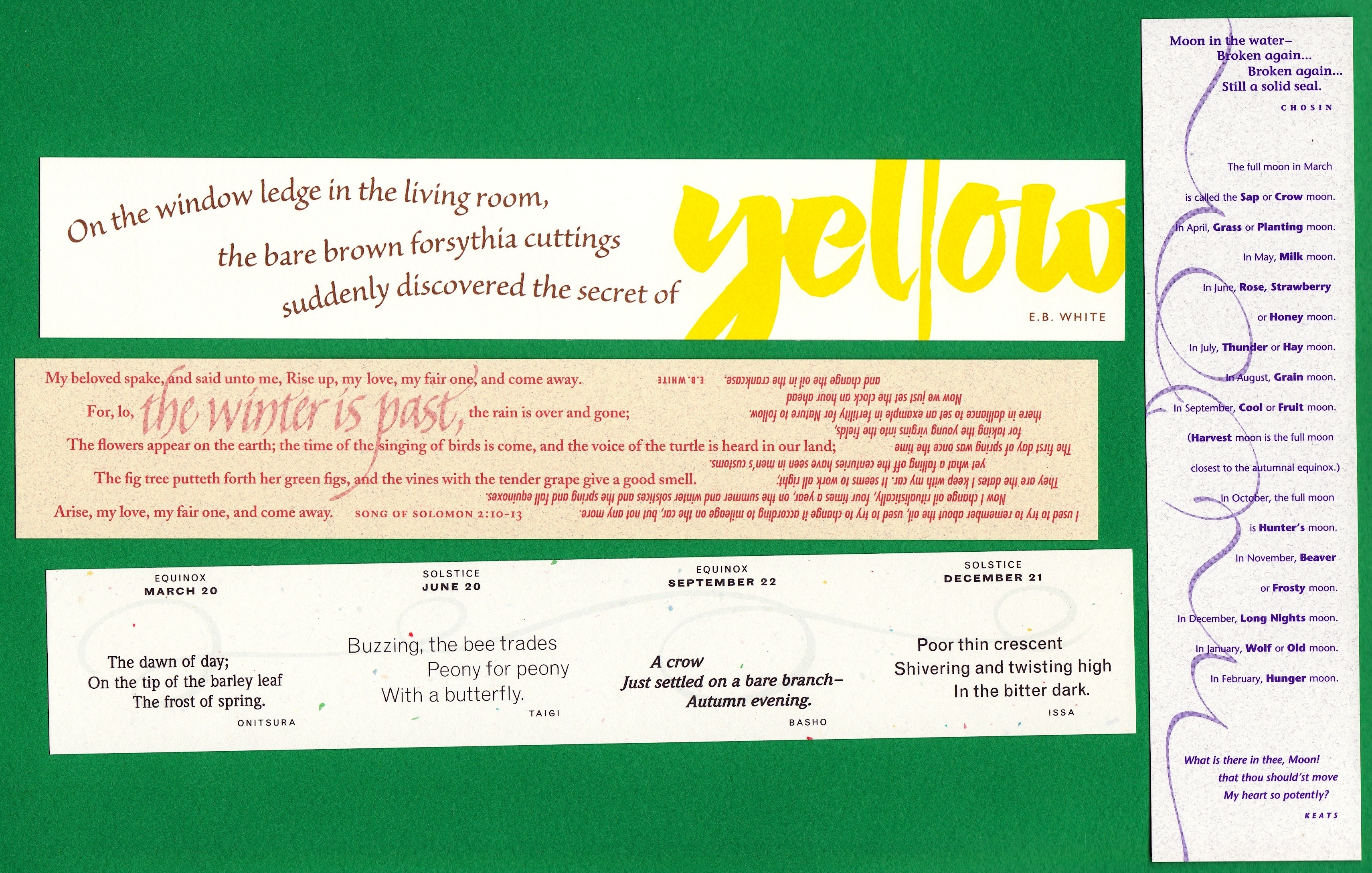 These are from a series of annual spring keepsakes I did in the 90s that combined type and hand-lettering. I still like them, though I think I’d make the brown type in the top design smaller now. My favorite is the one on the bottom w the 4 poems, because of the number 2000 I wrote in the background — hope you can see it.