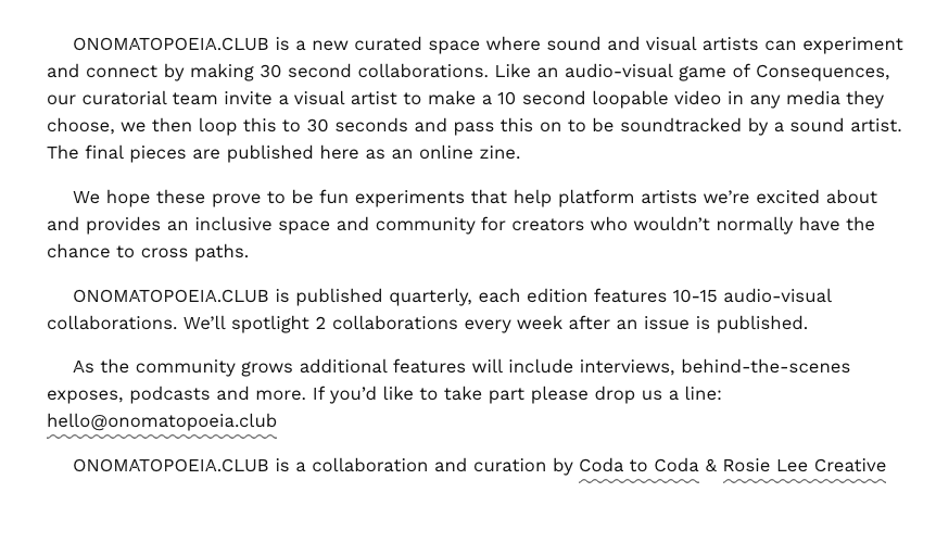 Onomatopoeia.club is a collaboration between Coda to Coda & Rosie Lee Creative. The website was designed by NOI.