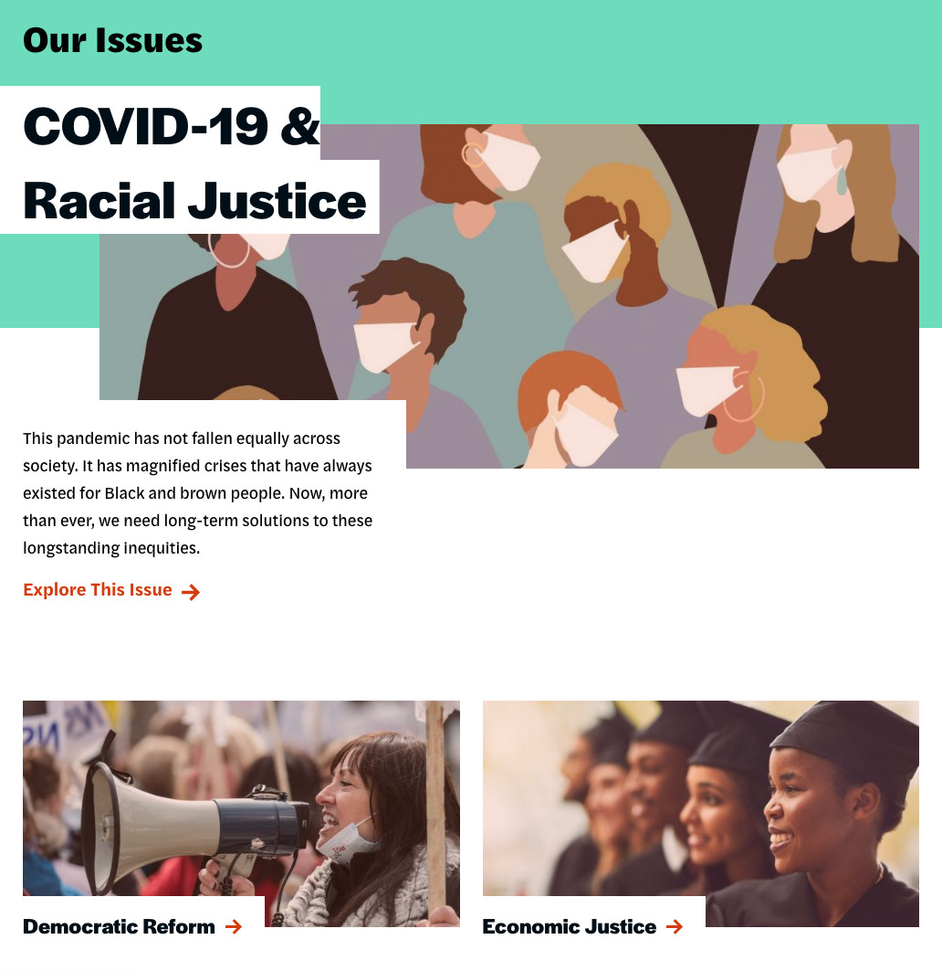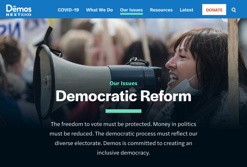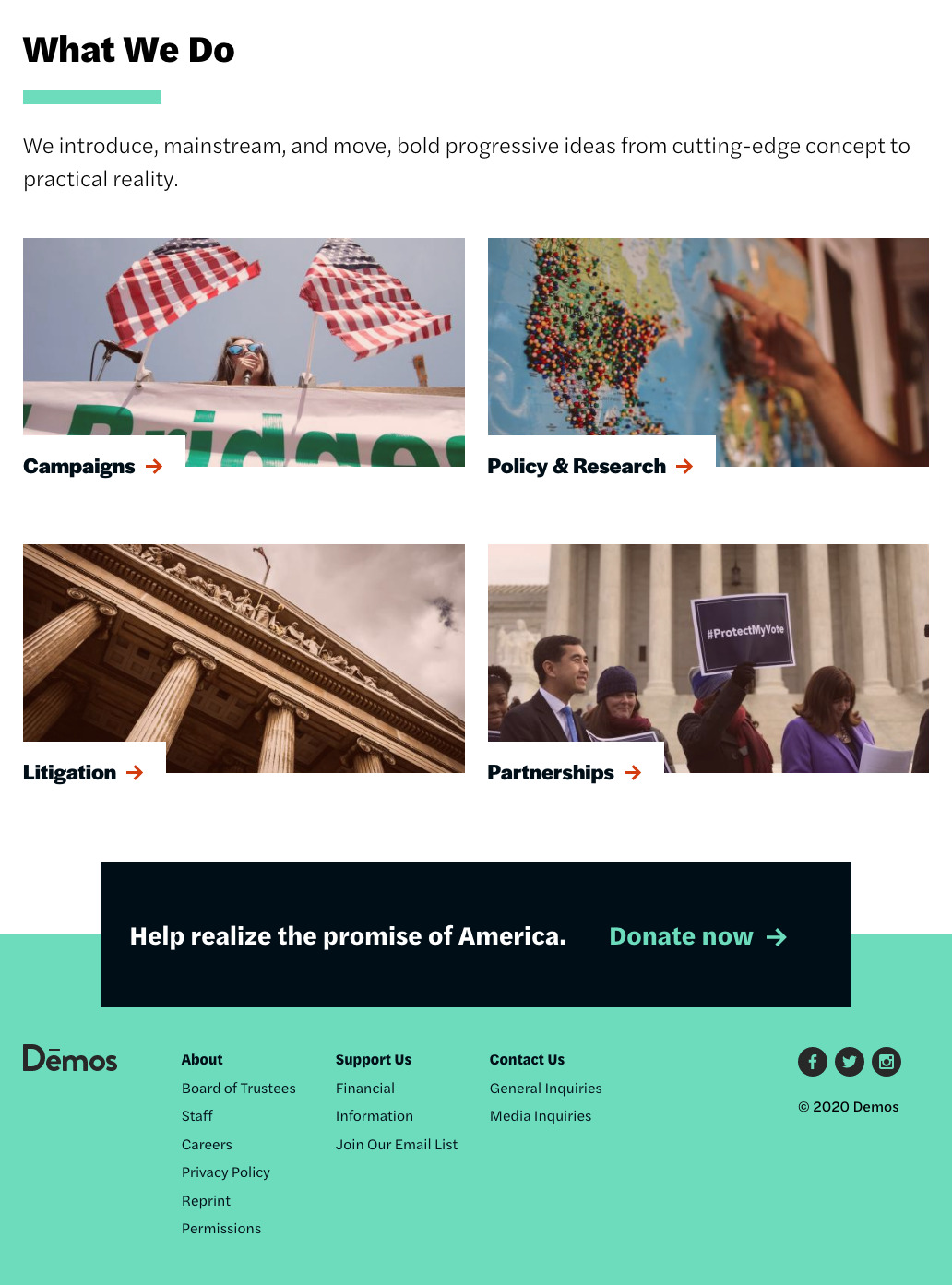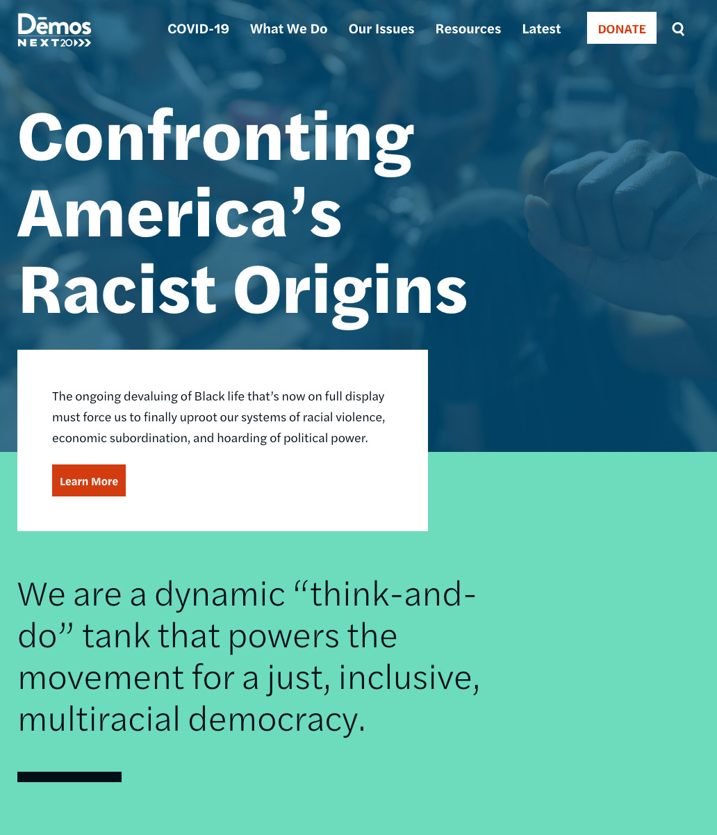 Founded in 2000, Dēmos is a liberal NGO with the stated mission to “power the movement for a just, inclusive, multiracial democracy.” Their new website was designed by ThinkShout and launched in 2019. The Dēmos logo uses Brandon Grotesque.