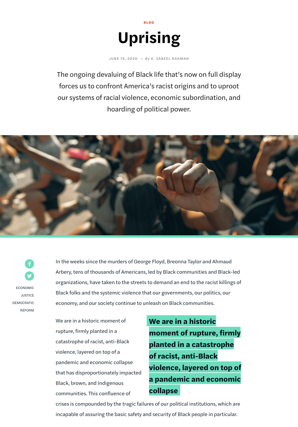 Darden Studio’s Halyard is the typeface for Demos.org. The website uses various styles of the Halyard family, from two of its three optical sizes.