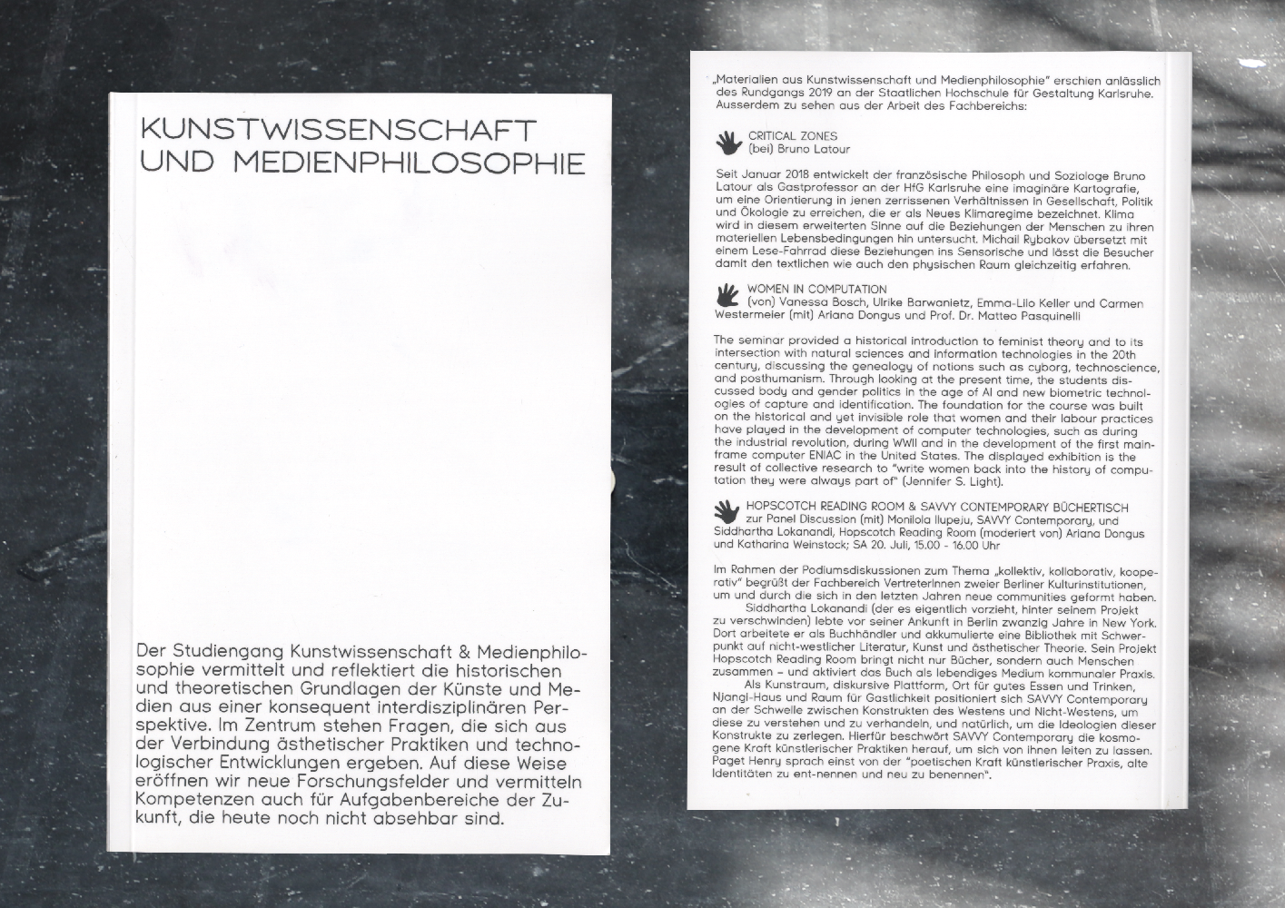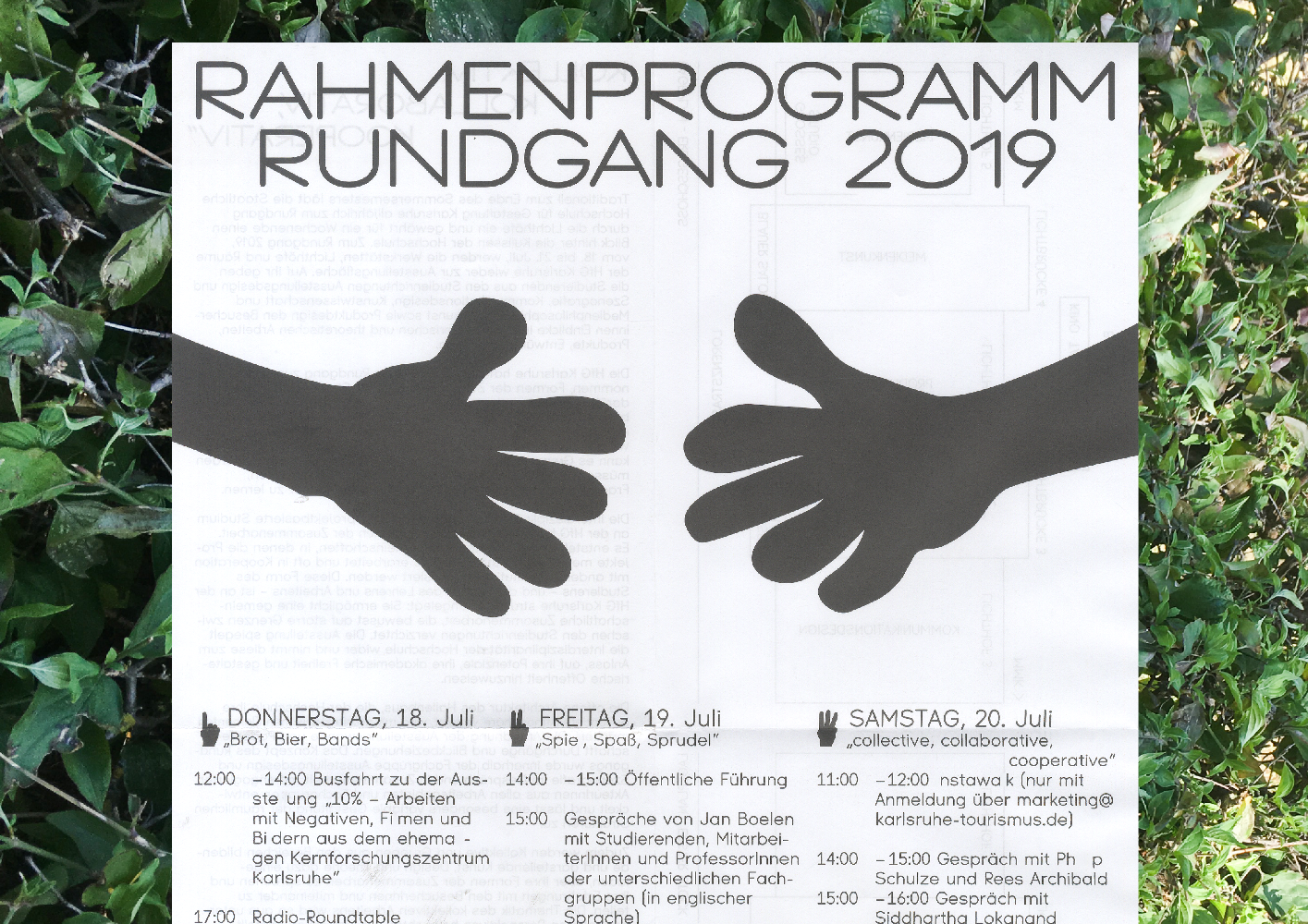 The design was conceived by by Johanna Schäfer, Bruno Jacoby and Moritz Appich. In line with the exhibition‘s theme – collaborative, collective, cooperative – the concept for the graphic identity focussed on showcasing students‘ works. Based on the motif of the holding, helping, displaying or directing hand as individual solutions for the different media used both as advertisement for and for orientation and guidance within the exhibition. For the exhibition posters the plexiglas-covered city-lights throughout the city were used as public exhibition spaces in their own right. A series of 11 posters show collaborative and interdisciplinary works from all departments. Visually connected by the hand-shaped displays, the posters thus functioned as 2-dimensional teasers to the actual event.