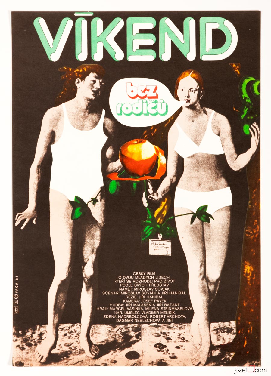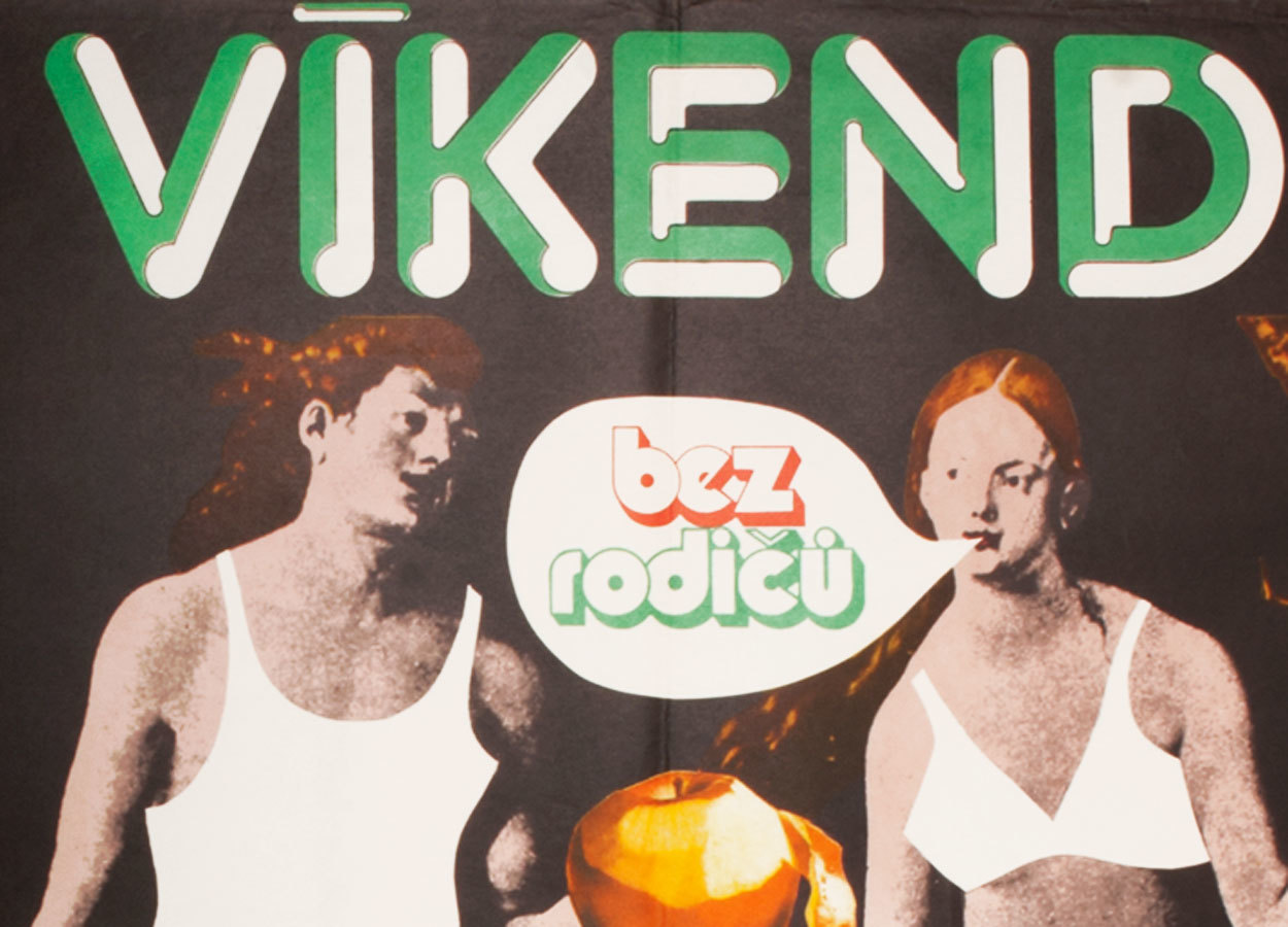 The image is borrowed from Albrecht Dürer’s Adam and Eve (1507), with added underwear (never trust a fig leaf) and an enlarged and partly peeled apple. Pluto is used in all caps, with partly colored letter parts to reinforce the dimensional look. The acute accent in “víkend” is just a thin flat line, as it was commonly done with DIY diacritics on Czechoslovak posters and beyond. I don’t know if the extrabold shaded letters in the speech balloon are from a typeface or custom drawn. Black Body is close, but no cigar.