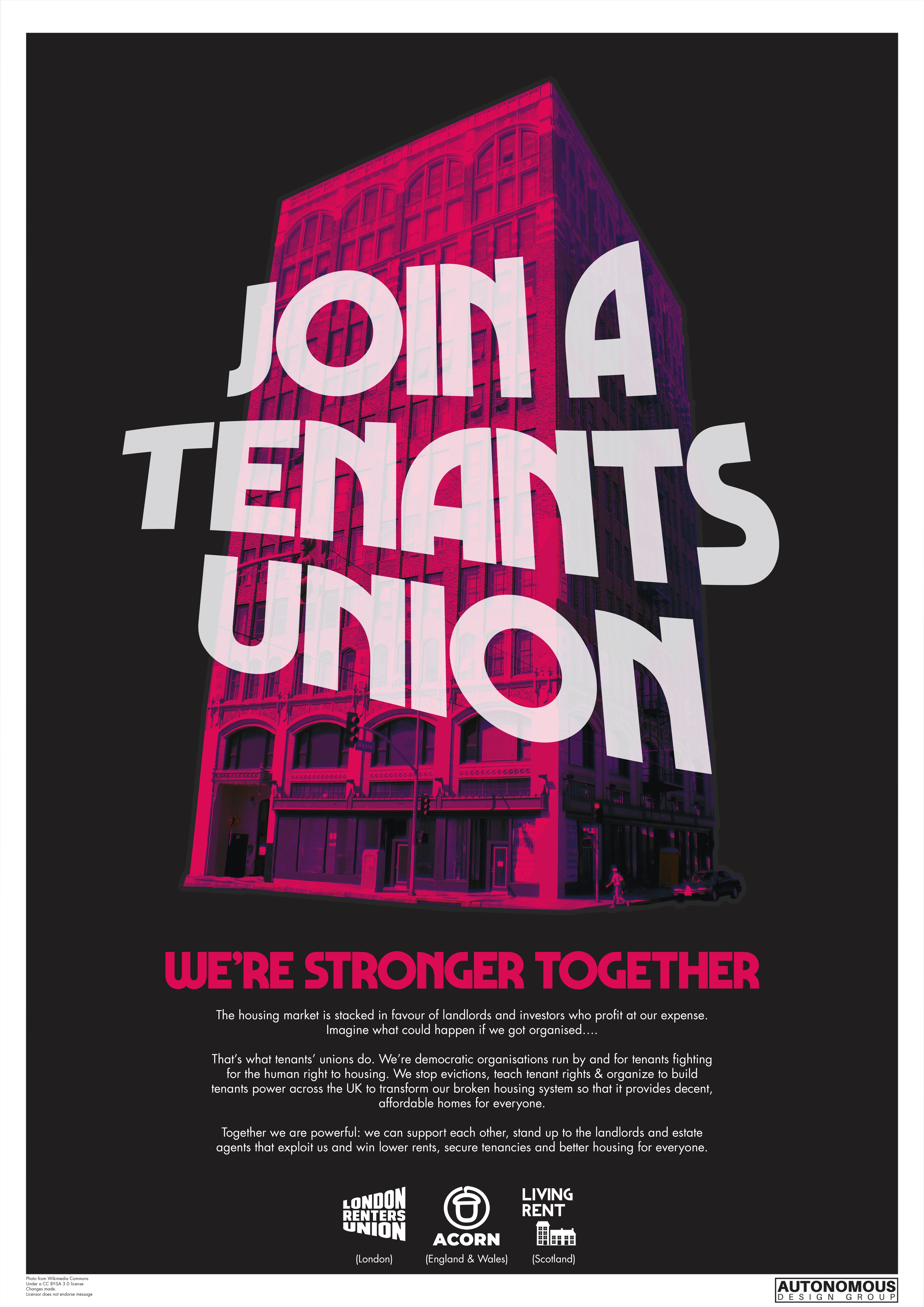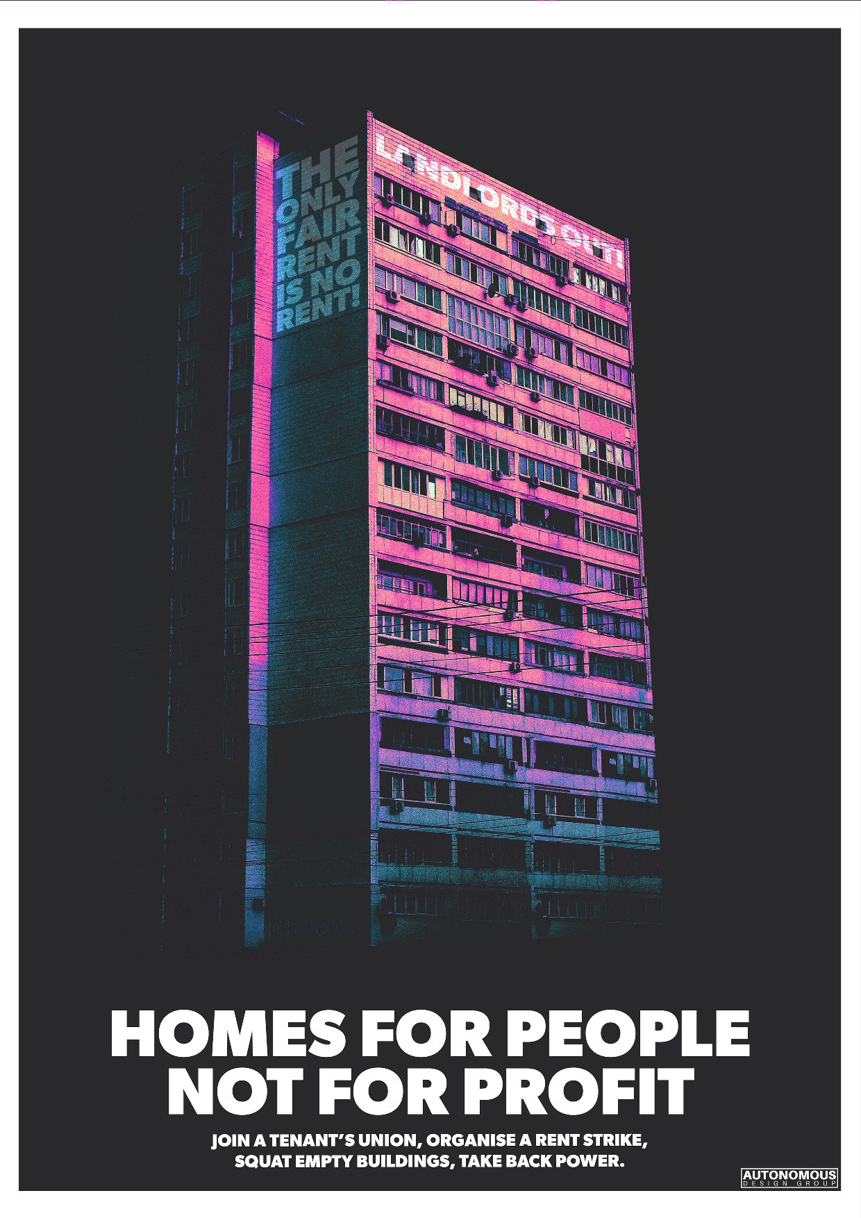 Autonomous Design Group is an independent collective of designers, artists and creatives opposed to capitalism and authoritarianism. We maintain that the aesthetic is of vital importance in the terrain of political struggle. We aim to offer artistic support to a wide range of groups and movements and encourage everyone to contact us for designs. All our designs are open-source and editable.