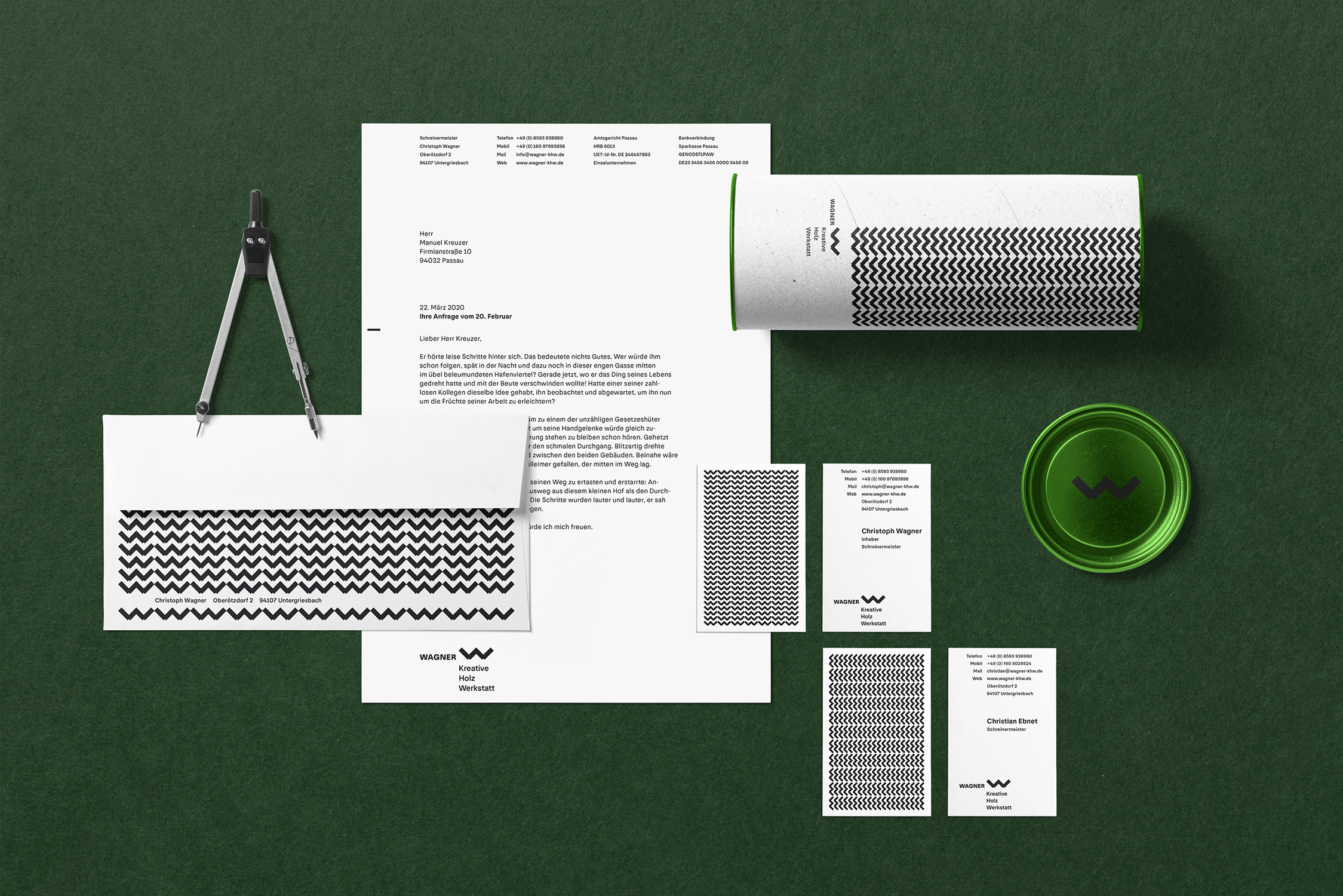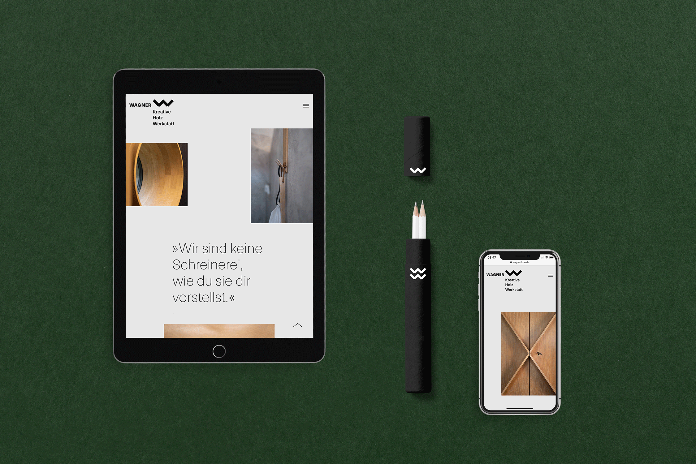 Visual identity for the Wagner joinery from Oberötzdorf near Passau in Lower Bavaria. Christoph Wanger and his team are carpenters with body and soul. Their work is reduced. Straight. Attention to detail. Their work is inspired by the formal language and functionality of modern architecture. This should also be reflected in branding, photos and on their website.