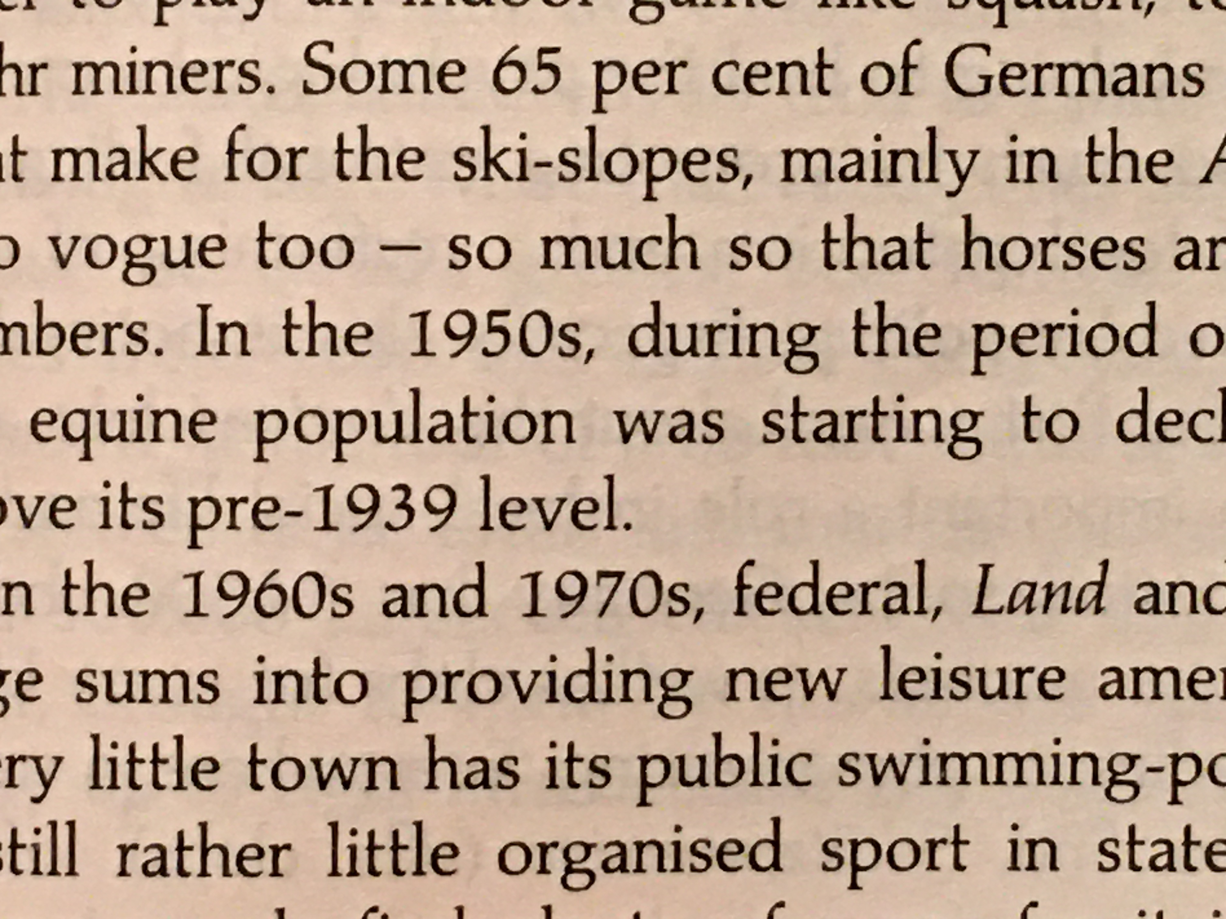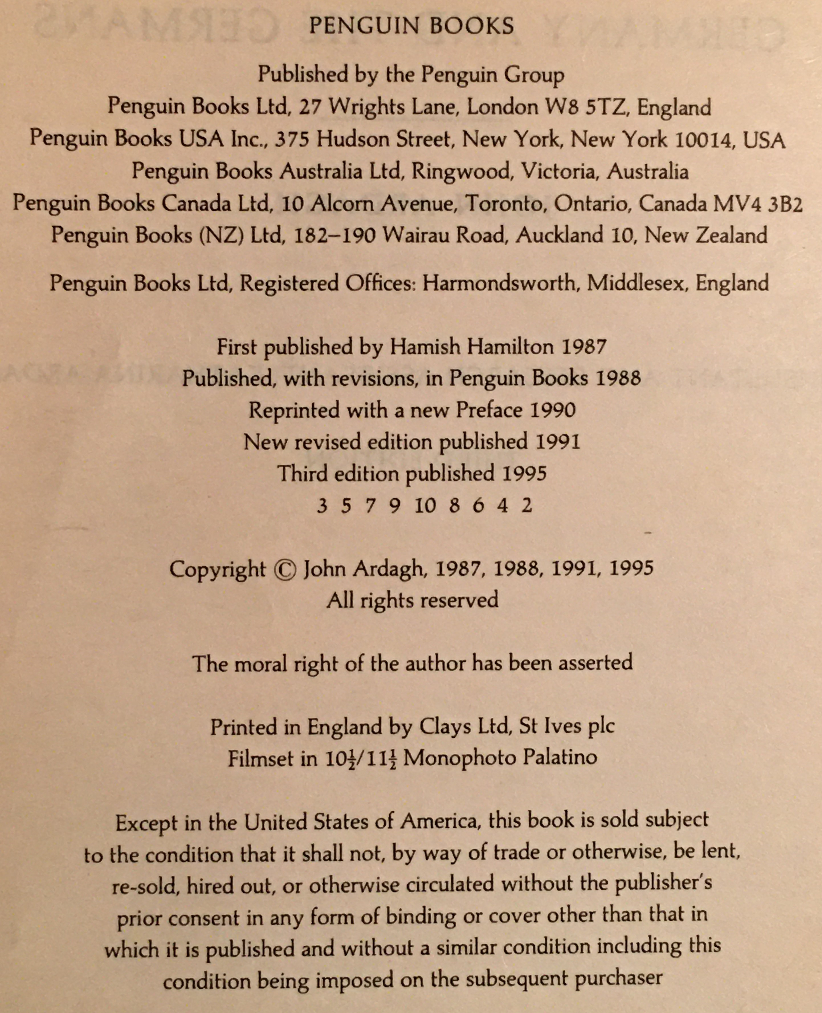 I own both editions (read the second in my school library while studying German; picked up the first as a time capsule) and have finally found them to comment on this. Both are in Palatino but there is no similarity in the impression. The first edition (1987, revised 88) has a much heavier impression and almost no leading. The second shown here is much lighter, with very long extenders. It indeed looks totally unlike familiar versions of Palatino, almost like a light weight. It’s really striking. (First edition filmset by Phoenix Photosetting, Chatham, Palatino is credited but not a source for it. My second edition is identical to Mr. Butler’s, lighter if anything.) Neither is the original version with no foot serifs on pq (which is itself quite fascinating, more organic and almost like a serif version of Optima.)