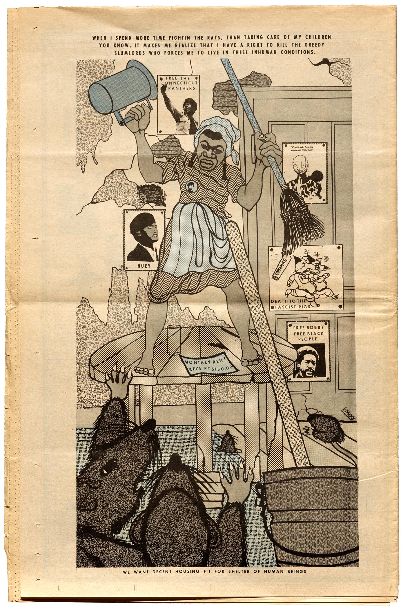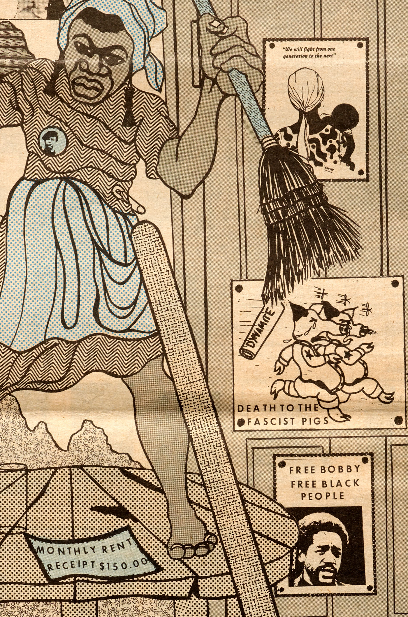 For his back-page posters, Douglas often took advantage of the one-letter-at-a-time flexibility of transfer type. He broke free of traditional grids and alignments and often set the type on curves and angles to fit within the illustration. In my favorite examples of his graphical typesetting, Douglas uses the cut-out letters within the scene of the artwork itself, such as in the protest buttons worn by his hero characters, or the iconic “ALL POWER TO THE PEOPLE” newspaper of March 9, 1969 (top), or the “RENT RECEIPT” of July 25, 1970 (below).