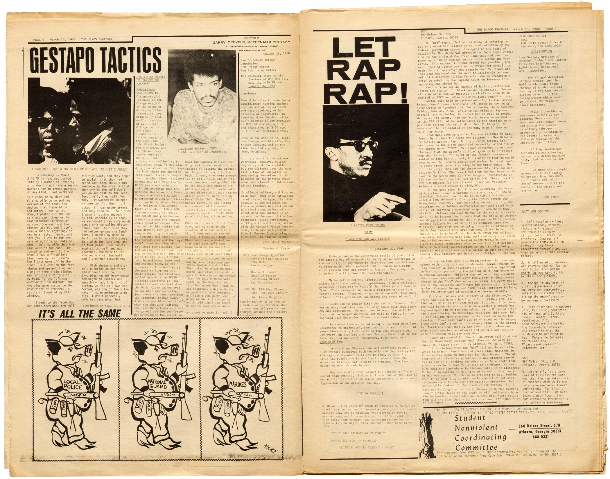 March 16, 1968, with headlines in Haas Inserat-Grotesk / Neue Aurora VIII, Venus Extended, and Grotesque No. 9 Italic, and text set on an IBM Selectric in Prestige. “Student Nonviolent Coordinating Committee” in the bottom right corner shows Lydian Italic and Futura Condensed.