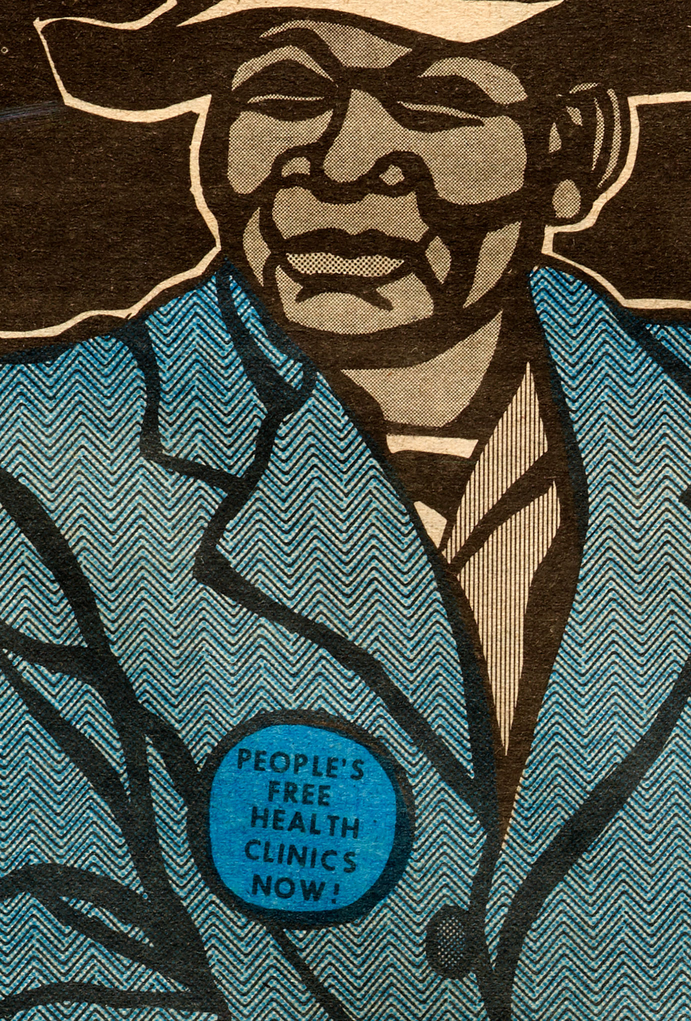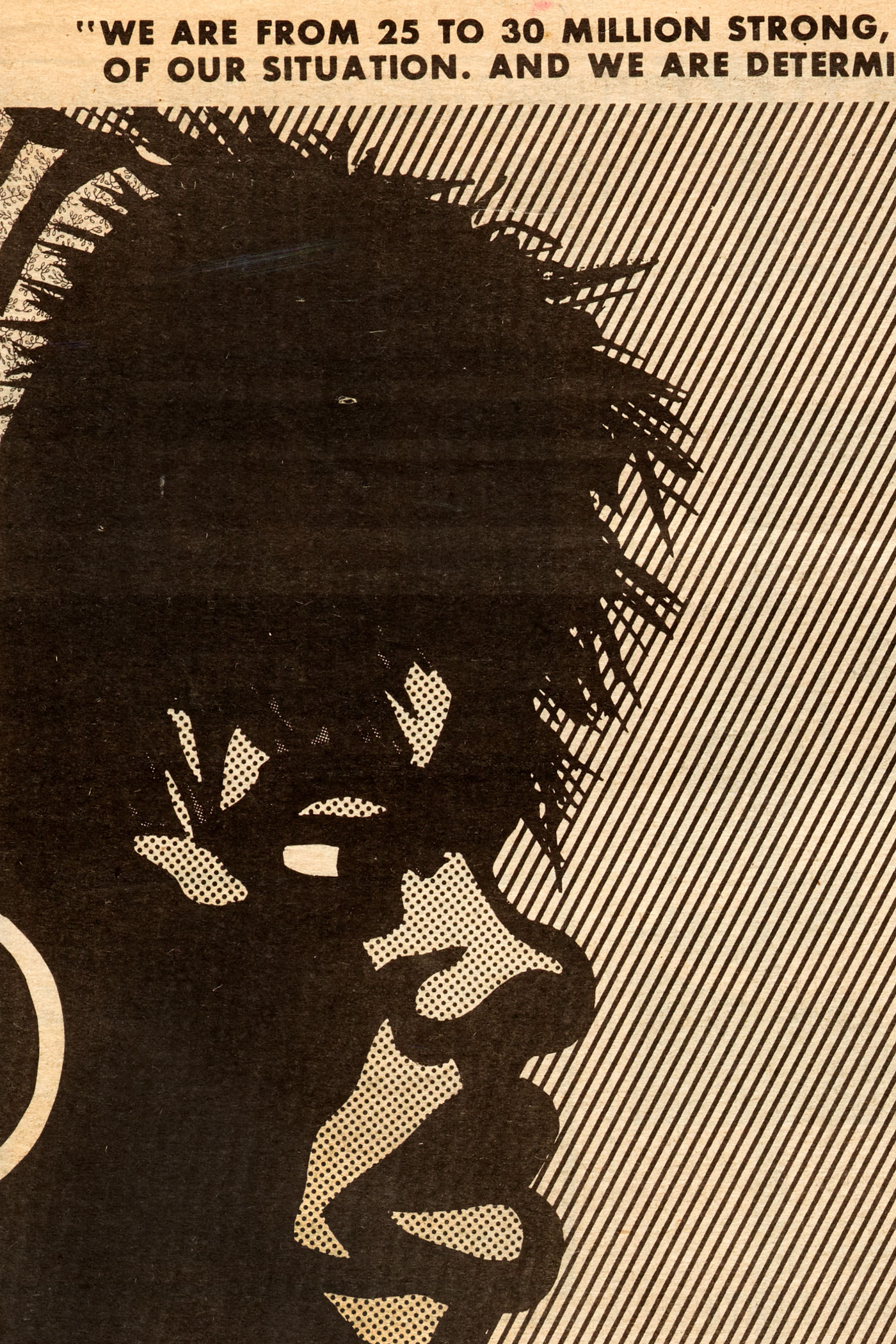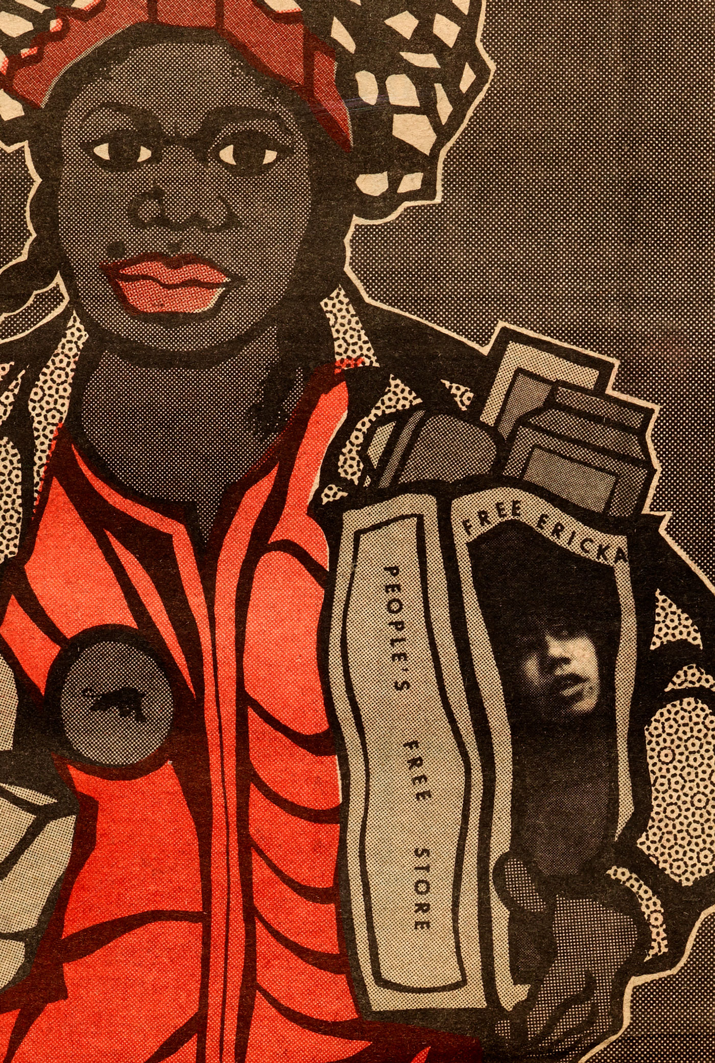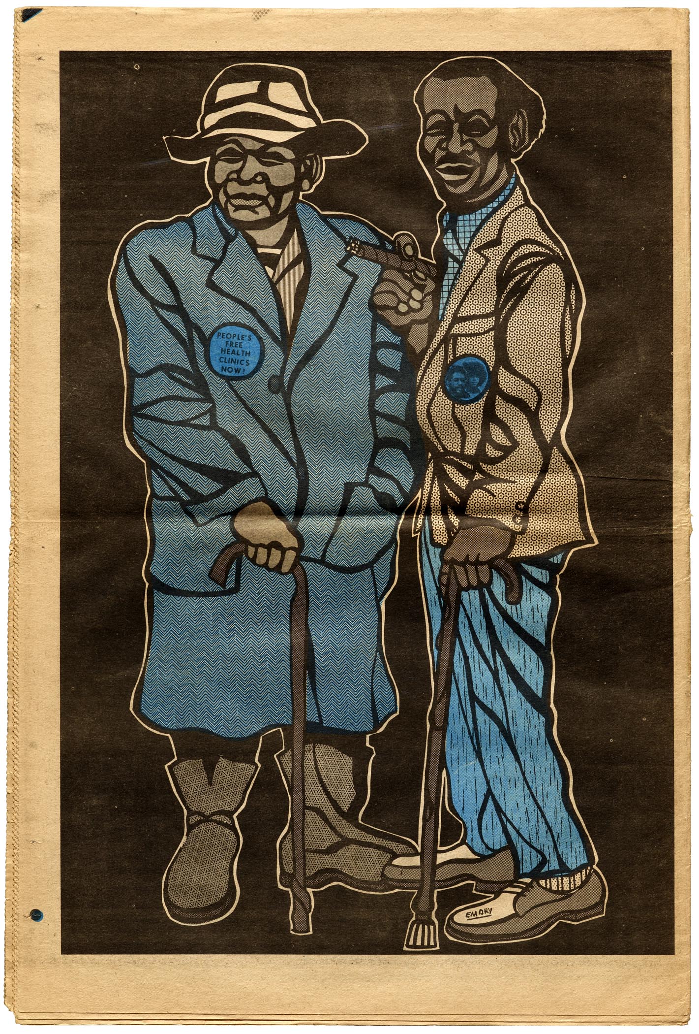 The limitations of the production setup yielded results that came to define the visual style of the paper, especially as Douglas gained experience with each week’s issue. The thick marker lines of his woodcut-inspired drawings were not only graphically appealing, they also masked the imperfect registration of the newspaper press.