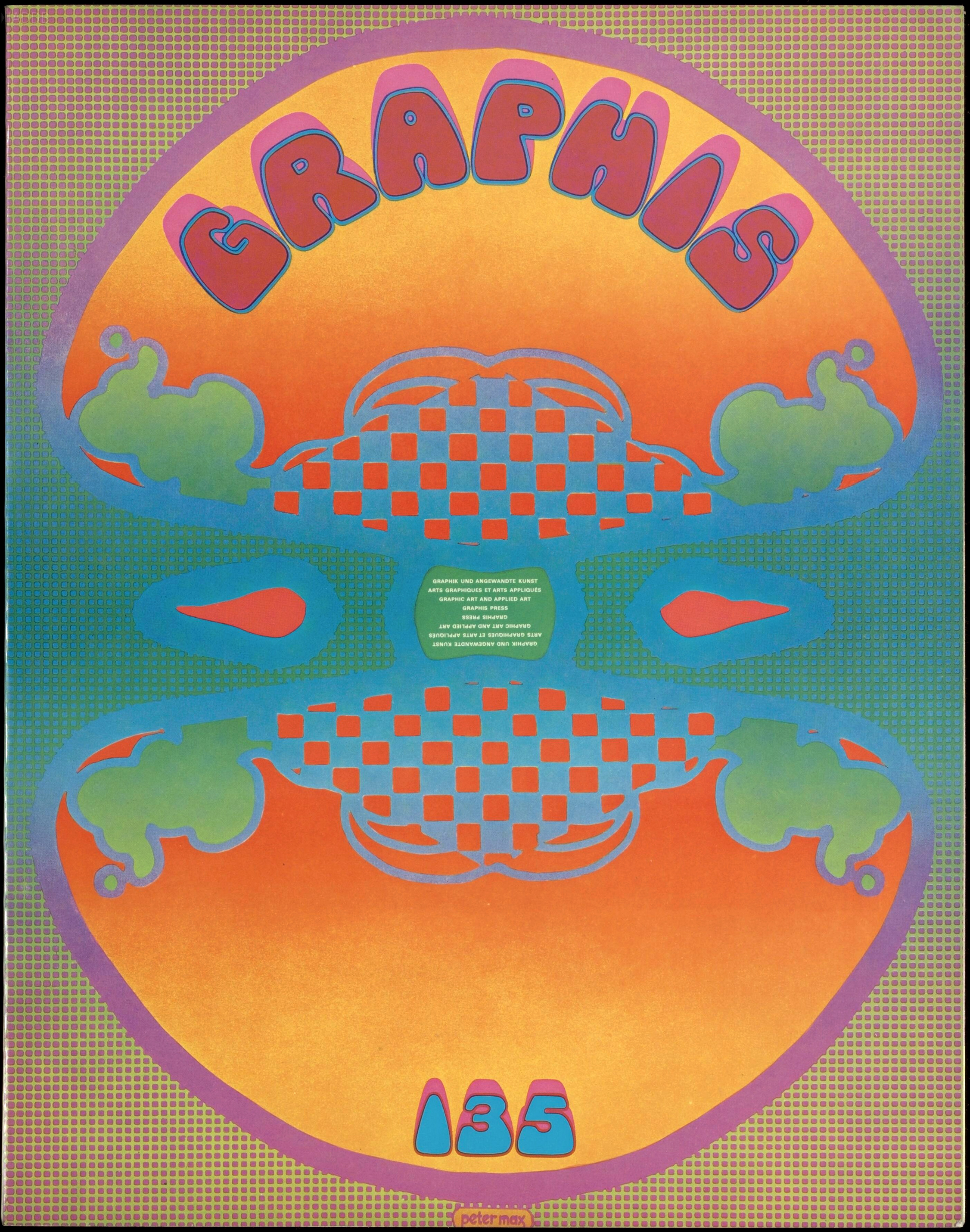 When I prepared the entry about Bill Howell’s Pamoja Gallery poster, I wondered why the dimensional caps from Obese arranged on a curve looked so familiar. Now I remembered where I had seen this before – Peter Max used a very similar setting in his cover design for issue 135 of Graphis magazine, published in Zurich in January 1968. Here’s how Graphis introduced their cover artist: