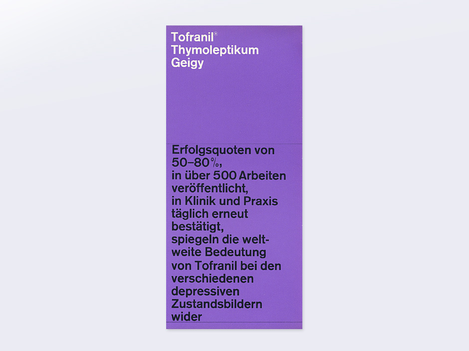 Tofranil, Geigy Contributed by Tânia Raposo on Mar 30th, 2013. Artwork published in 1960. Source: www.thisisdisplay.org License: All Rights Reserved. Typefaces More about Akzidenz-GroteskGet Akzidenz-Grotesk Formats Advertising (2147) Booklets/Pamphlets (2431) Topics Health/Fitness (902) Tagged withpharmaceuticals (44)one typeface (1763)one typeface, one size (415)purple/violet (362)Geigy (2) Artwork location Switzerland (1133) In SetsPrint Design (C. Redmon) (26)Typography (C. Redmon) (8)akzidenz-grotesk (Tucker McKillop) (7)1 (Rodrigo) (152) Post a comment Name Email – will not be published Website Your response Submit Comment More Akzidenz-Grotesk in use Yagow – The Mess LP2021Manuel WeselyDaniel Fuchsmm, mContributed by Manuel Wesely Staff Pick STRAND: Isa Genzken, Blinky Palermo, Sigmar Polke, Gerhard Richter, Thomas Schütte2020unknownContributed by Nathan Prost B4E – Business for the Environment2008ZebraContributed by Martin Maher Sponsor More in Health/Fitness Apteka neon sign, WarsawContributed by Florian Hardwig Starface2023Someone & OthersContributed by we.type fachhochschule potsdam UN Decade of healthy ageing2022unknownContributed by TypeType dr.blet2021Kwangmyung LimHyeonmo KimEuisung HwangContributed by kim hyunmo More in Booklets/Pamphlets Absolvent*innen 24/25 catalog, AdBK Nürnberg2025Elisabeth ThomaLucia SchmuckContributed by Elisabeth Thoma HKU Architecture Degree Show 20212021atelier avocadoAnthony LamContributed by Anthony Lam Staff Pick Gerrit Rietveld Academie brochure2025Rutger van AkenContributed by Rutger van Aken Theater Ansbach identity2020Studio CollectContributed by WELTKERN® Typefaces Staff Pick More Fonts In Use AA’s Guide to the Motorway (1959)1959Photo(s) by mikeyashworth on Flickr. Staff Pick Huy Fong sriracha hot sauce labelc. 1980Contributed by Nick Sherman Staff Pick Subo artisan bakery2024Andrej & AndrejContributed by AllCaps Staff Pick Seattle Met Beerbook2012André MoraContributed by André Mora Staff Pick