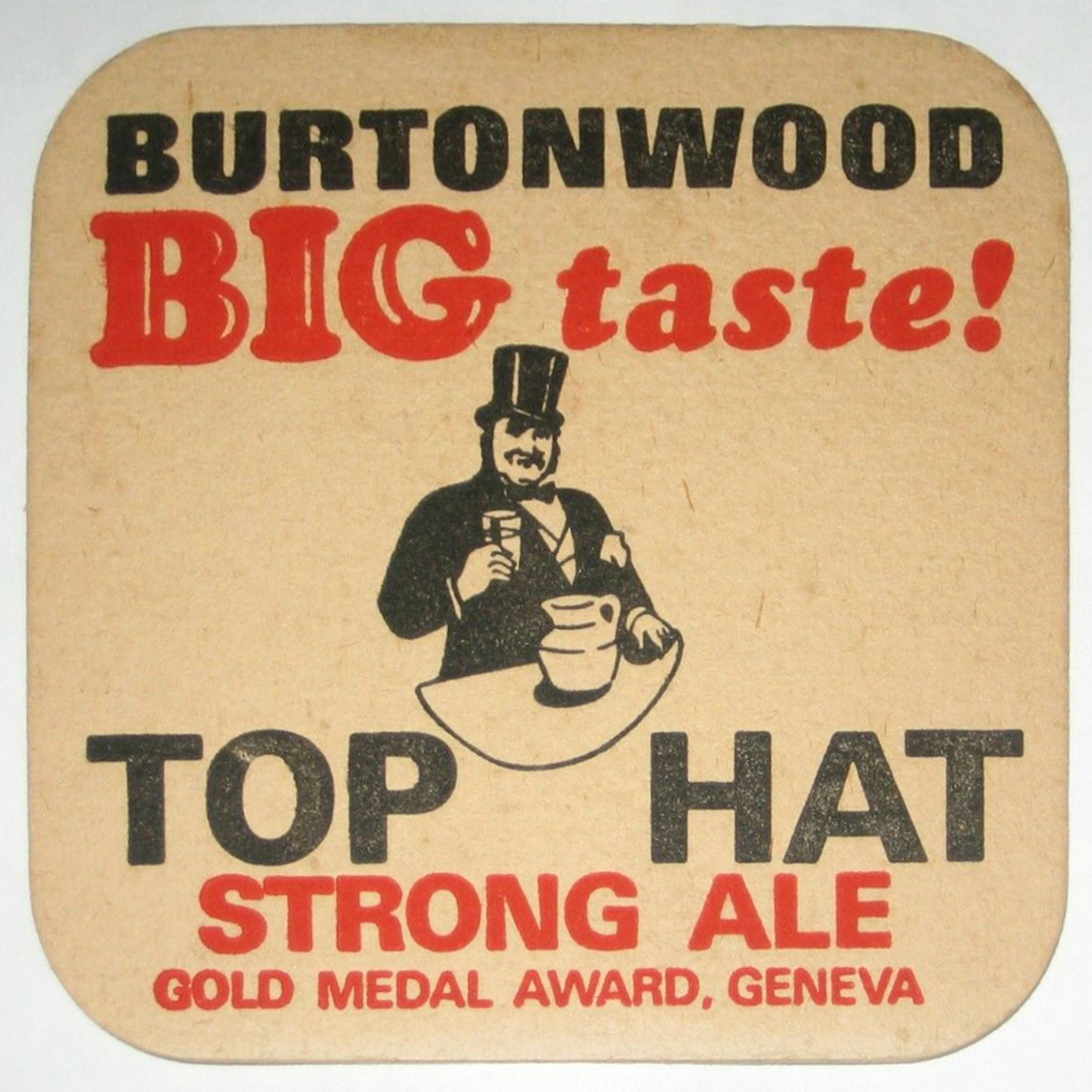 Various beermats by the Burtonwood Brewery in Burtonwood near Warrington, Cheshire, England, probably from around the late 1960s. Cooper Black Italic is paired with caps from the open Cooper Hilite. The big “BIG” in the first image is hand-drawn, see especially the counters in B or the flat serifs in I in comparison to the typeset versions in the images below. In two cases, the word “taste” features a double-storey a. It’s not a slanted roman, though. I’m not aware of a version of Cooper Black to include this form.