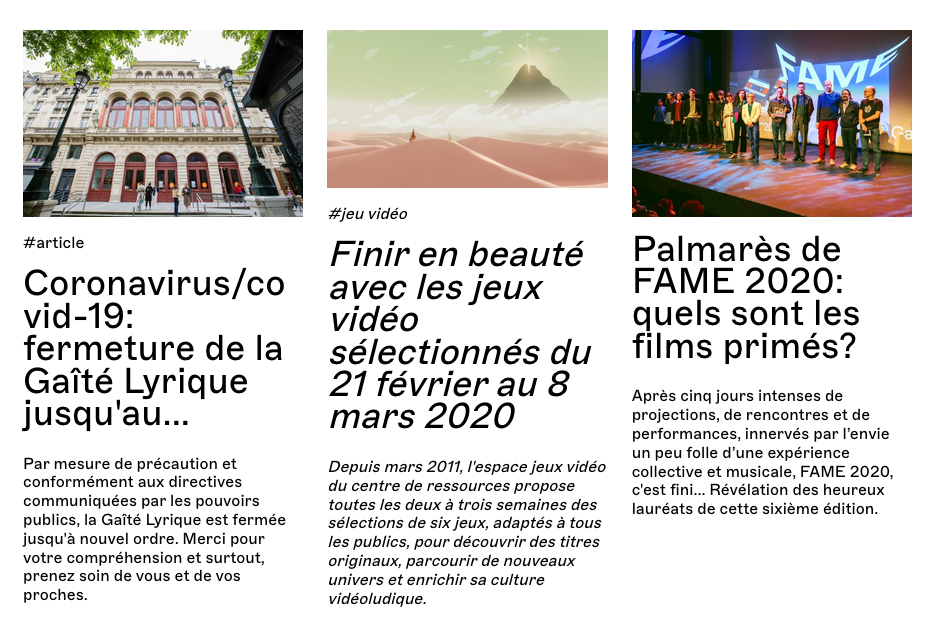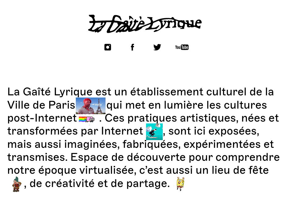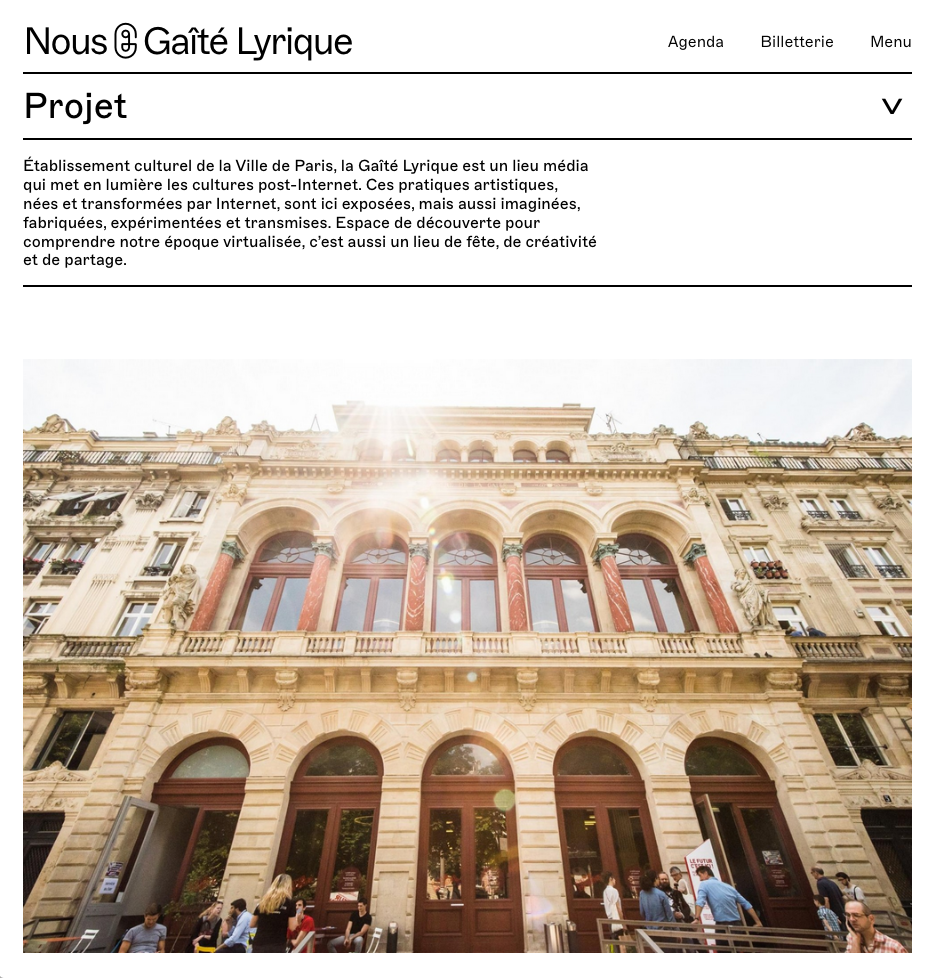 La Gaîté Lyrique is a cultural venue by the City of Paris. Opened in 2010, it is dedicated to highlighting post-Internet culture. Artistic practices that originate online are exhibited here, but also are imagined, produced, experienced and transmitted. Gaîté Lyrique aims to be a space of discovery, for understanding our virtualized era. It is also a place of celebration, creativity and sharing.
