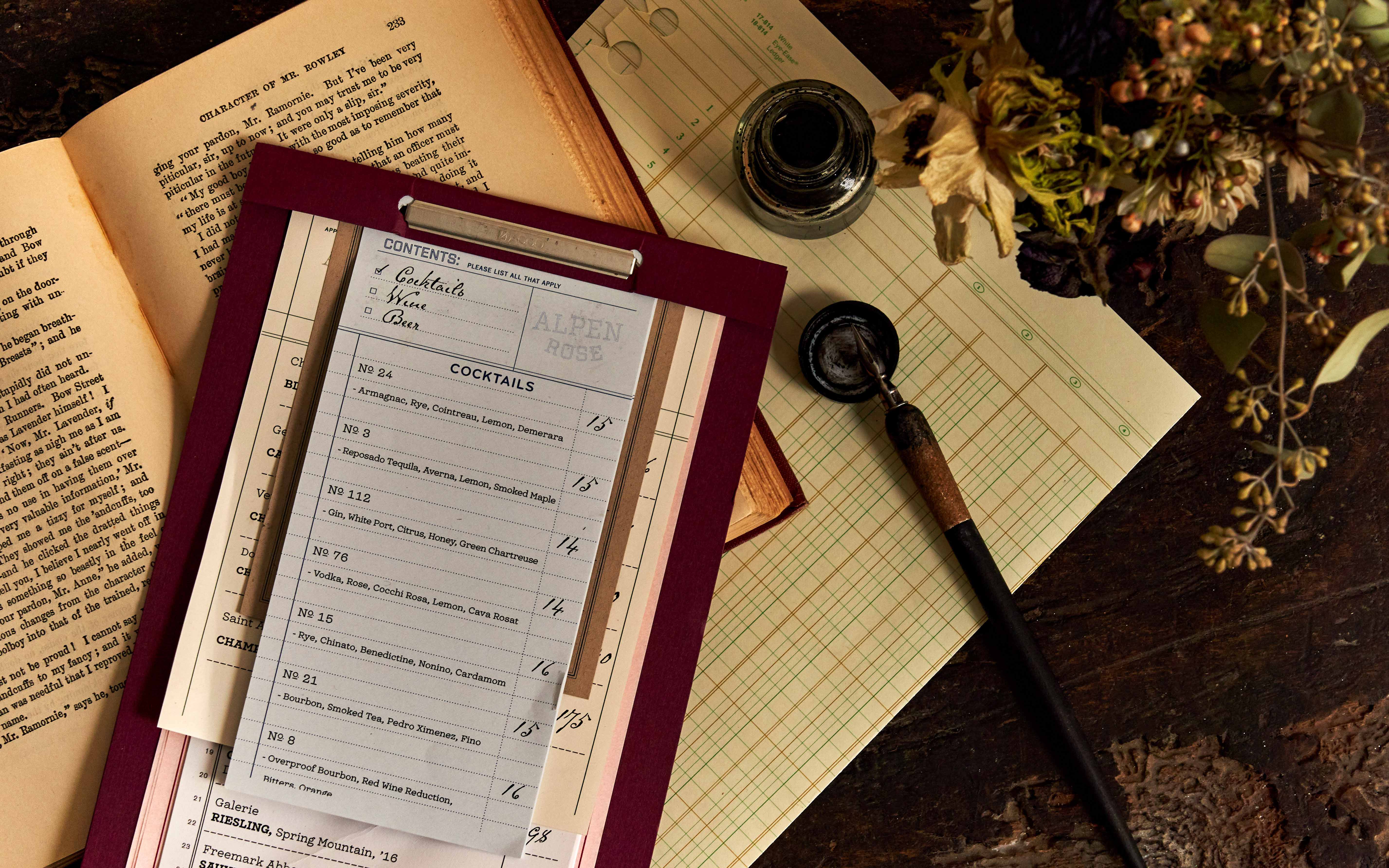 For a uniquely immersive experience, Mucca created a fictional world based on a female botanist from a bygone era who travels the globe in search of the elusive Alpen Rose. This world inspired details throughout the space that surprise and delight—from an index card cocktail menu to flowers frozen in ice cubes. A system of multiple logos in different styles suggest billheads collected from exotic locales, and a richly layered menu system recalls a collection of botanical research.