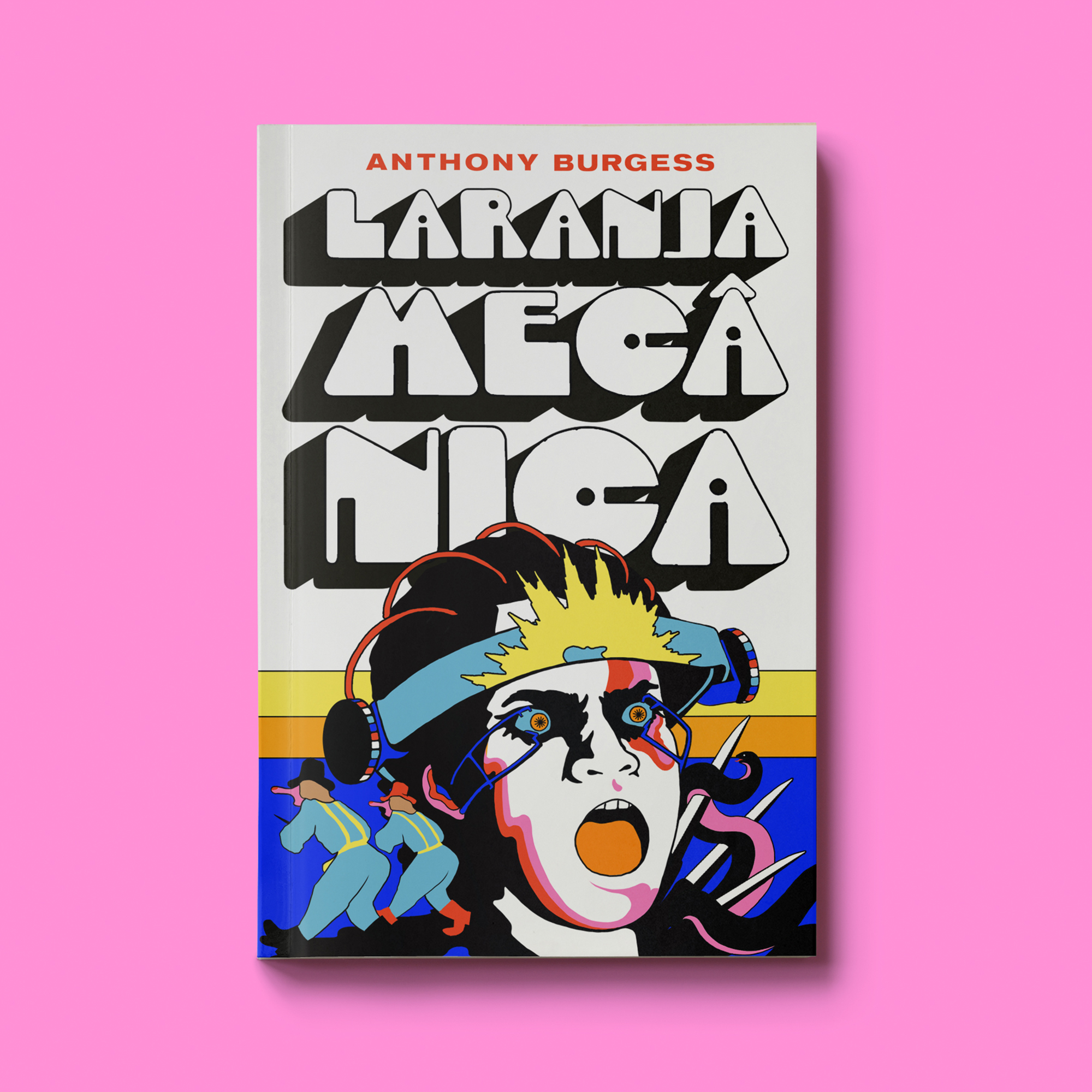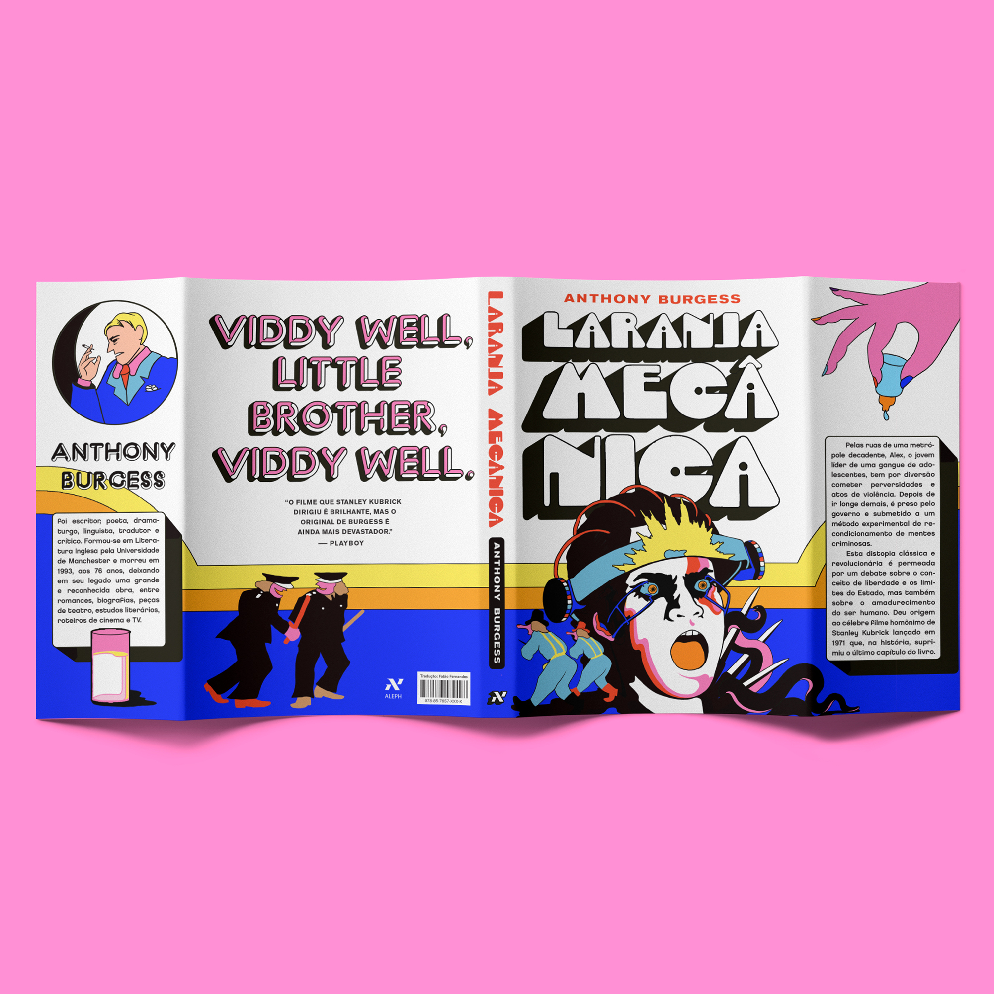Book jacket for Laranja Mecânica, a new edition of the classic novel by Anthony Burgess, translated to Portuguese by Fábio Fernandes and issued by Brazilian publisher Aleph in 2019.