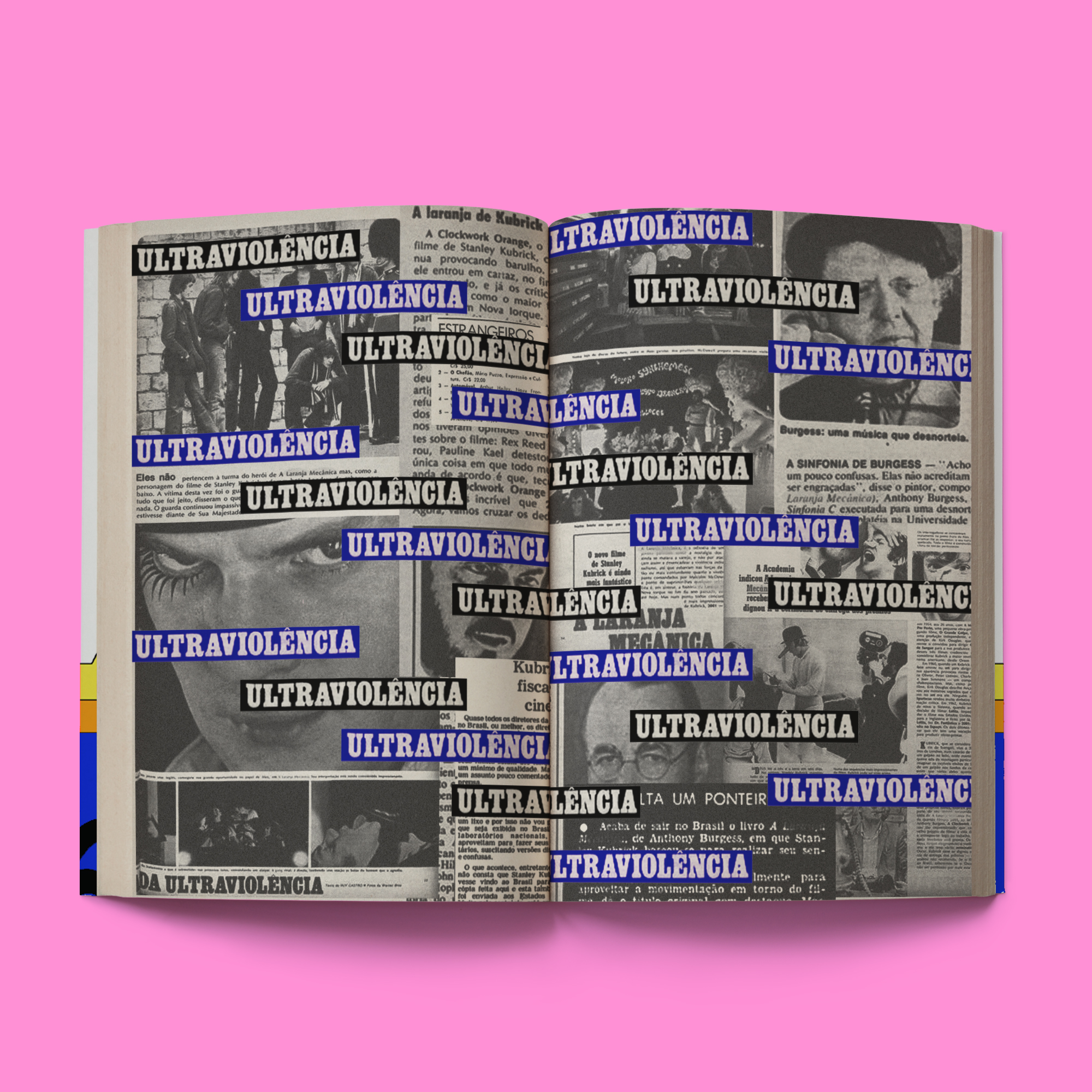 Collage of old Brazilian newspaper clippings announcing that A Clockwork Orange would be censored in Brazil by the military dictatorship in the 70s. The word “Ultravioléncia” from one of the headlines (set in caps from Egyptienne Bold Condensed or similar) is repeated multiple times.