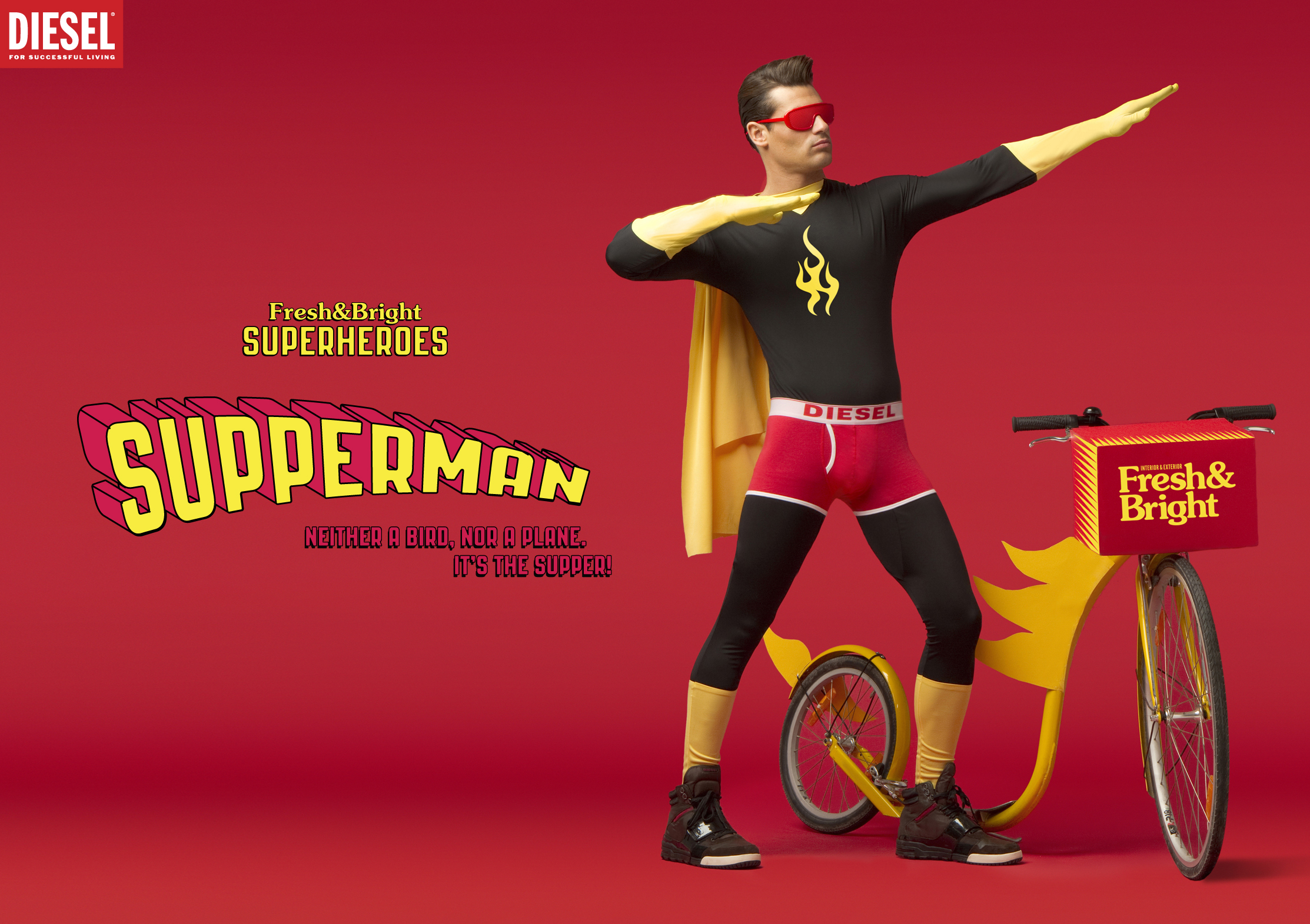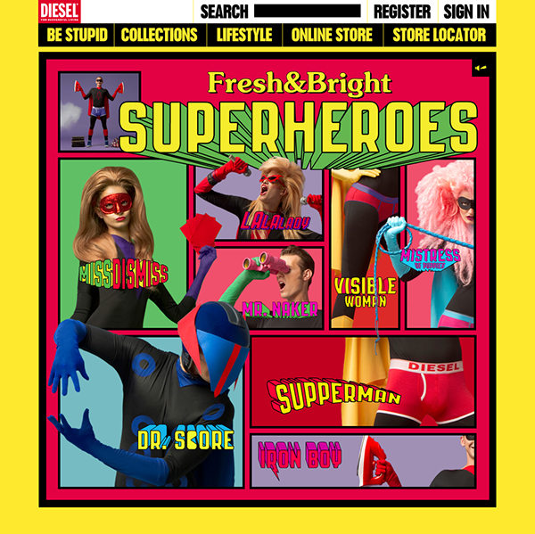 Diesel Fresh & Bright Superheroes campaign Contributed by Mari Carmen Gainza on Nov 3rd, 2020. Artwork published in December 2010. Source: www.behance.net Mari Carmen Gainza. License: CC BY-NC-ND. A series of characters inspired by the world of ’70s comics and TV shows; they wear their underwear over their clothes and their powers are connected to the colors of Diesel’s Fresh & Bright collection. The campaign typeface is PAG Revolucion, used with perspective 3D effects and other modifications. The Fresh & Bright logo uses ITC Souvenir. Design by Mari Carmen Gainza at DoubleYou. Photography by Robert Bartholot. Source: www.behance.net Mari Carmen Gainza. License: CC BY-NC-ND. Source: www.behance.net Mari Carmen Gainza. License: CC BY-NC-ND. Source: www.behance.net Mari Carmen Gainza. License: CC BY-NC-ND. Source: www.behance.net Mari Carmen Gainza. License: CC BY-NC-ND. Source: www.behance.net Mari Carmen Gainza. License: CC BY-NC-ND. Source: www.behance.net Mari Carmen Gainza. License: CC BY-NC-ND. The superhero lineup as seen on the Diesel website. Typefaces More about PAG RevolucionGet PAG RevolucionMore about ITC SouvenirGet ITC Souvenir Formats Advertising (2116) Topics Product (2101) Fashion/Apparel (1546) Designers/Agencies Mari Carmen Gainza (3) DoubleYou (2) Tagged withsuperheroes (32)comics (105)Diesel (3)underwear (16)campaigns (369)series (1161)perspective effects (211)3D effects (309)chromatic (766)modified typeface (1749)humor (159)sexual innuendo (34)branding iron (18)capes (4)masks (69)sunglasses (80)spyglasses (1) Artwork location Spain (1052) Barcelona (432) In SetsDesigns by Women (Fonts In Use Staff) (3578)Colossal Combinations (Jay W. Mellor (JWM)) (2128)P1 (Wych Hendra) (66)Colors (Lucas Bevilaqua) (808)3D (Lucas Bevilaqua) (17)Fun (Lucas Bevilaqua) (107)ECES (Joel Barhamand) (8)bb (Leonardo de la Fuente) (1331) Post a comment Name Email – will not be published Website Your response Submit Comment More ITC Souvenir in use Carrie movie posters1976unknownJouineau BourdugeAverardo CirielloContributed by Patrick Concannon Staff Pick Pac-Man arcade game US flyerc. 1980Namco LtdMidwayContributed by Erika Rivers Wganda Kenya – Cartagena Caribe album art1987Alvaro RestrepoContributed by ssssd Sponsor More in Product Crossing Collection – A/W 2023 by Lanificio Cerruti2022Pitis e AssociatiContributed by Production Type Staff Pick Selfless by Hyram2021TransatlantikaHeather BrownContributed by Philipp Zurmöhle Ken’s Steak House Dressingc. 1971unknownContributed by Callie W Miista website2024MiistaContributed by Production Type More in Advertising Ed Muskie 1972 US presidential campaign1972unknownContributed by Stephen Coles LEGO Fortnitec. 2024Epic GamesContributed by Lewis McGuffie Sola MassivePhoto(s) by Anneke on Flickr. Fruco Patent-Schneeschläger adc. 1926Photo(s) by altpapiersammler on Flickr. More Fonts In Use The Civil War Monitor, Fall 20132013Modus Operandi DesignPatrick MitchellContributed by Stephen Coles Staff Pick “YOU&ME&ME&YOU” mural2021Anthony BurrillContributed by Matthijs Sluiter Staff Pick Electrified – The Hepburns1989Mike OwenContributed by mike owen Staff Pick NSA Security Education Program poster series (1950s–1970s)c. 1960unknownContributed by Fonts In Use Staff Staff Pick