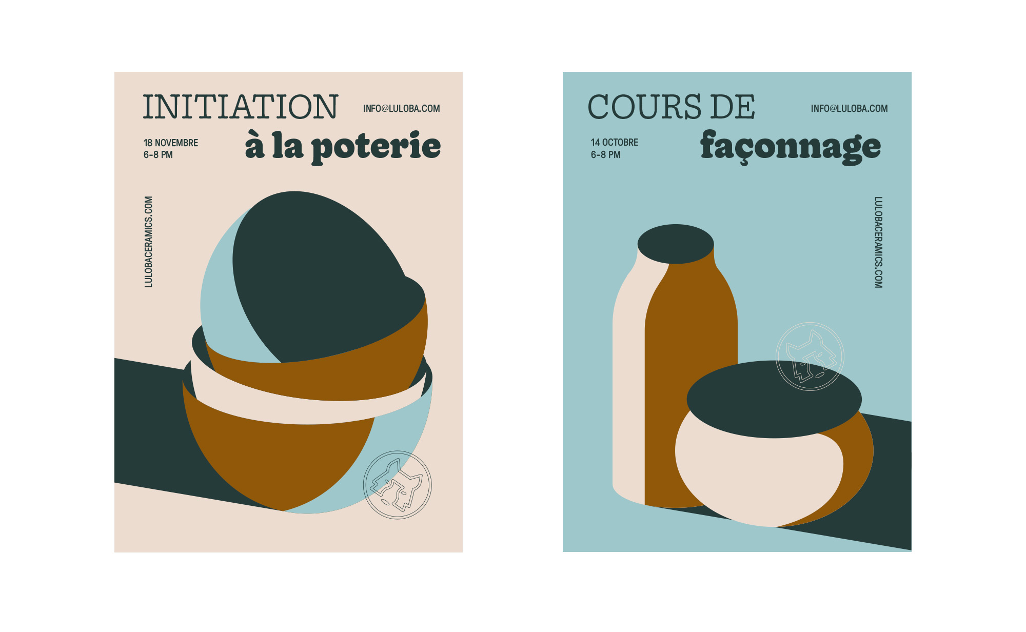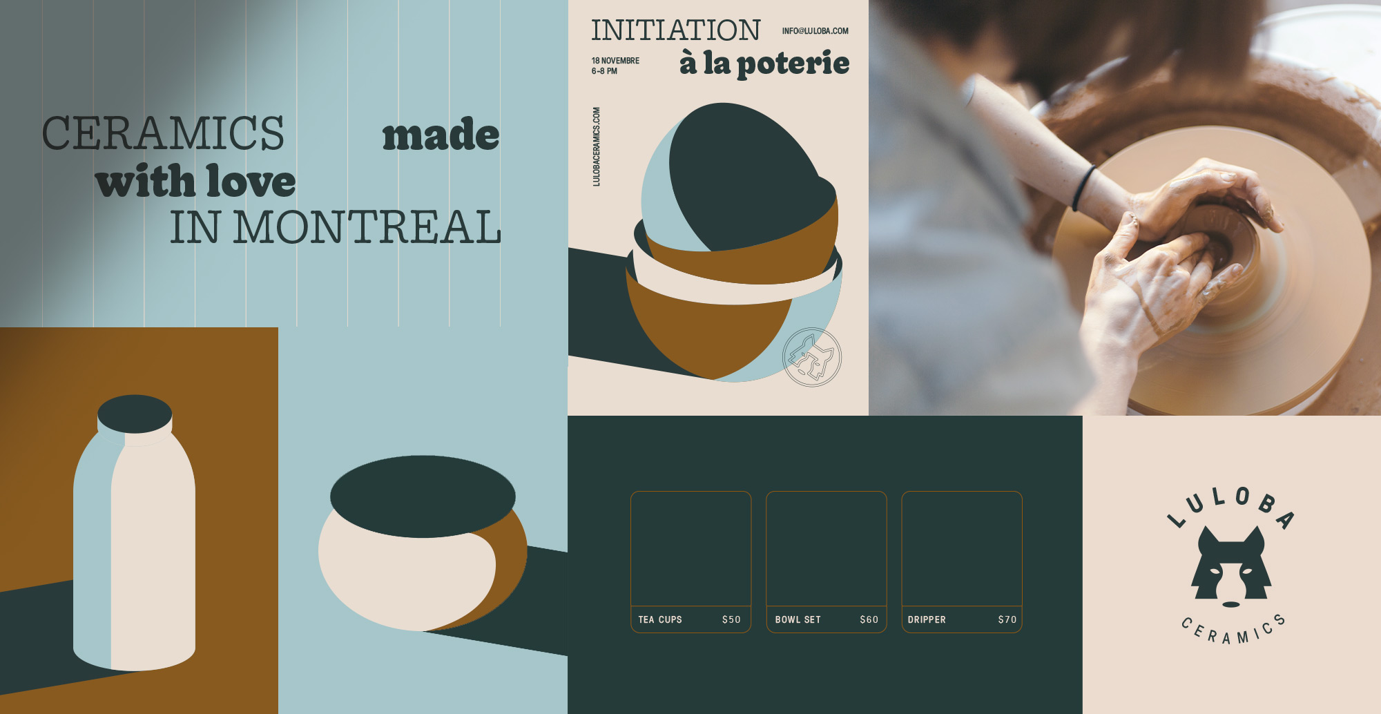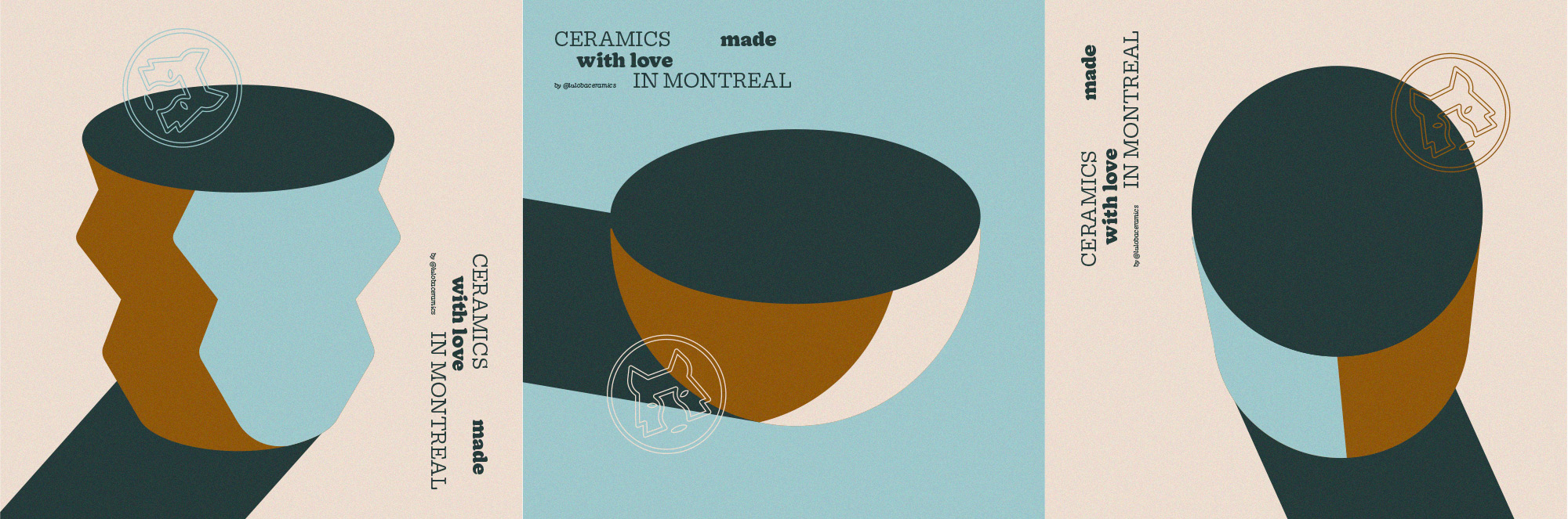 Branding for Luloba Ceramics, a small pottery studio based in Montreal. Luloba is named in reference to the “loba capitolina” , a sculpture depicting a scene from the legend of the founding of Rome. The sculpture shows a she-wolf suckling the mythical twin founders of Rome. The logo plays with negative space to create a vase in the muzzle of the wolf. Colorful illustrations in the identity give a preview to the real product and add personality to the studio. Lights and shadows on the objects bring these to life.