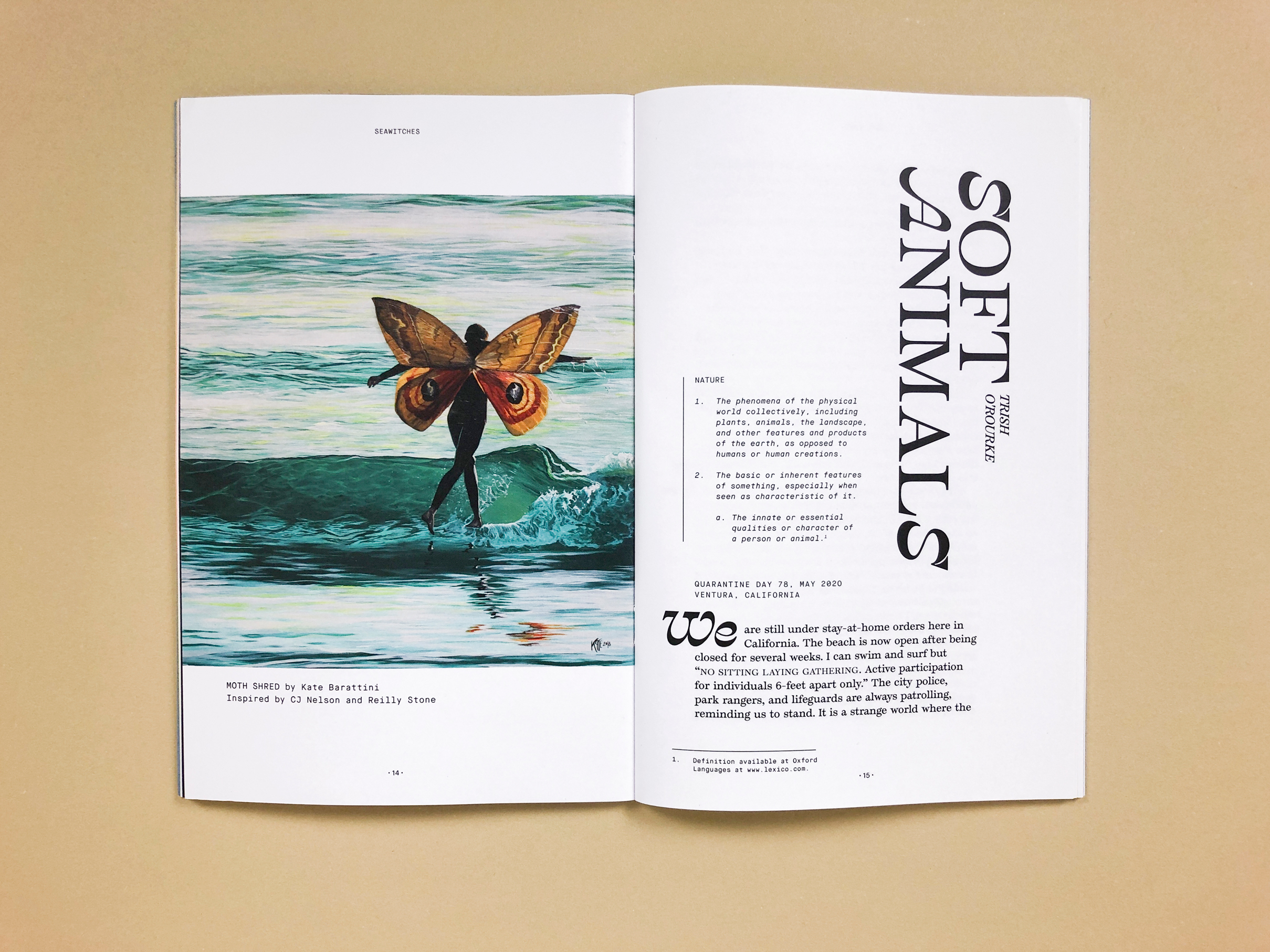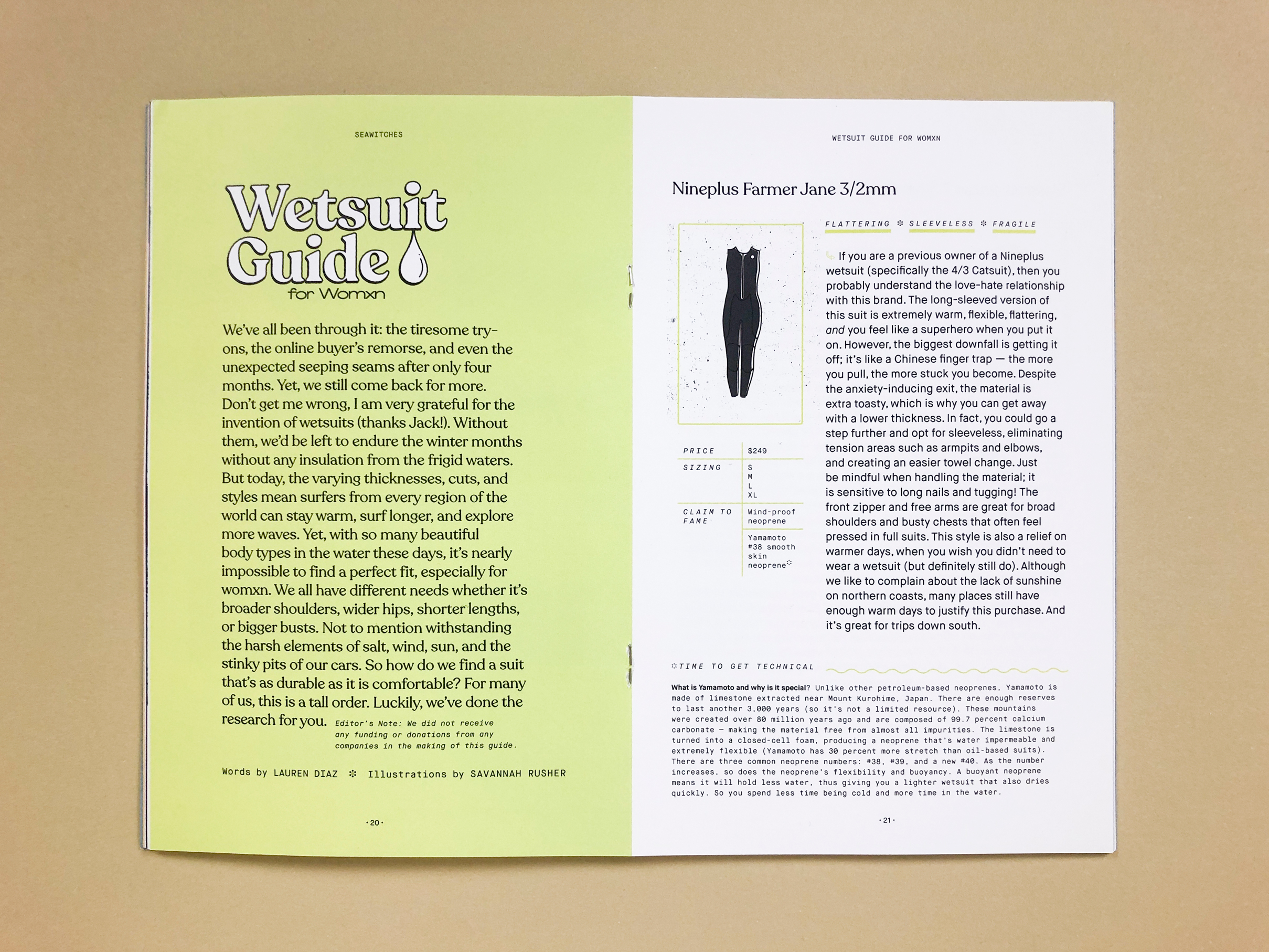 As a community-based platform, each issue takes on the life of its contributors. Designer Leah Koransky used Temeraire for narrative personal stories and Temeraire Italienne for display type throughout the zine. Additional copy is set in Maison Neue, Maison Neue Mono, and Recoleta. Designer Savannah Rusher created the custom Wetsuit Guide title treatment and illustrations.