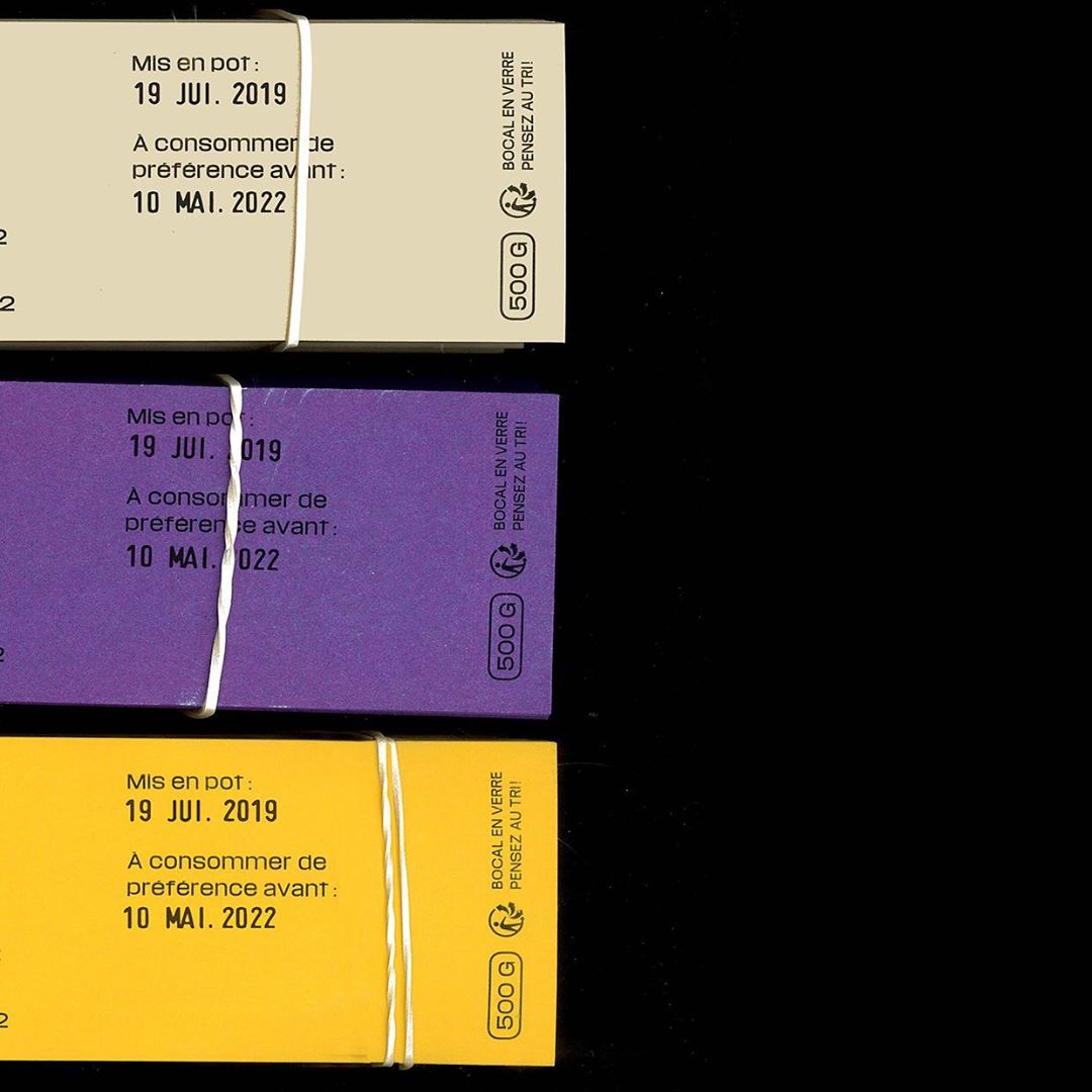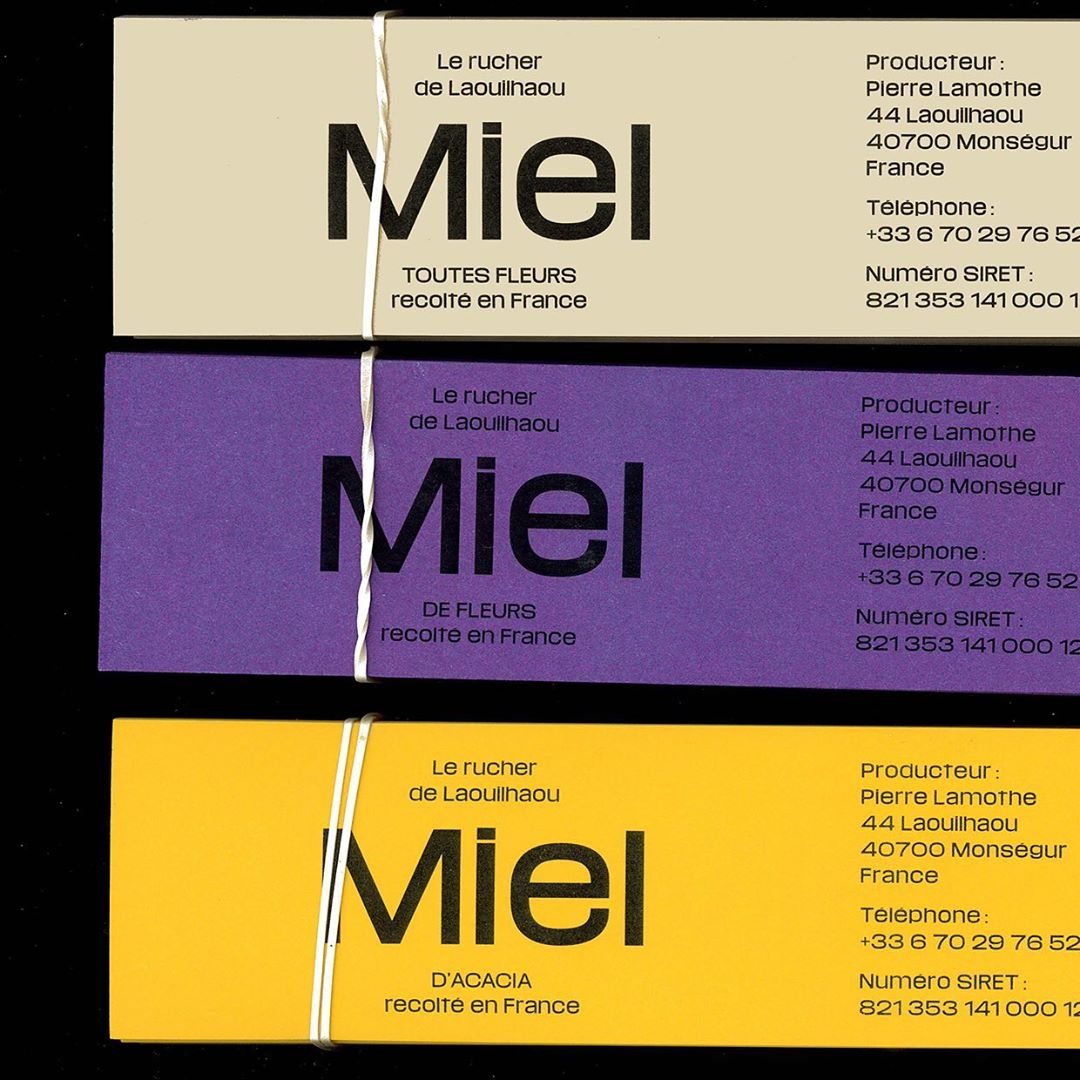 Coralie Milière of Studio Silex designed a simple yet effective and beautiful labeling system. The product-inspired colors indicate the type of honey: a creamy beige for the polyfloral flavor, an estival violet for flower honey, and a sunny yellow for acacia honey. The typeface chosen for the purely typographic label designs is Media Sans by Production Type.