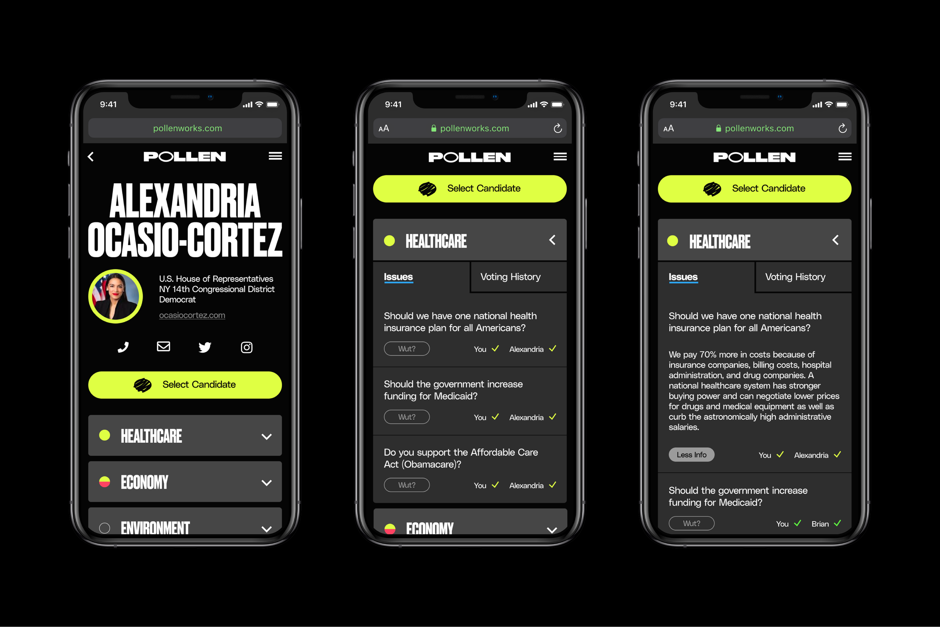 Pollen is a voter education and engagement platform driven by voter values rather than existing political affiliation. I was launched by Miguel Cabrera and Audrea Soong. The Pollen experience aims to ensure that voters are informed and understand how the issues they care about translate into candidate selection and ballot measures.