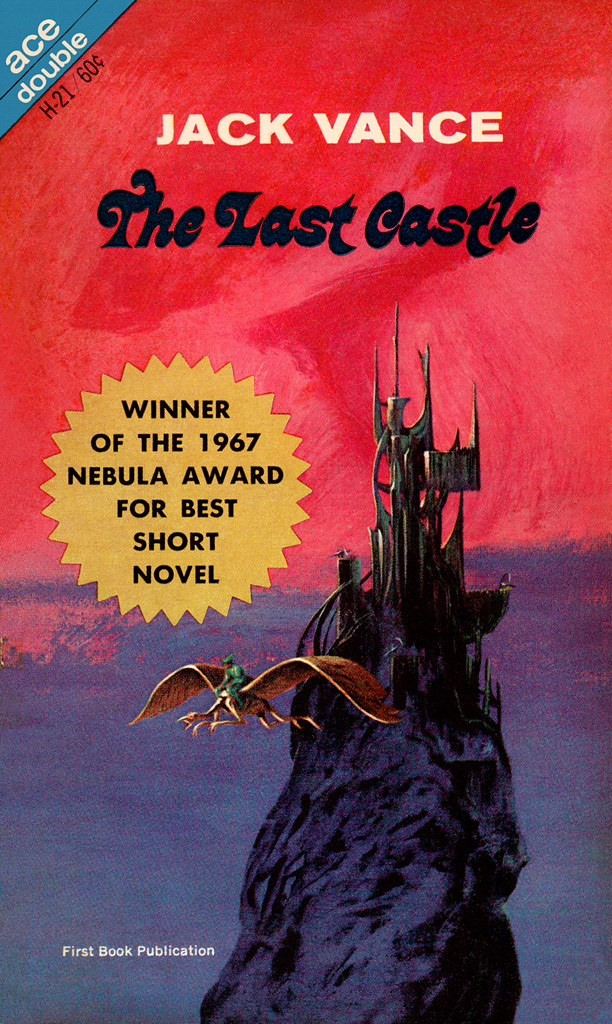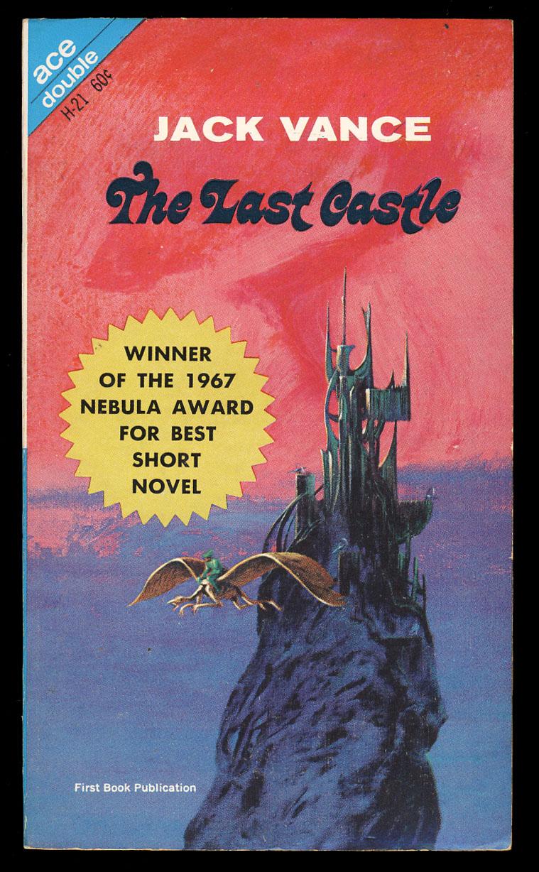 The Last Castle by Jack Vance (1916–2013) was first published in Galaxy Magazine in April 1966. It won the Nebula Award for Best Novella in 1966 and the Hugo Award for Best Novelette in 1967. This is the first book publication, as Ace Double H-21, together with World Of The Sleeper by Tony Russell Wayman. The cover art is by Jack Gaughan. The author’s name is set in caps from Akzidenz-Grotesk breit fett, known in the U.S. as Standard Extrabold Extended.