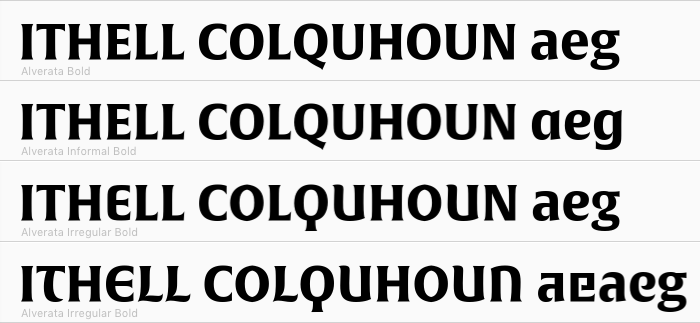 The typeface family used for the book’s typography is Gerard Unger’s Alverata (TypeTogether, 2014). Alverata comprises three subfamilies; Regular, Informal, and Irregular, each of which comes in six weights. The latter is inspired by Romanesque inscriptions from around the 12th century – a topic that Unger explored in his doctoral thesis at the Leiden University. It is this variety that was chosen for the cover. Alverata Irregular is distinguished by curved capitals including unfamiliar forms like an asymmetrical T, a symmetrical Q, or a round uncial E. Designer Tihana Šare utilized some of the alternate glyphs to reinforce the arcane qualities of the typeface. Alverata Irregular is a great fit for Colquhoun and her work.