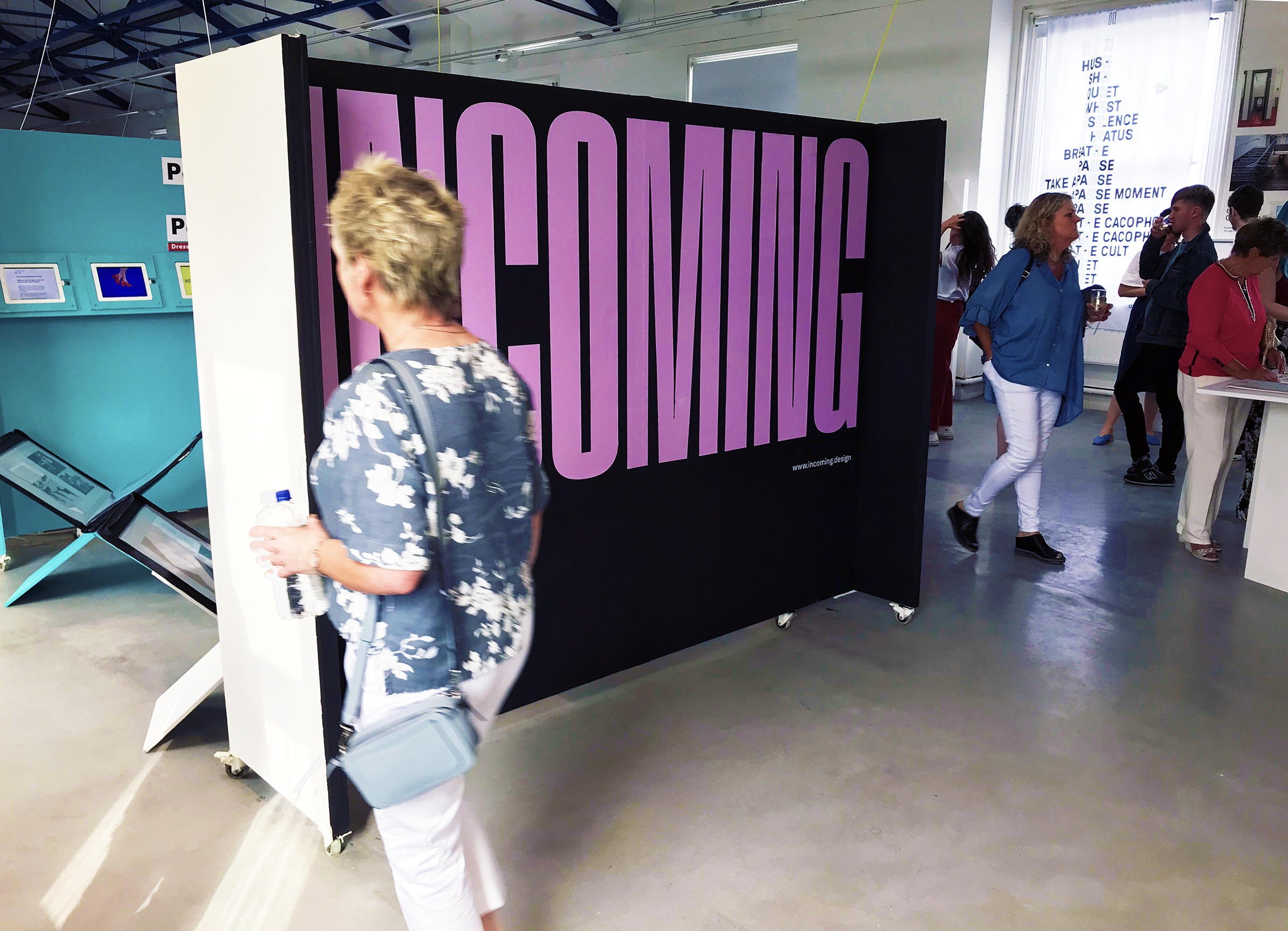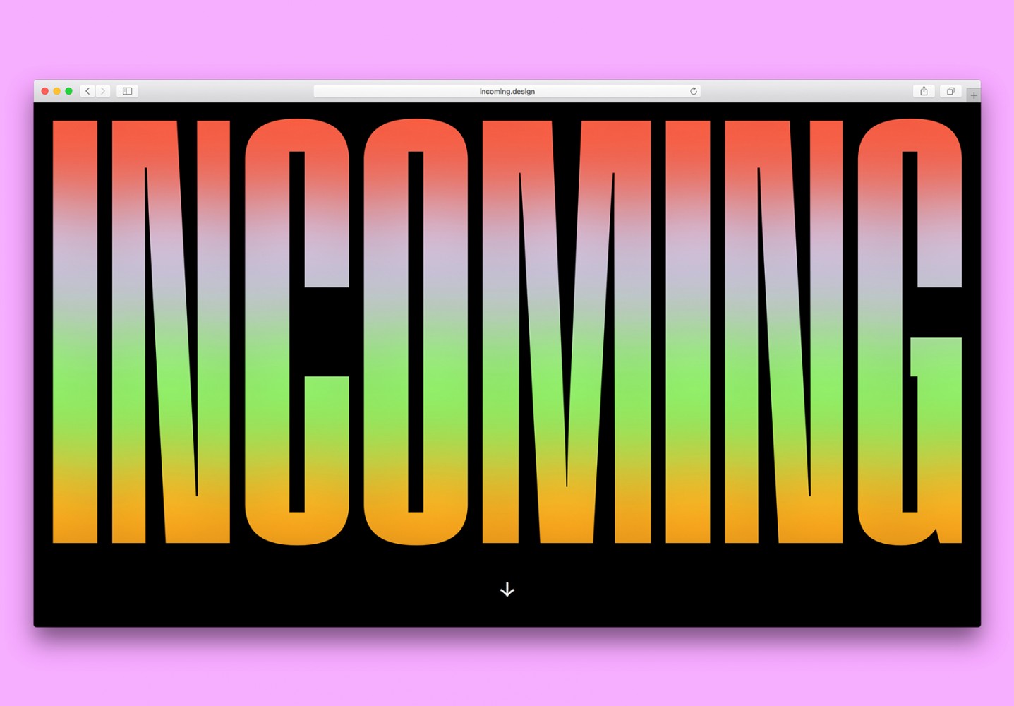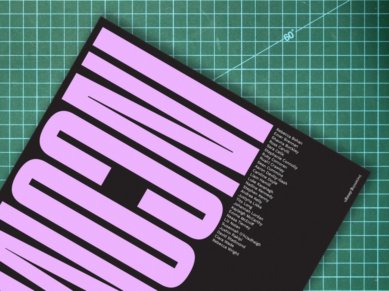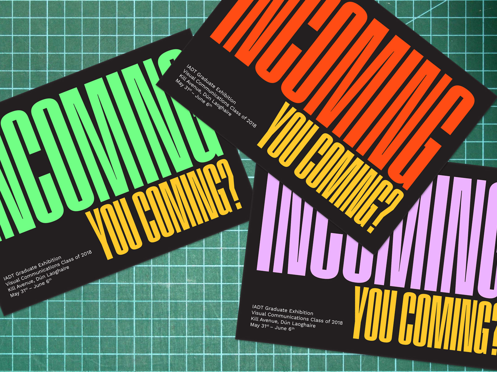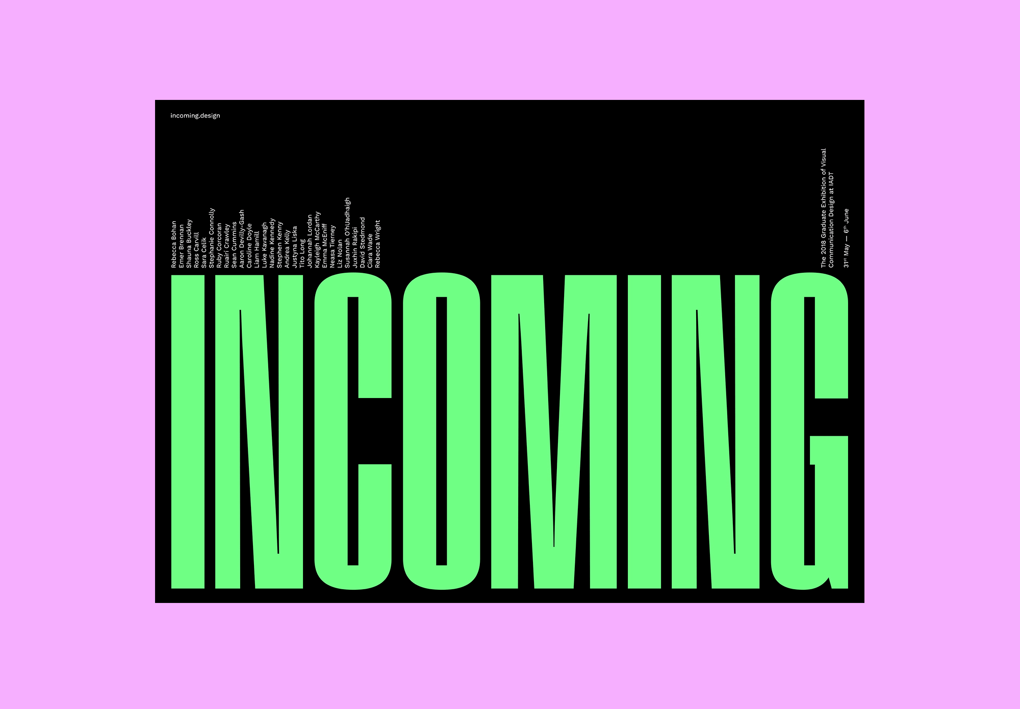 Identity for the 2018 IADT (Institute of Art, Design and Technology) Visual Communications Design graduate show, featuring all-caps Pressio №25. The system was implemented across posters, wall graphics, postcards, invitations, social media, and a website. ‘Incoming’ referred to the new class of designers entering the working world. In collaboration with Sara Celik, Sean Cummins, and Liam Hamill. The sans serif used for all information is Work Sans.