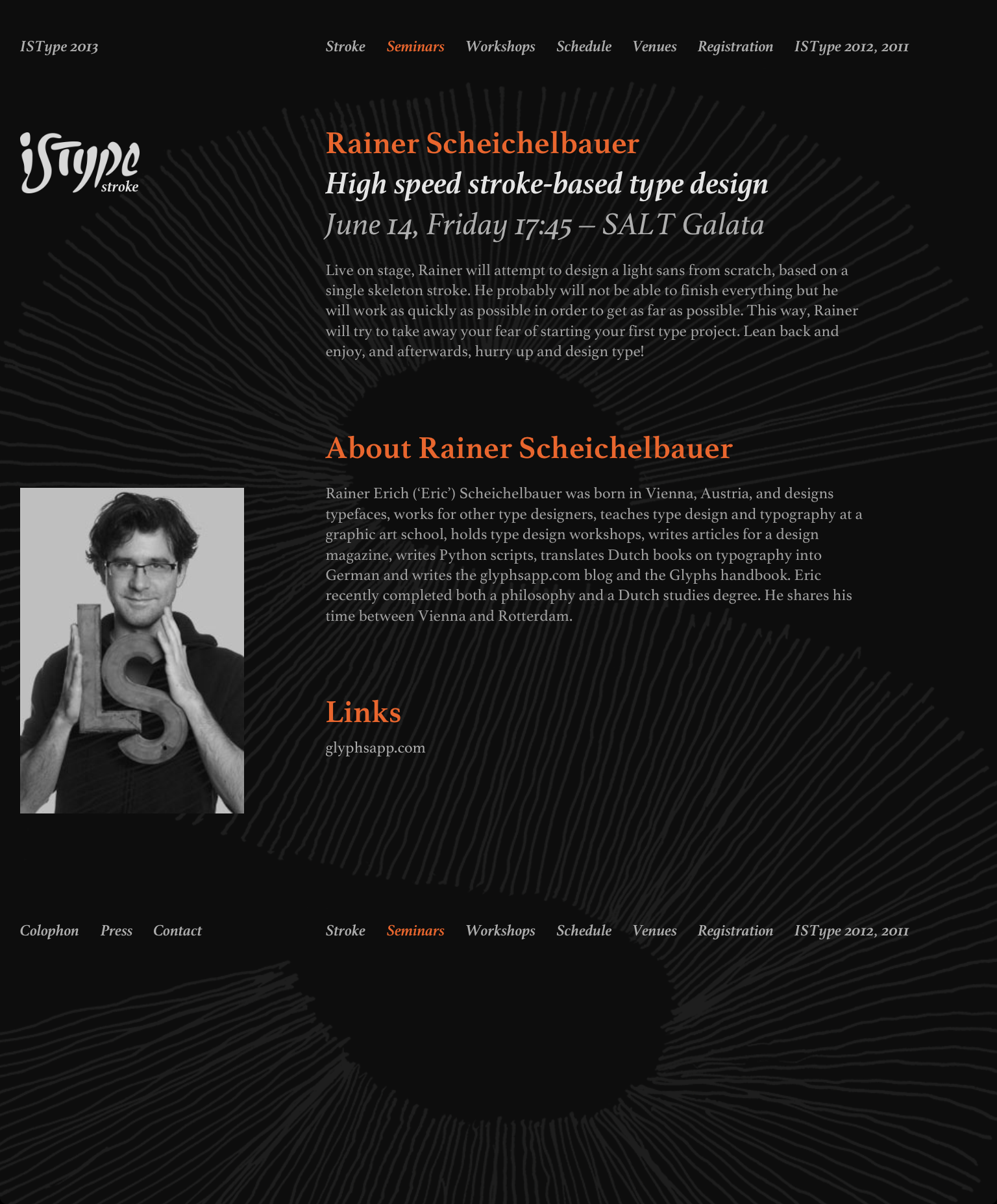 This is one of my favorites. The ISType website uses Athelas in various styles, sizes and shades; paired with some Neue Helvetica for buttons and the schedule. Light text on a dark background is always a bit tricky on the web. With the gracile shapes of Athelas used big, it works for me here. Mixing the upright with Italics and showing off oldstyle figures sets a typographic tone. The classic black-and-(orange-)red color scheme helps, too. There are nice details like a custom-colored map, or subtle effects on hover and select. The scribbled uppercase ‘S’ for the 2013 identity was inspired by Tablet Gothic Wide ExtraBold.