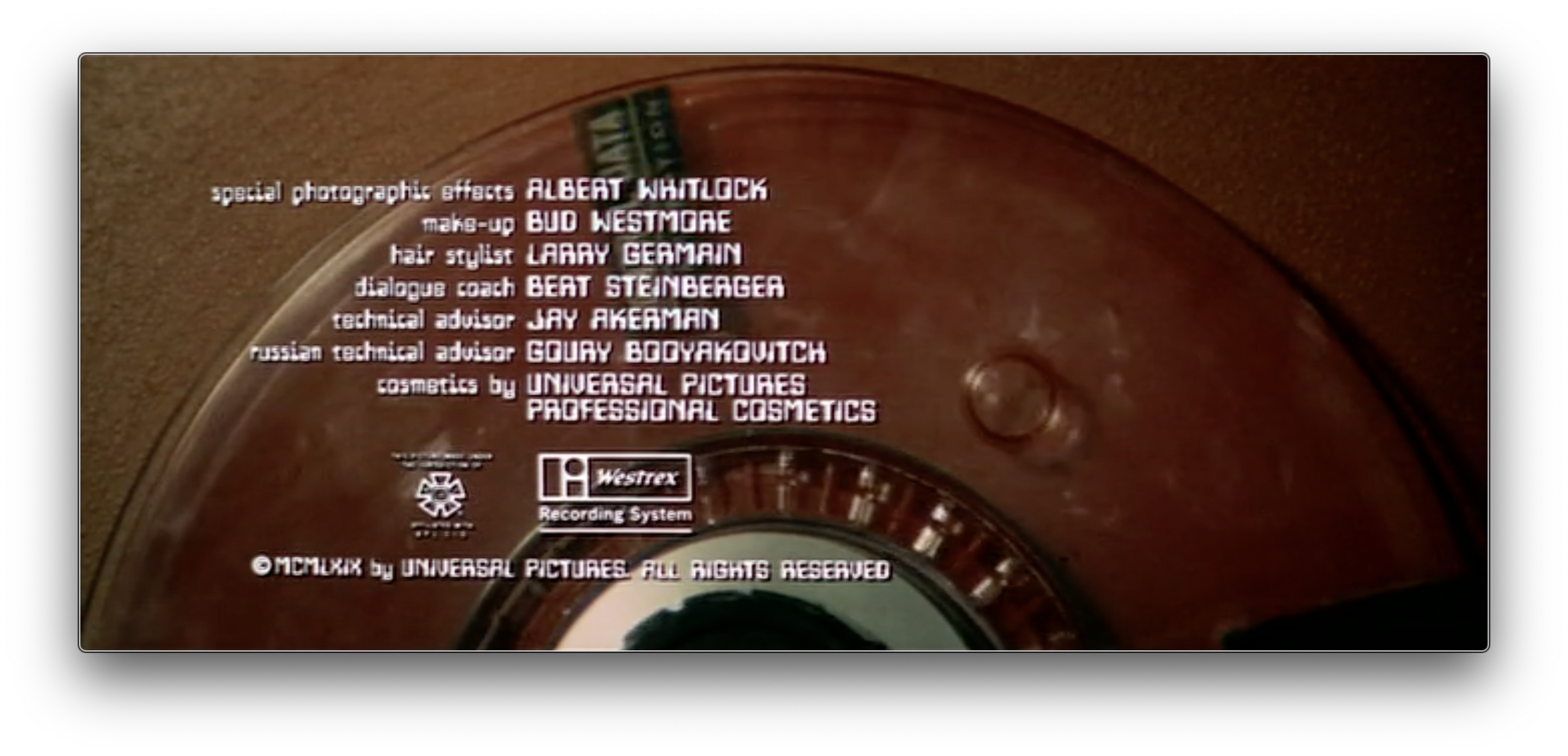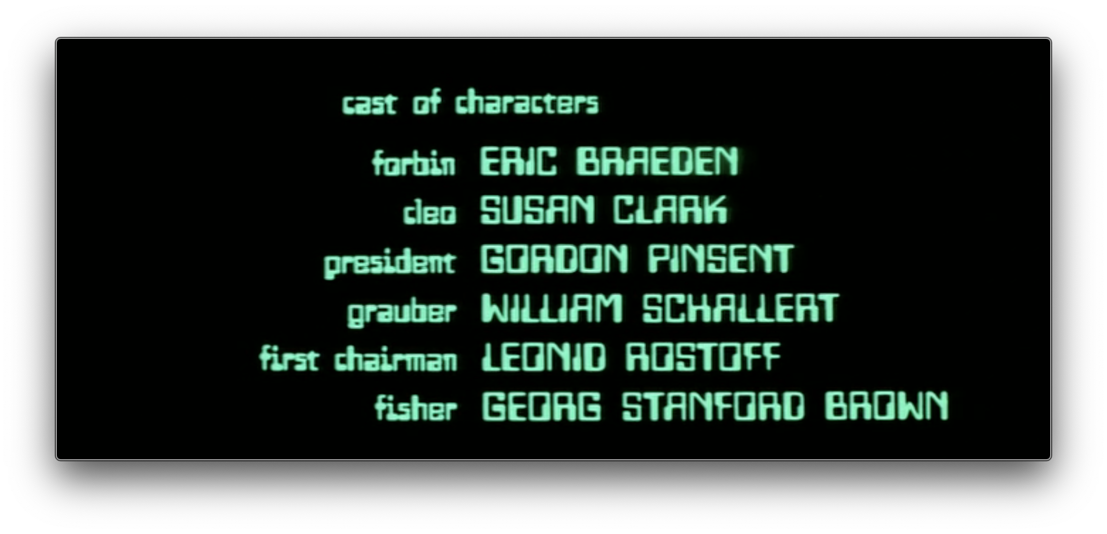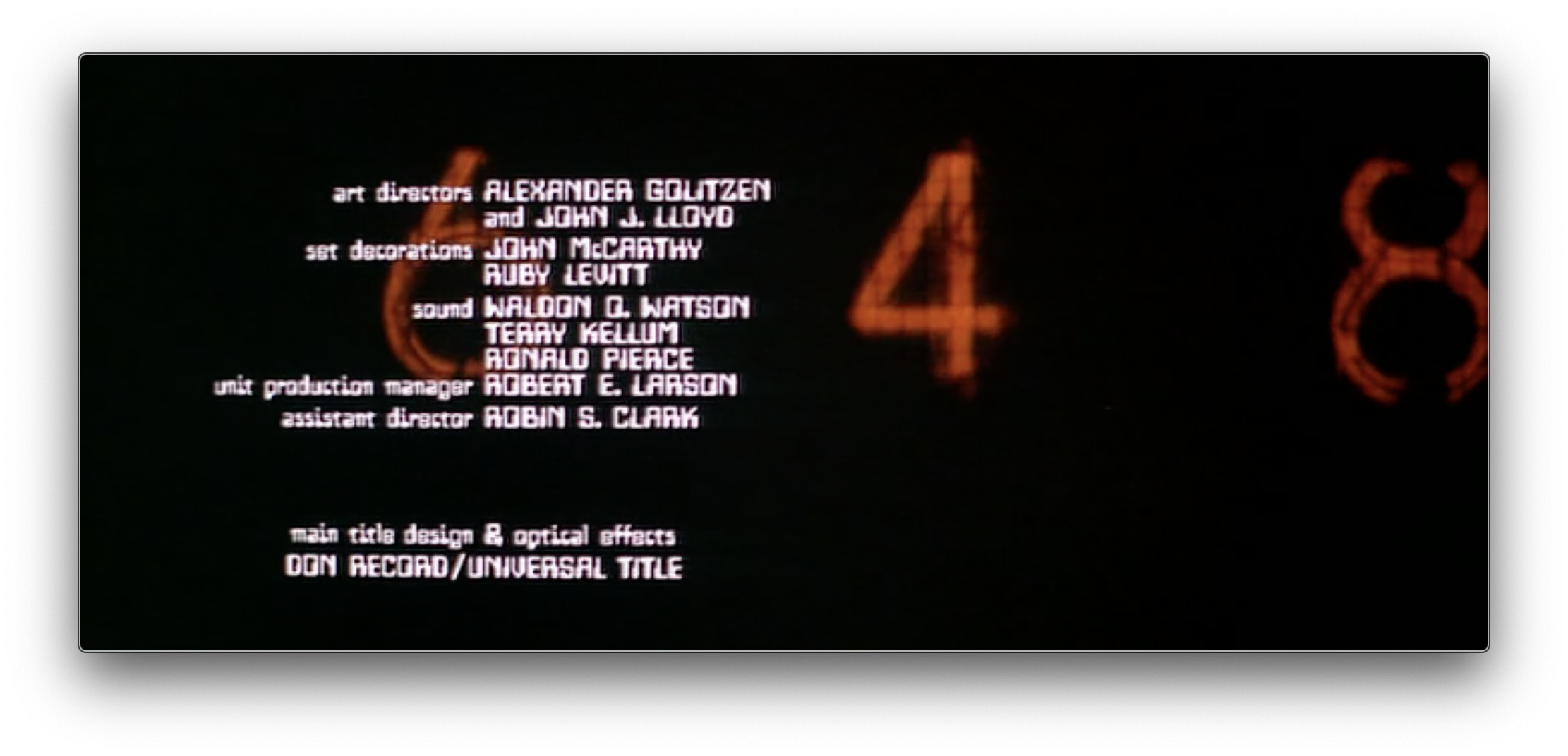 The titles, designed by the prolific Don Record, use a version of the Computer typeface. In this version, the W, N, and M have lost their enclosed squares, presumably to improve readability. The font also appears in the camera displays, which are installed after Colossus insists on being able to supervise Dr Forbin and his team at all times.