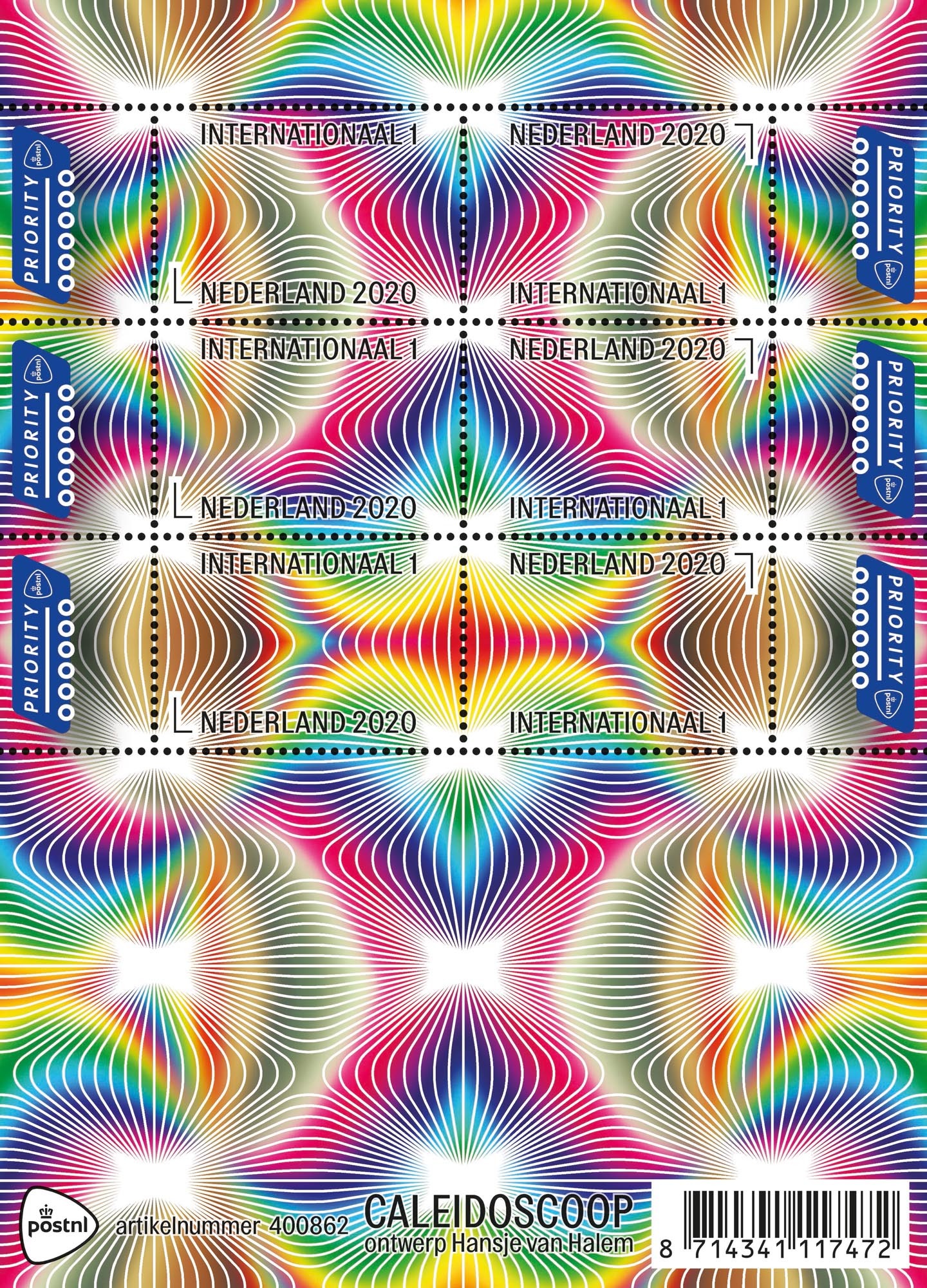 This colorful stamp with optical illusions is part of a new series in which PostNL assigns designers to design stamps without a concrete subject. They’re allowed to be guided by their own interests, by what fascinates and moves them. In this case, these are the recognizable kaleidoscopic effects that were also visible in Van Halem’s earlier projects, for example in the identity she developed for Lowlands.