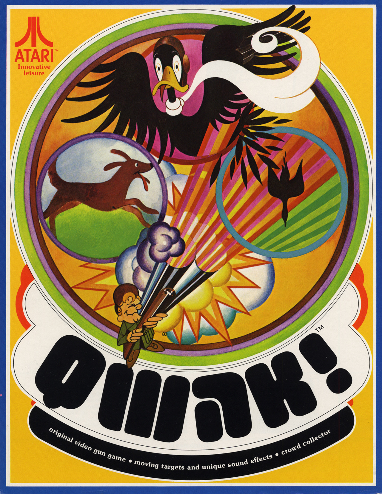 Before Moorhuhn and Duck Hunt, there was Qwak! The single-player duck hunting shooter arcade game was developed by Atari and released in November 1974. The depicted flyer uses Turtle for the title, with ITC Souvenir for the small text. See Museum of the Game for more information about Qwak!
