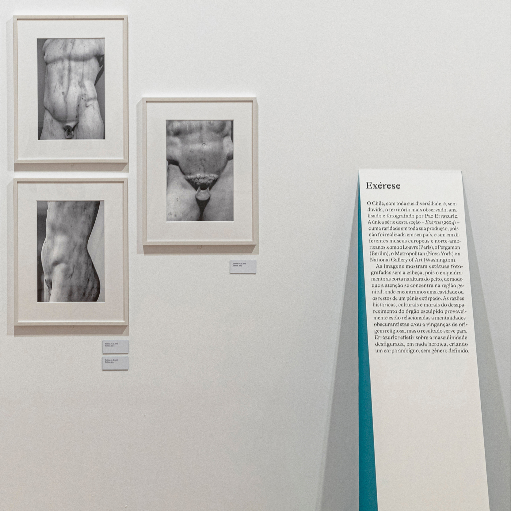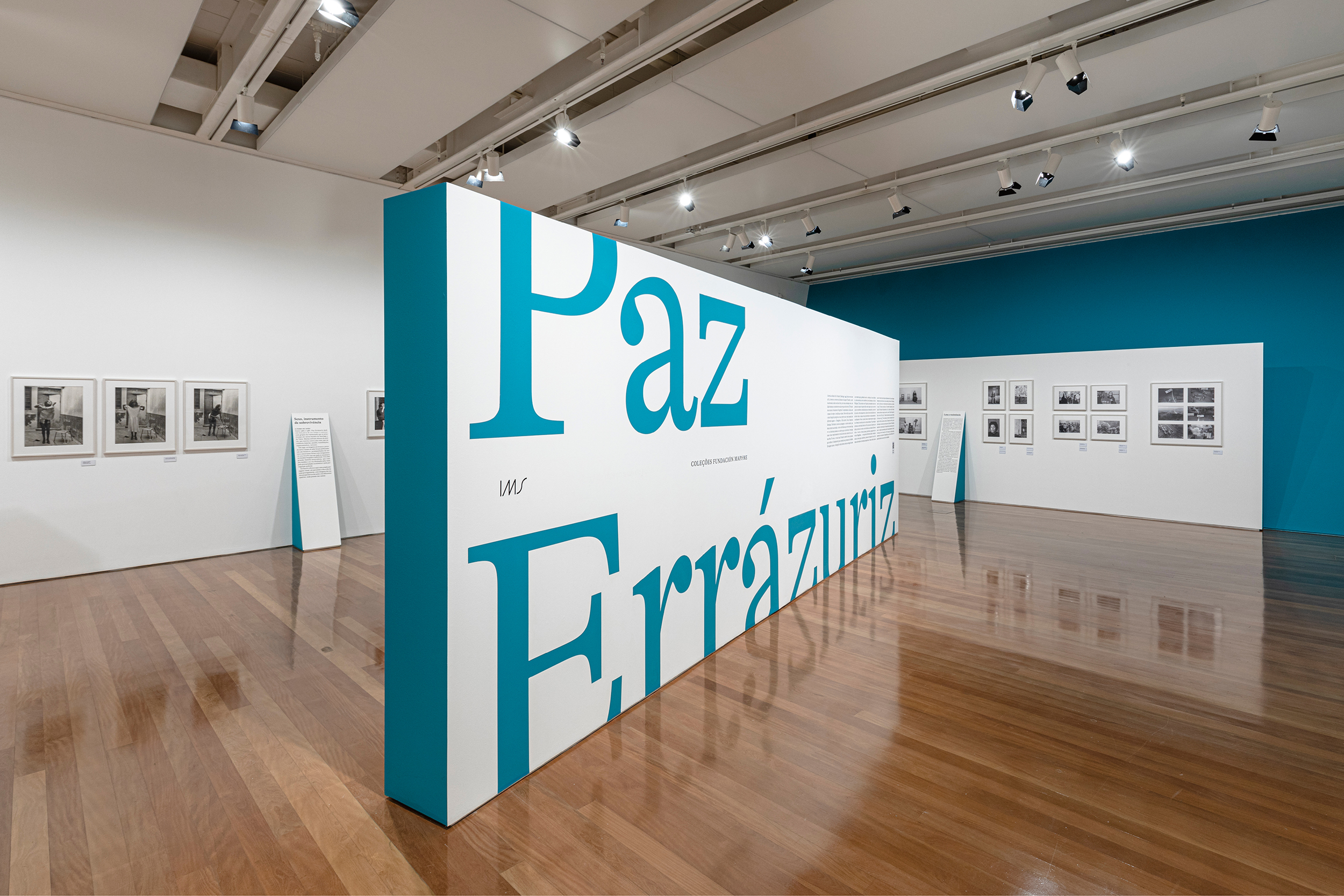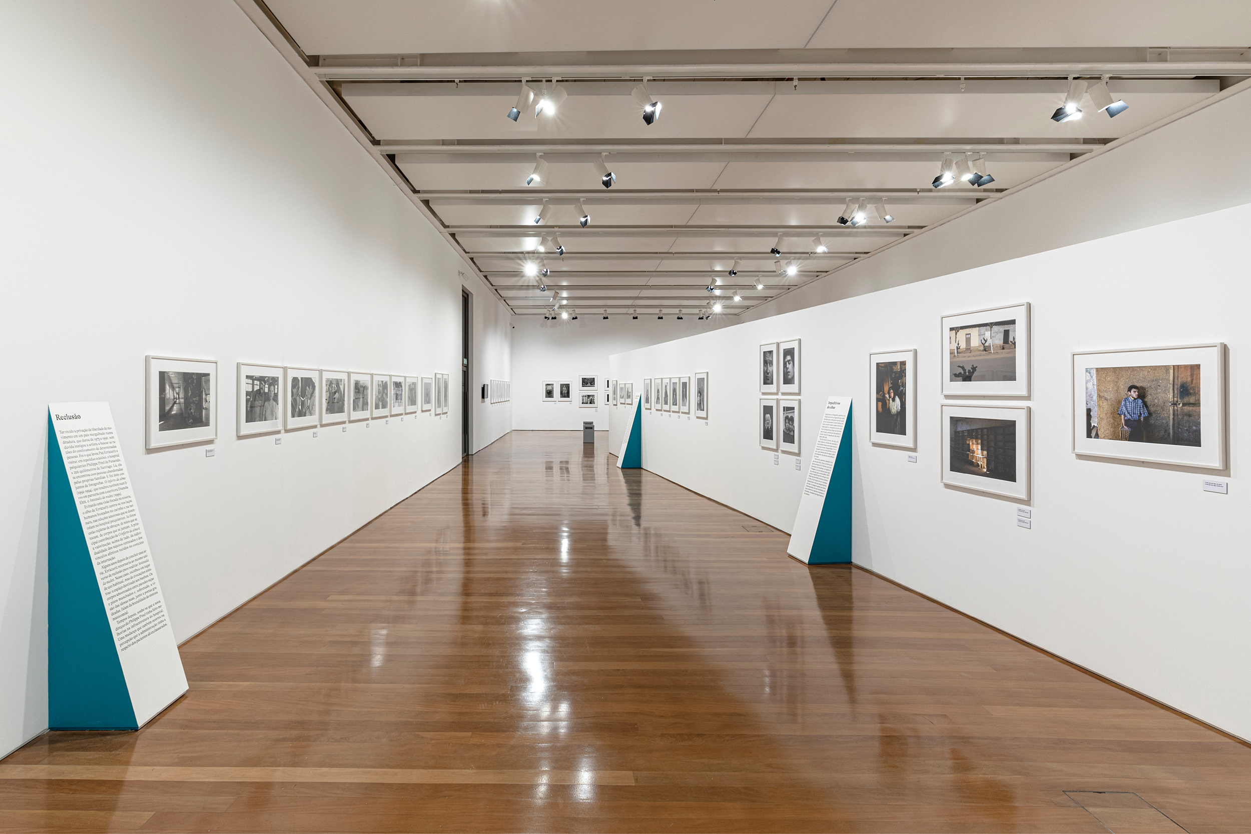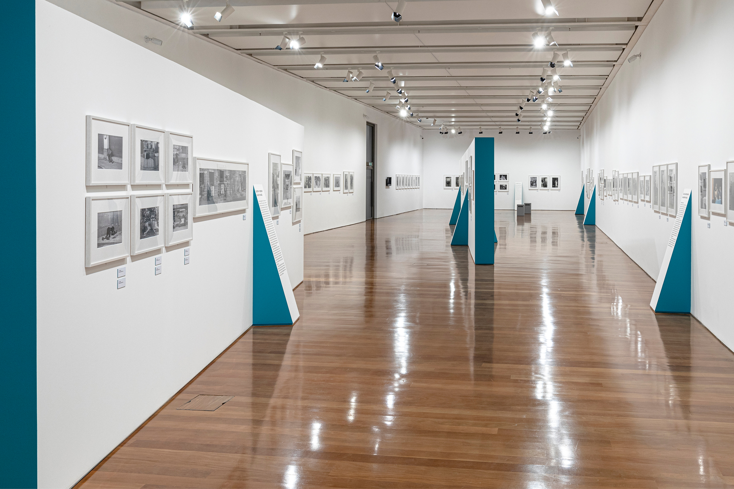 The idea behind the exhibition and the communication design was to let the pictures free on the white walls and guide the visitors by the totems, with the green sides, that point out each series. All the exhibition text is on the totems too.