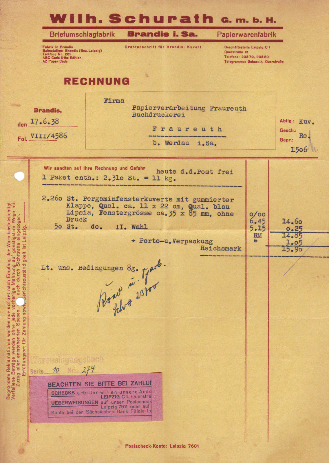 In 1881, brothers Hermann, Gustav, and Wilhelm Schurath opened a paper shop with a bag-making workshop in Leipzig. They added a paper mill in their home town of Brandis, Saxony, in 1883. Fifty-five years later, in 1938, Wilhelm Schurath G.m.b.H. issued this invoice for 2,260 glassine window envelopes with gummed flaps, plus another fifty of second quality.