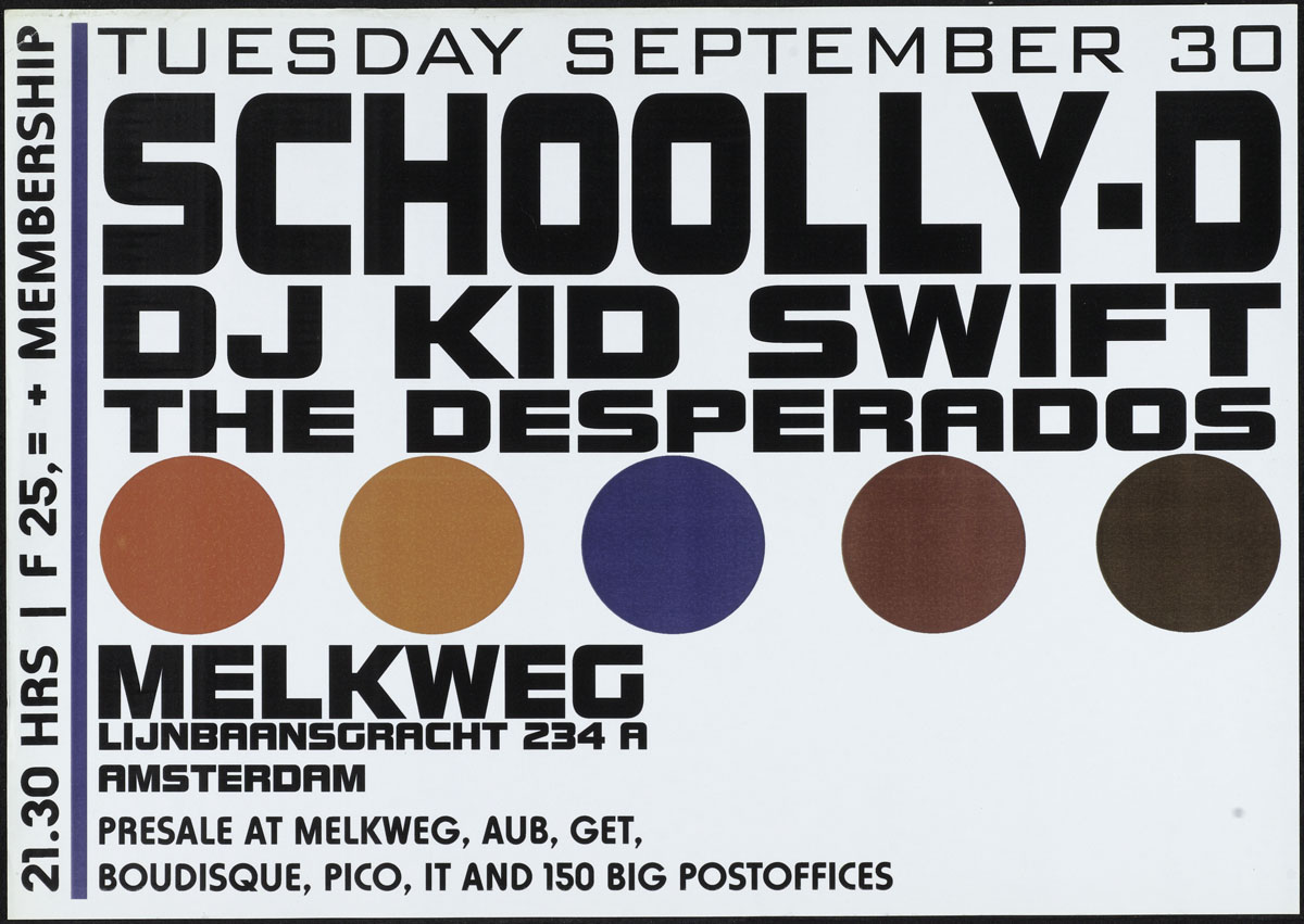 The Koninklijke Bibliotheek website lists headliners Schoolly-D from Philadelphia and his DJ Kid Swift (listen to an hour of Kid Swift from 1997) as the designers of the poster – not an expected credit, but I haven’t found better information yet.