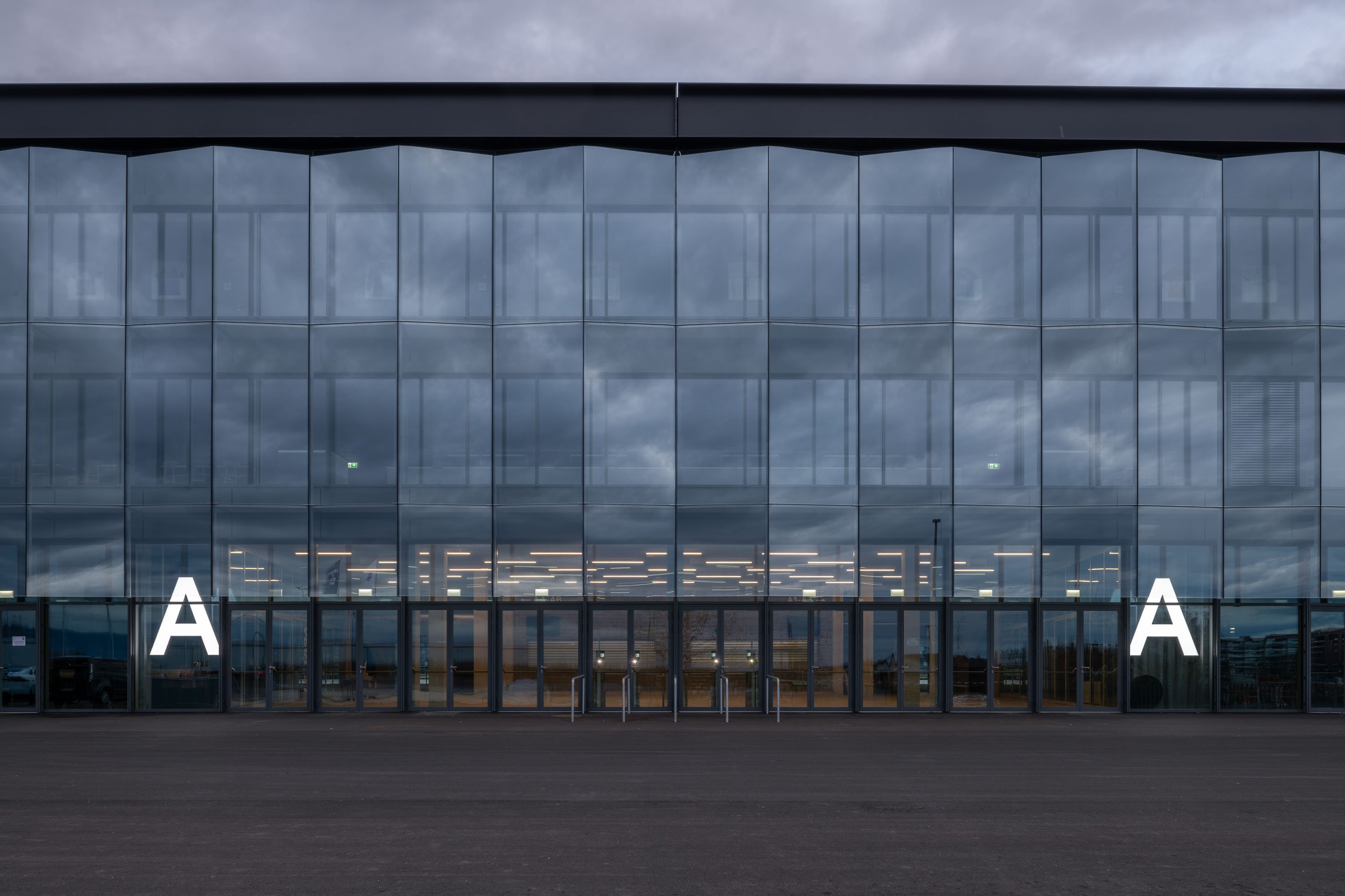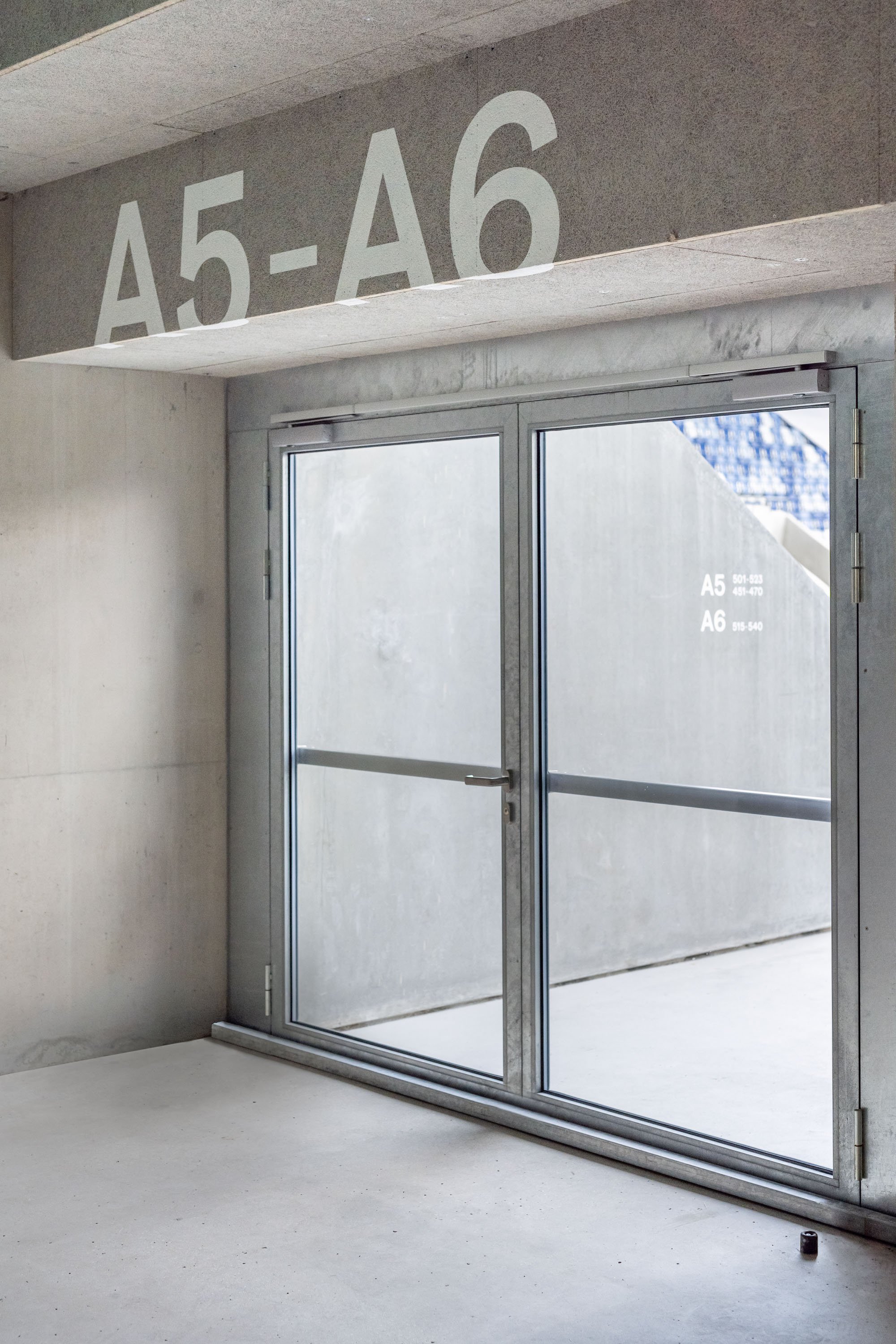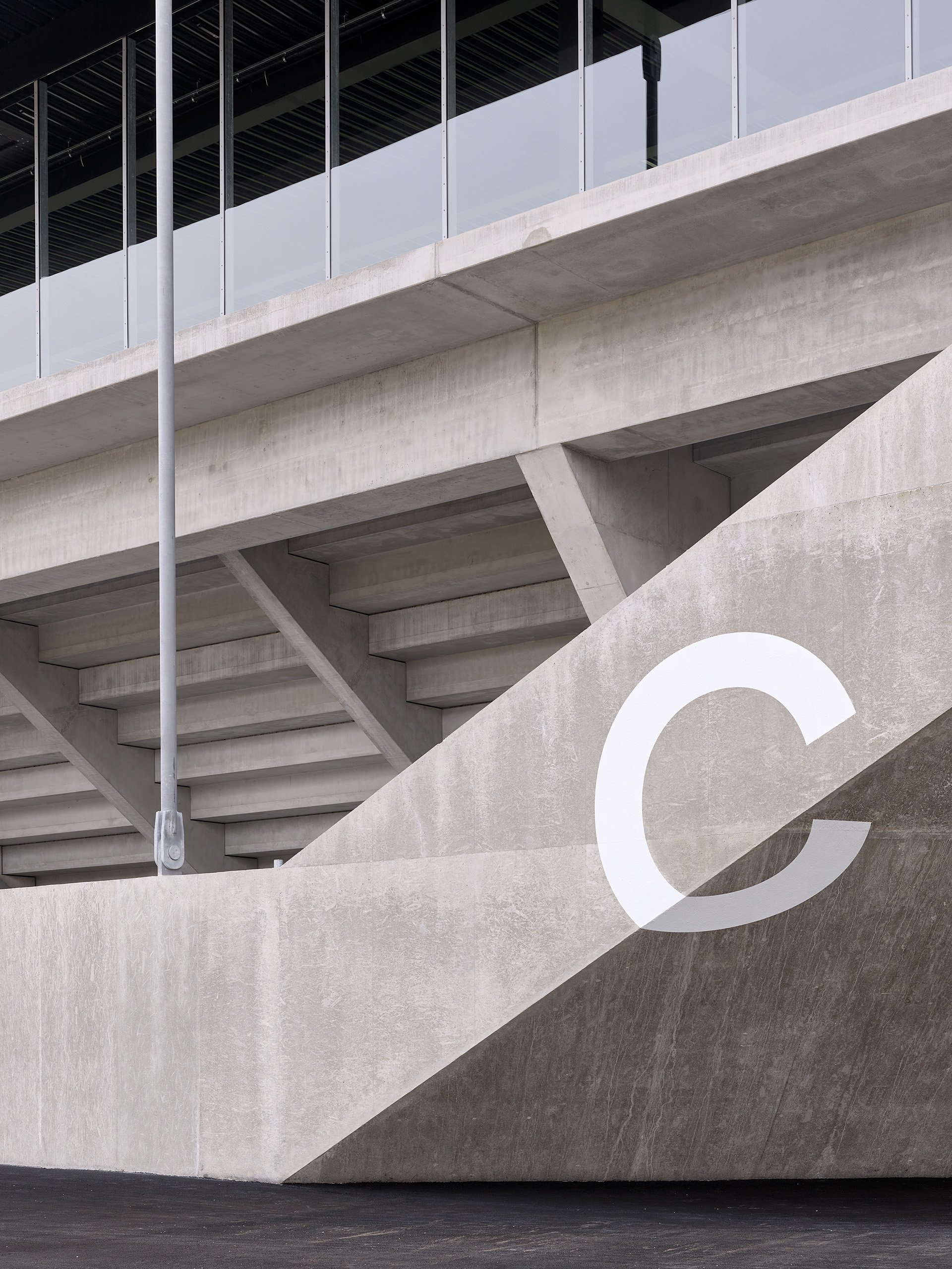 Binnenland’s typeface Formale Grotesque was still unfinished when investigations of the concrete structure were carried out in original size with a beta version of the typeface during construction. The letters fold around the building as sector markings, corresponding to the upwards folded stadium corners. This way architecture, design and the typeface merge in a radically simple symbiosis.