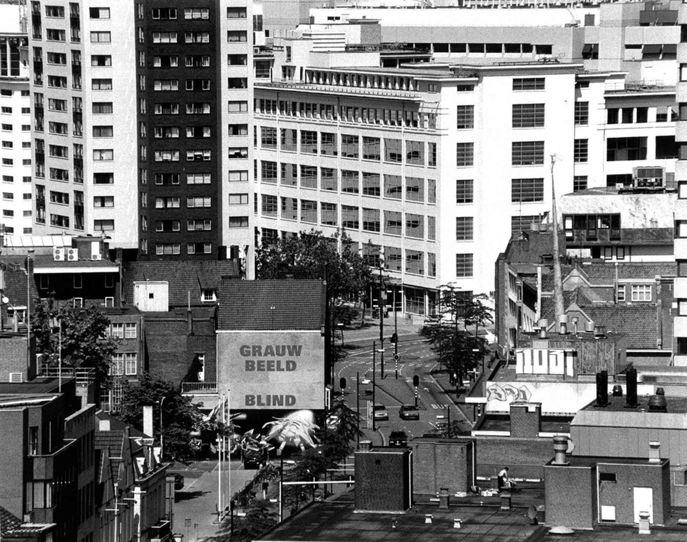 “Grauw Beeld Blind by Rémy Zaugg was painted as a mural on this building for the travaux publique project in 1996. Textual works of art have been created throughout the city for this exhibition of the van Abbe museum and Peninsula foundation.”