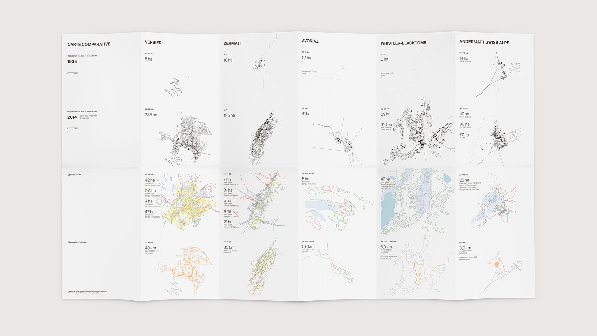 The editorial design and layout of the book have been done by Swiss architectural office CCHE. With their expertise in the field, they have developed a comparative system of data, diagrams, plans and maps to facilitate the understanding of the different cases studies while highlighting comments and results depicted. The entirety of the book is typeset exclusively with Suisse Int’l, using several weights.