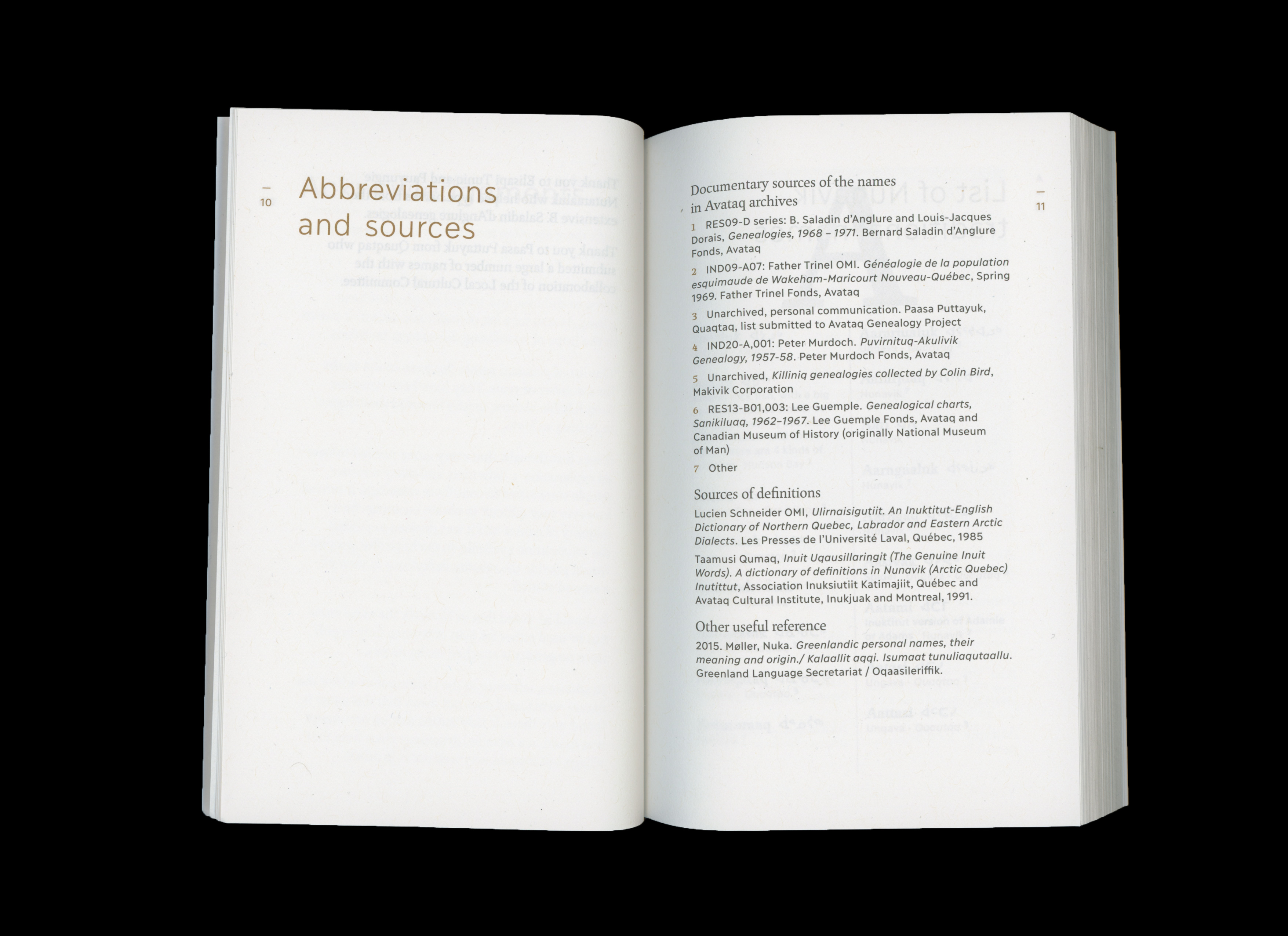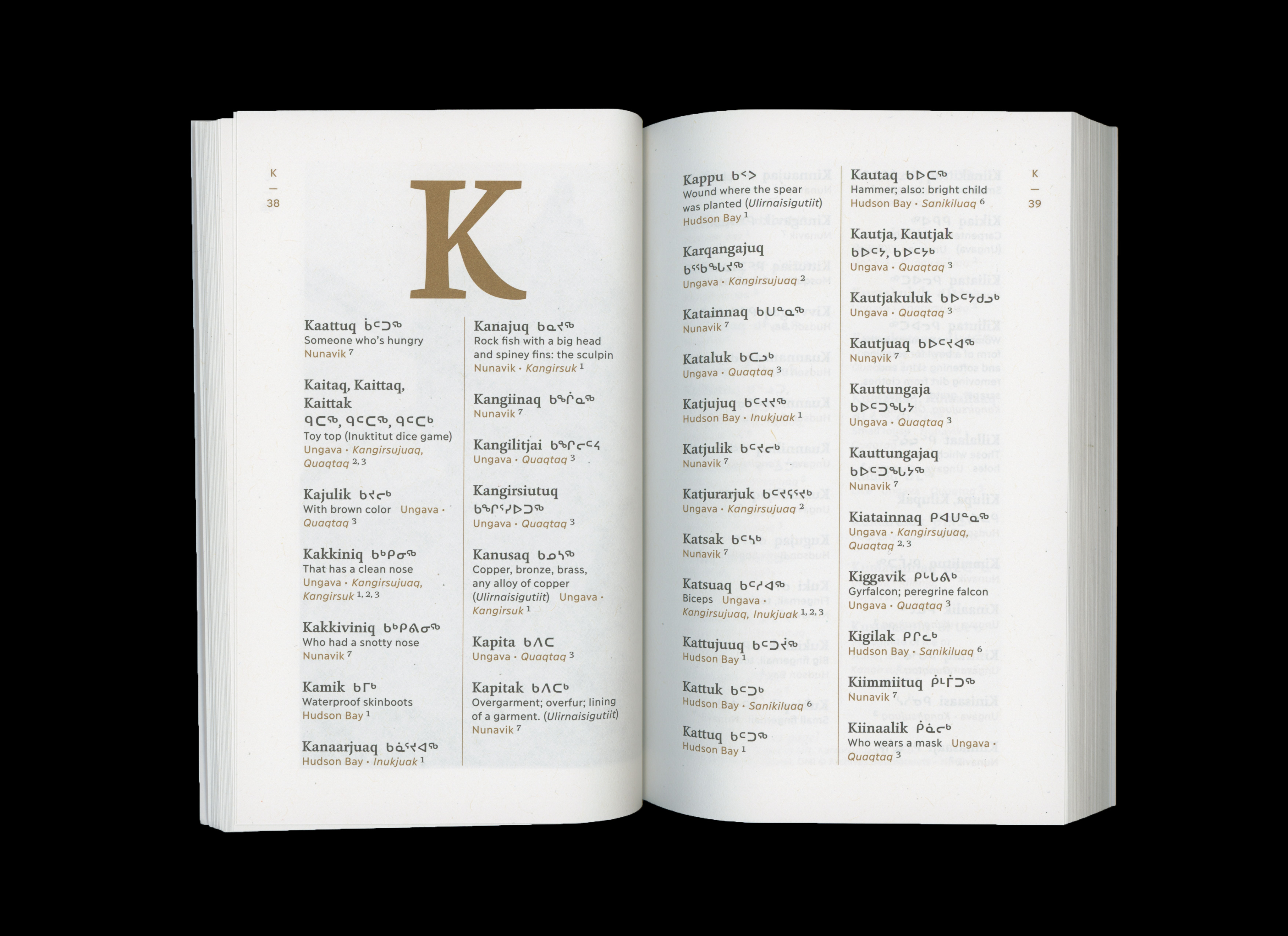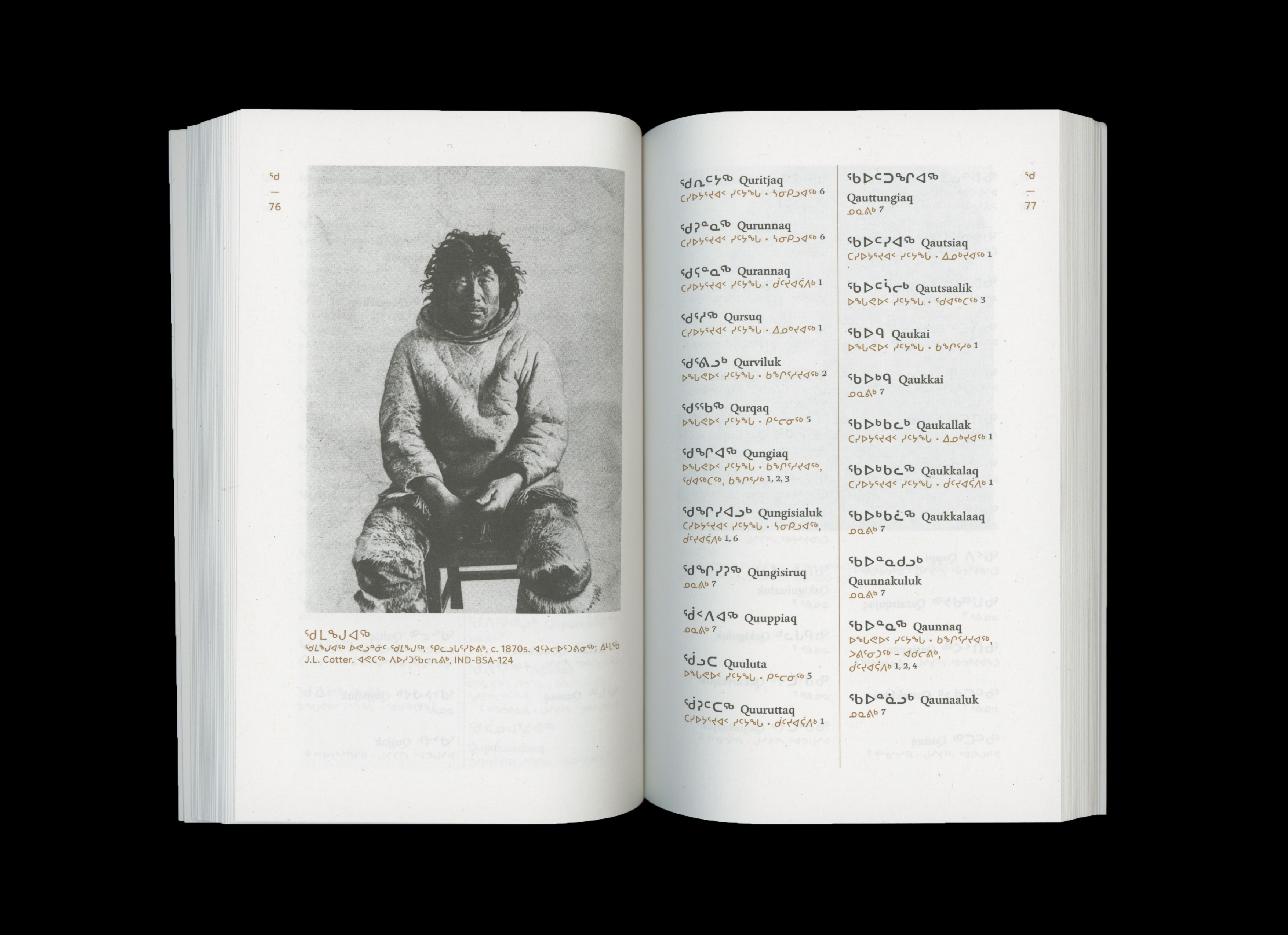 Cover and layout for this bilingual dictionary (English and Inuktitut) of traditional Inuktitut names, published by Publications Nunavik (Avataq Cultural Institute). Compiled by genealogist Martha Palliser, the reference work was designed as a bidirectional book, with the back cover showing the English version, and the interior printed in two spot colors.