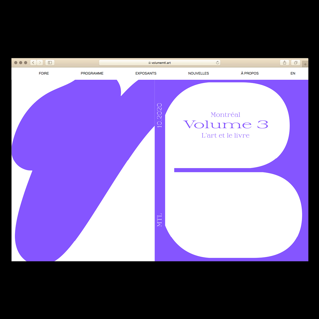 Volume MTL: Art and the Book is Montreal’s annual celebration of art publishing and artists’ book. The visuals developed for Volume 3 were first conceived for the website. Imagined as a book layout, the homepage evokes a full flat cover with its title on the front, the spine, and the back. The glyphs V and 3, used as a logotype for the event, adorn the cover as an abstract background.