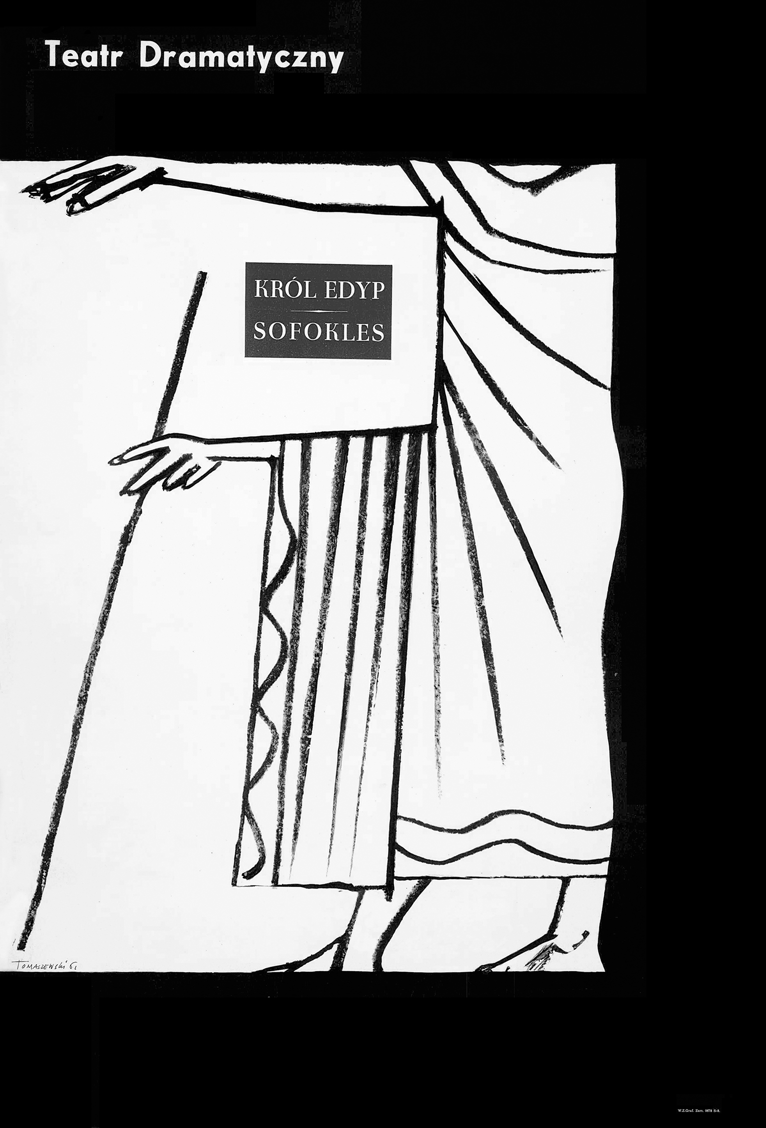 Though Polish pioneer Henryk Tomaszewski (1914–2005) may well go down in history as one of the great masters of the hand-lettered poster, he never shied from using “regular” typefaces when appropriate. In this remarkable design advertising a 1961 performance of Sophocles’ tragedy Oedipus Rex at Warsaw’s Teatr Dramatyczny, he chose two typefaces from the local Jan Idźkowski typefoundry, Paneuropa (the bold weight, for the theater’s name) and Adam Półtawski’s Antykwa Półtawskiego (the central panel) in all caps.