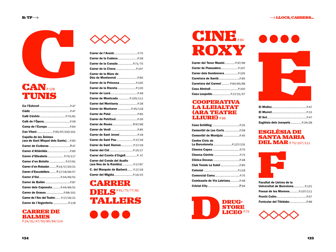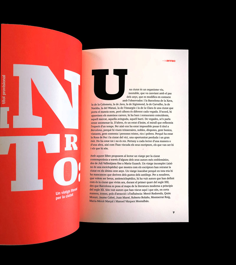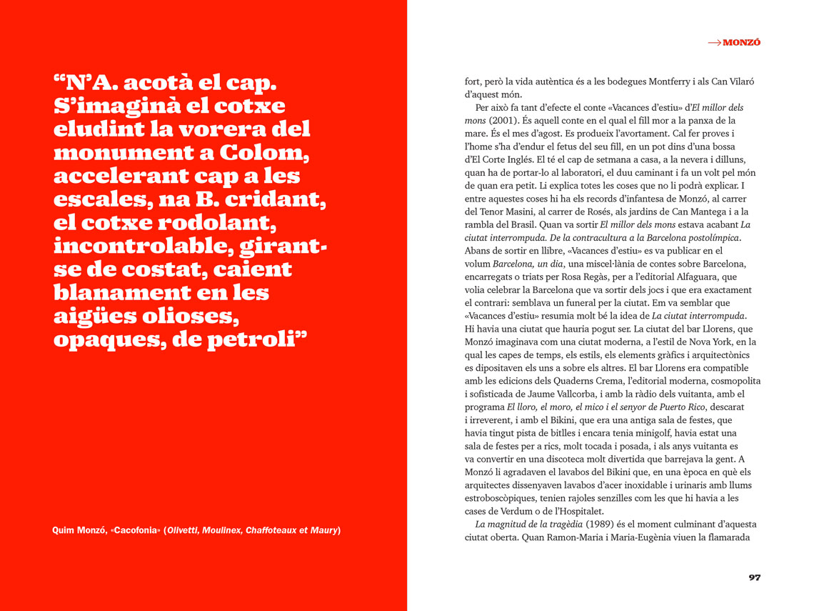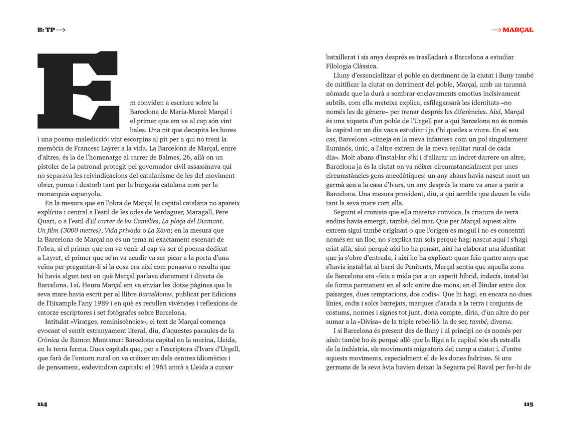 It includes the profiles of eight authors who have left an imprint on the city: Mercè Rodoreda, Jaume Cabré, Manuel Vázquez Montalbán, Roberto Bolaño, Juan Marsé, Quim Monzó, Montserrat Roig, and Maria Mercè Marçal. Argentinian art director Diego Piccininno was also in charge of the book design.