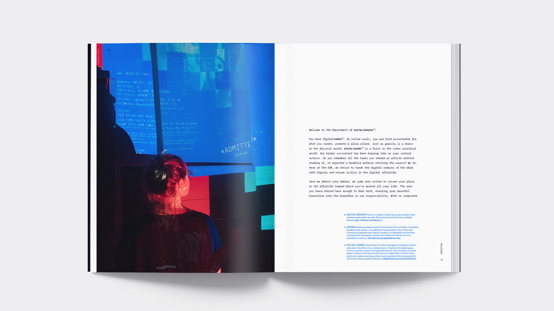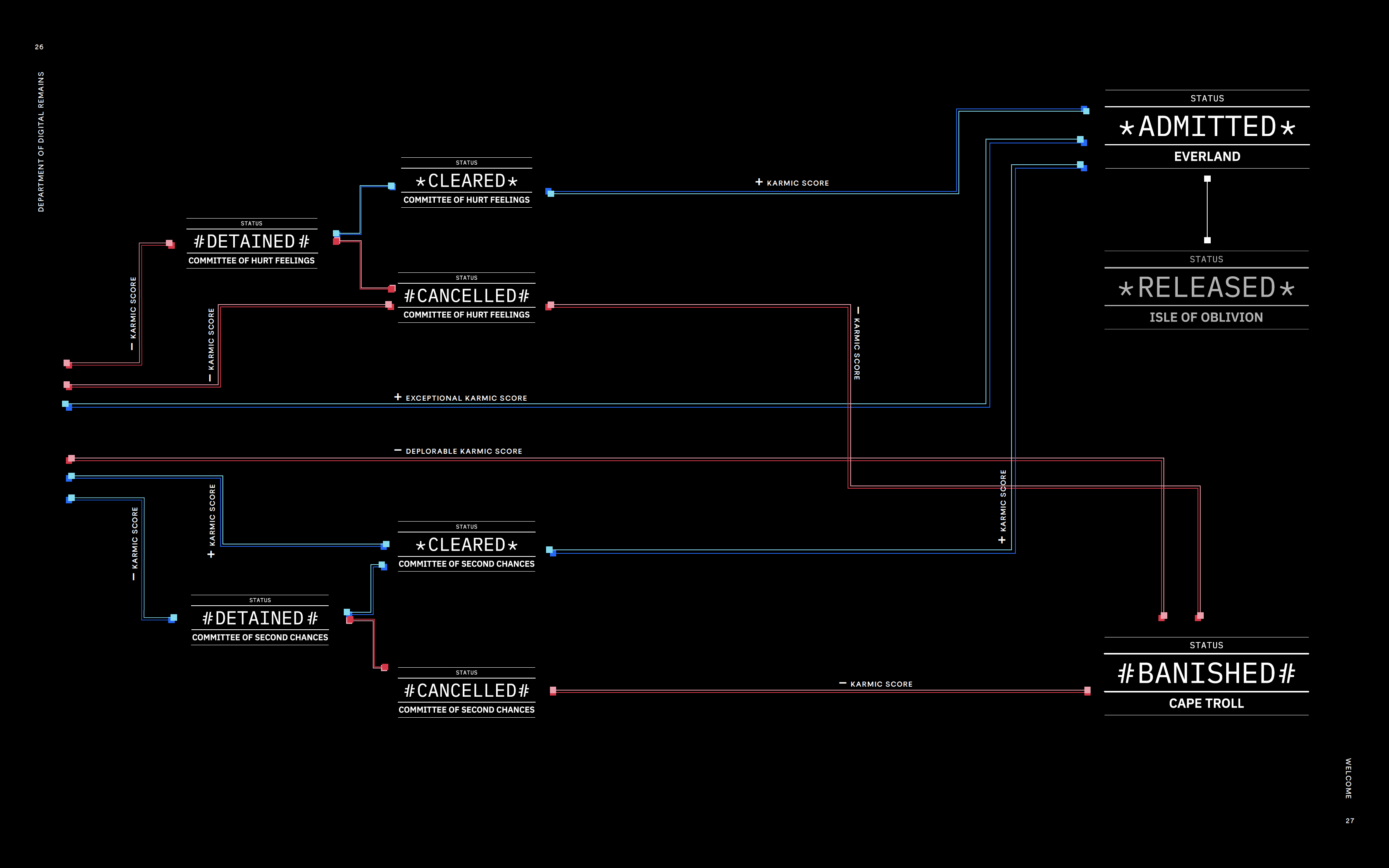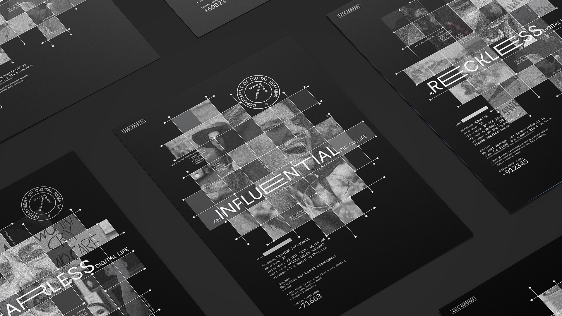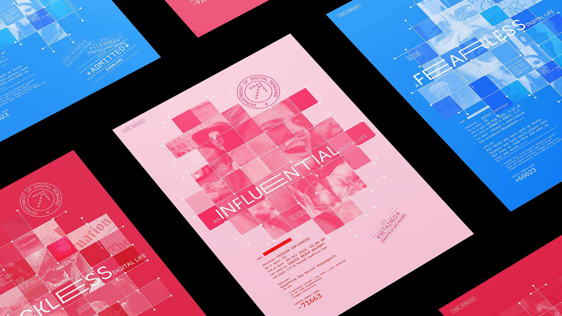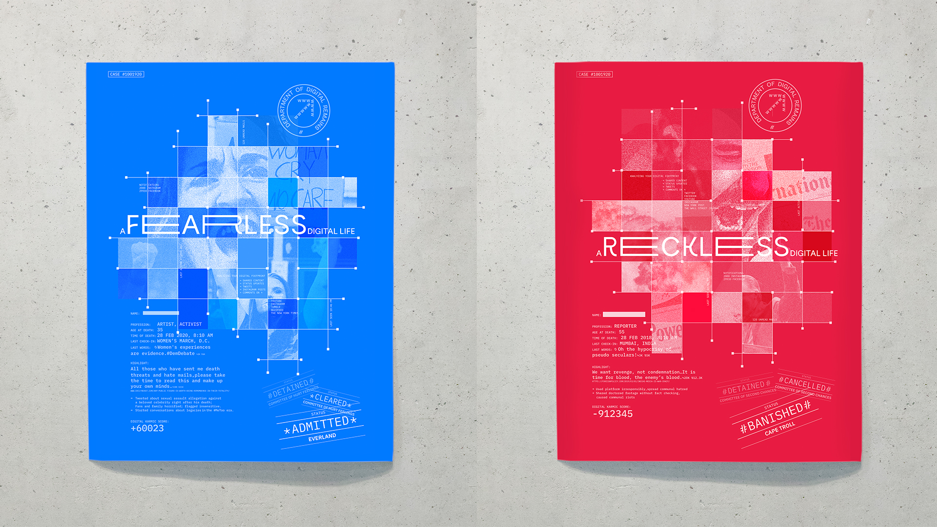 The Department of Digital Remains is a fictional federal agency that keeps a tab on all your virtual actions which will determine your fate in the digital afterlife. This is my thesis project for the Maryland Institute College of Art.