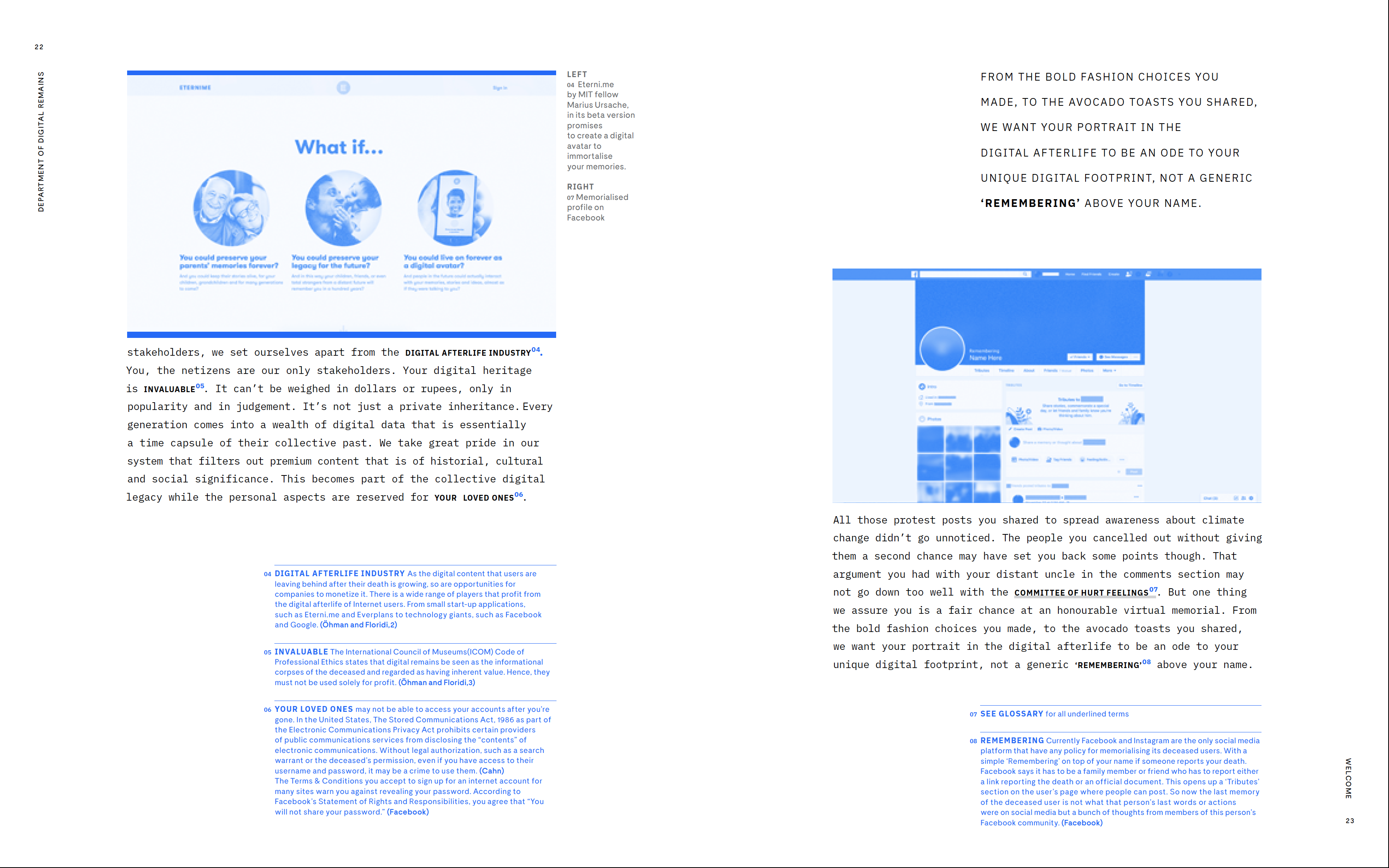 In an age of immortal digital presences, this is a speculative look at what happens to our online selves after we die. This project uses design fiction to examine digital lives through the lens of digital death while trying to answer the question: If we have found ways to treat physical remains of the departed with dignity, why not digital remains?